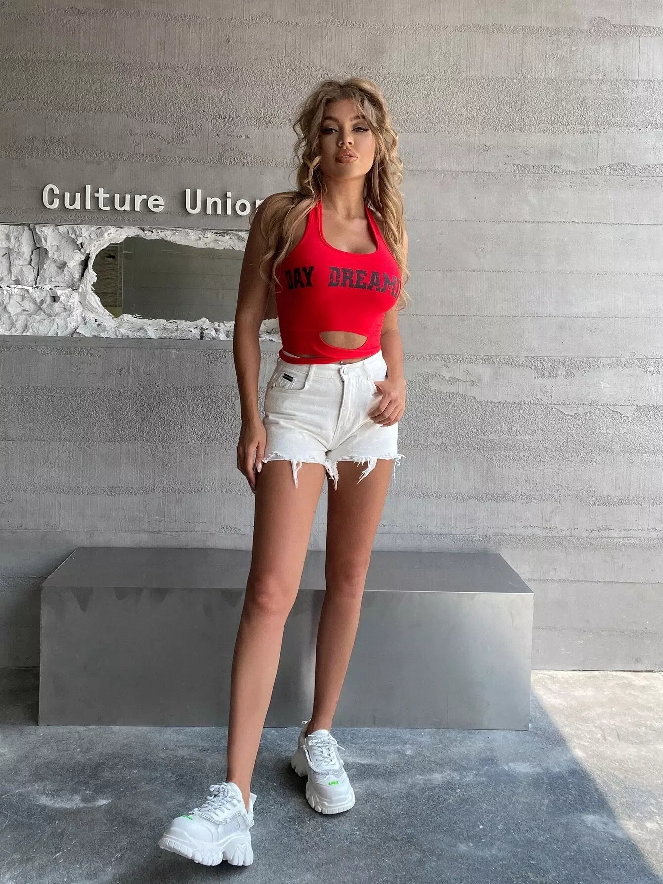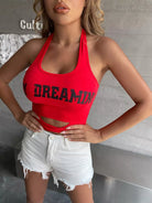 بلوزة قصيرة بياقة قصيرة بياقة قصيرة بفتحة من الخلف وربطة عنق مقصوصة بحروف
