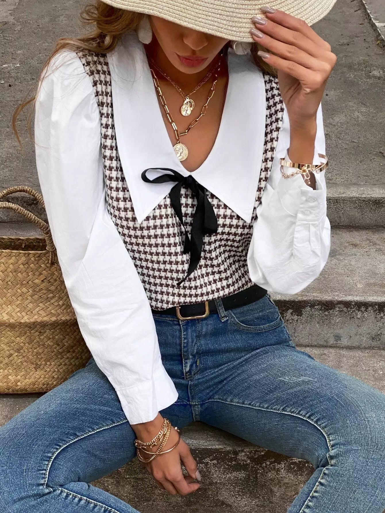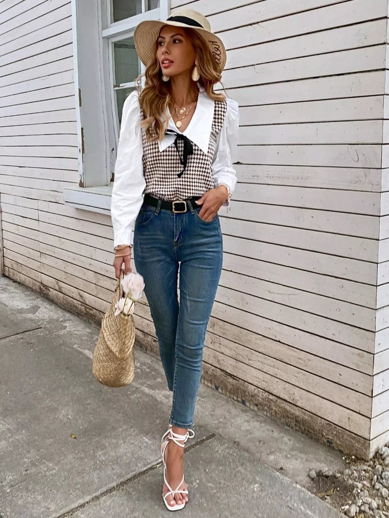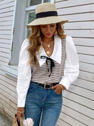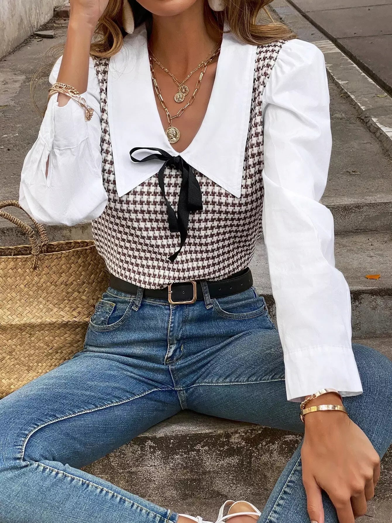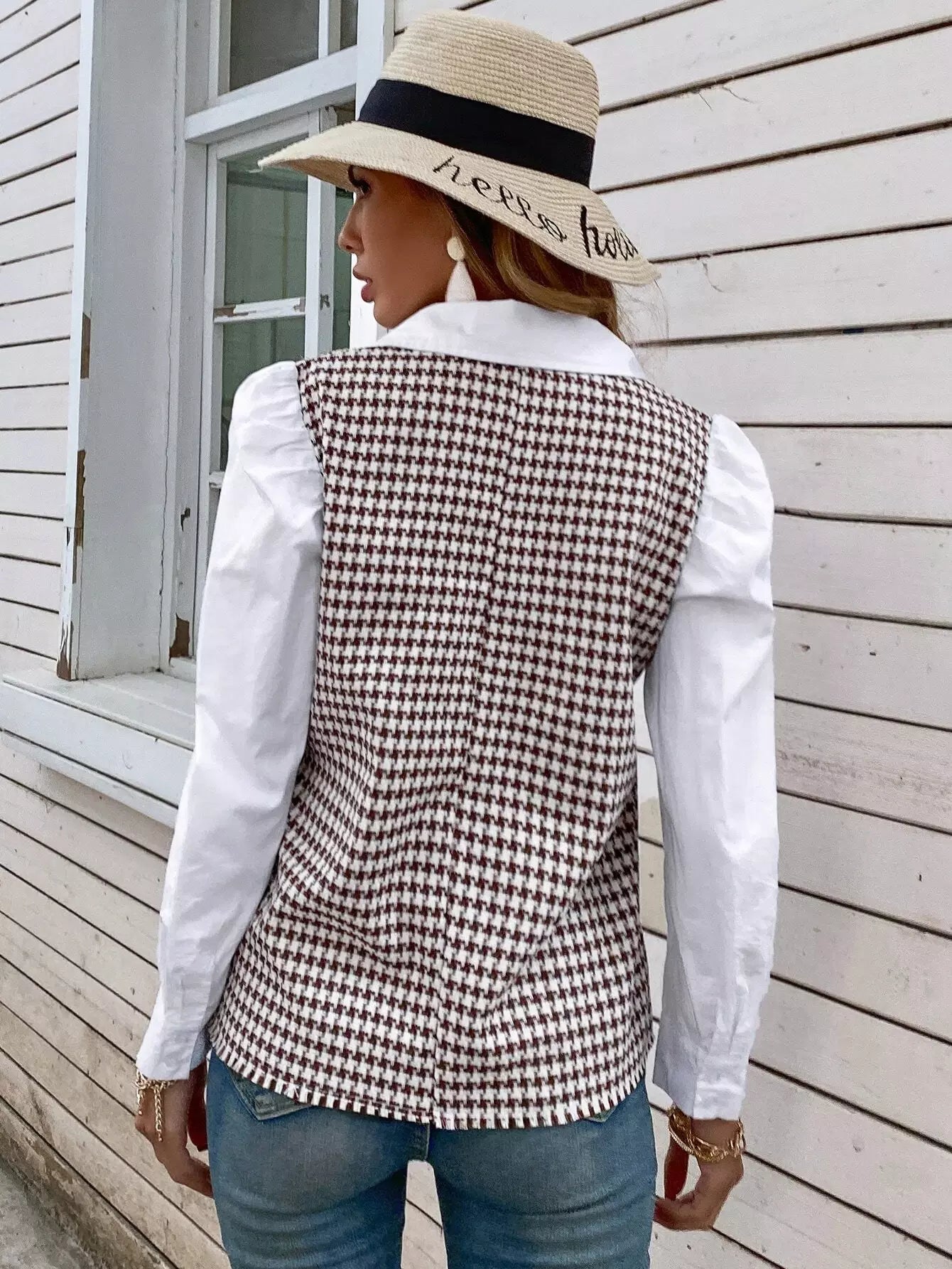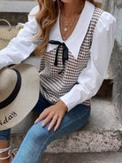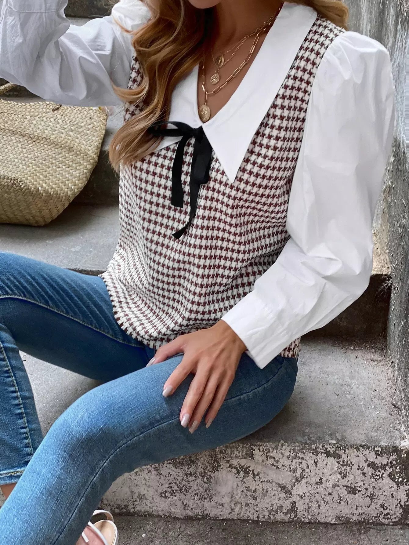 بلوزة بأكمام بطبعة هاوندستوث بأكمام متباينة