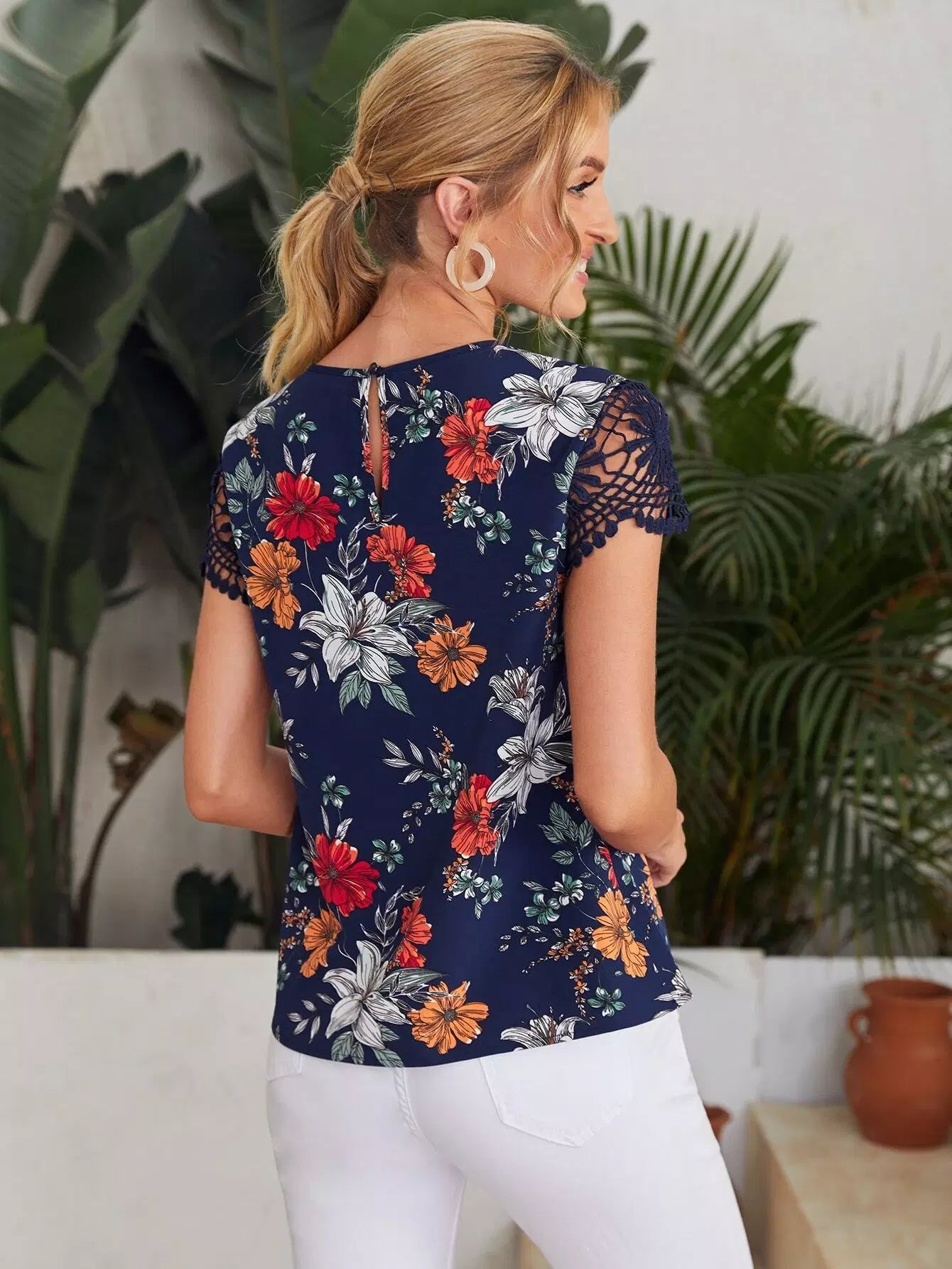 بلوزة زهرية بأكمام من الدانتيل وفتحة رقبة على شكل فتحة مفتاح