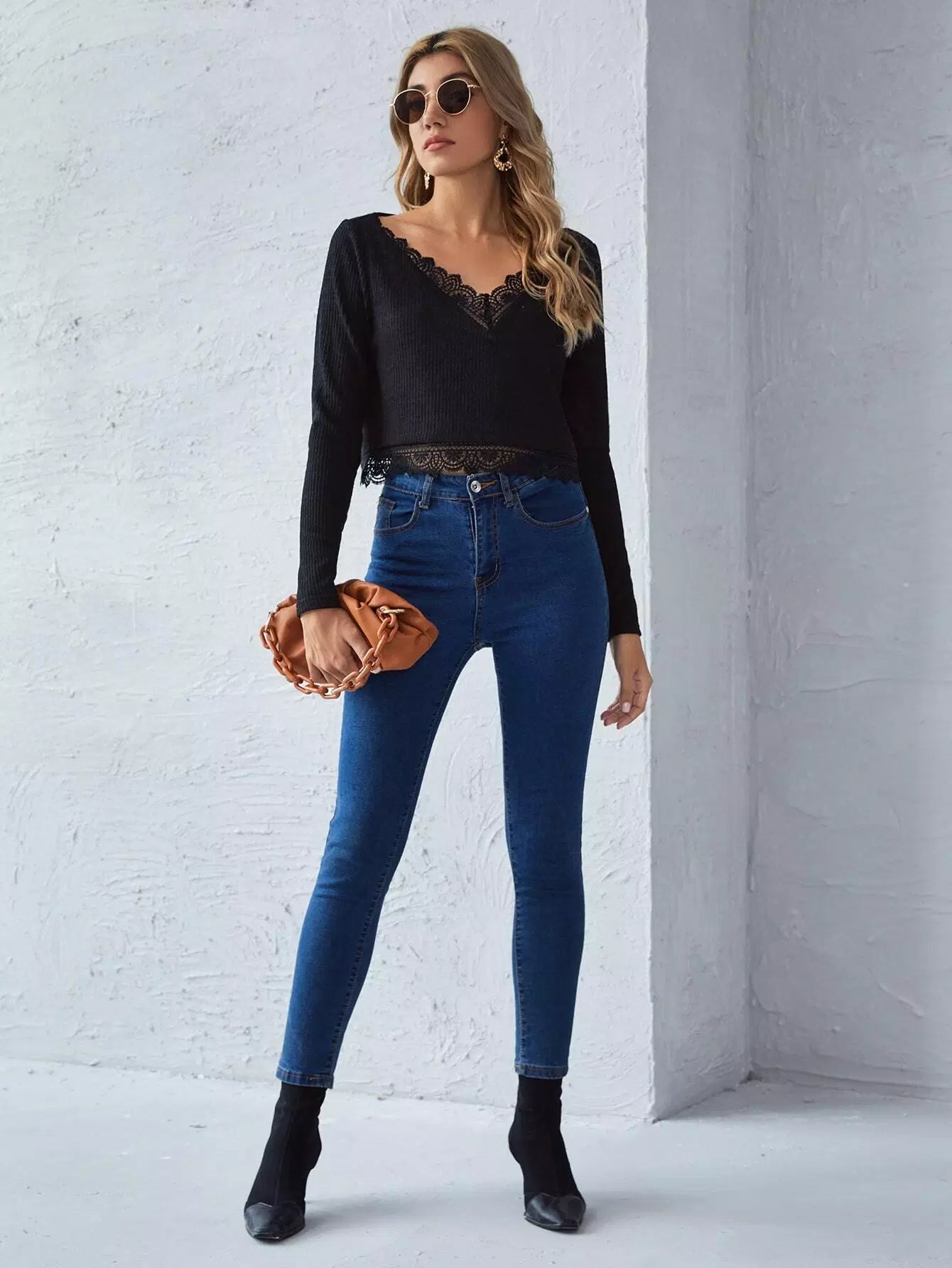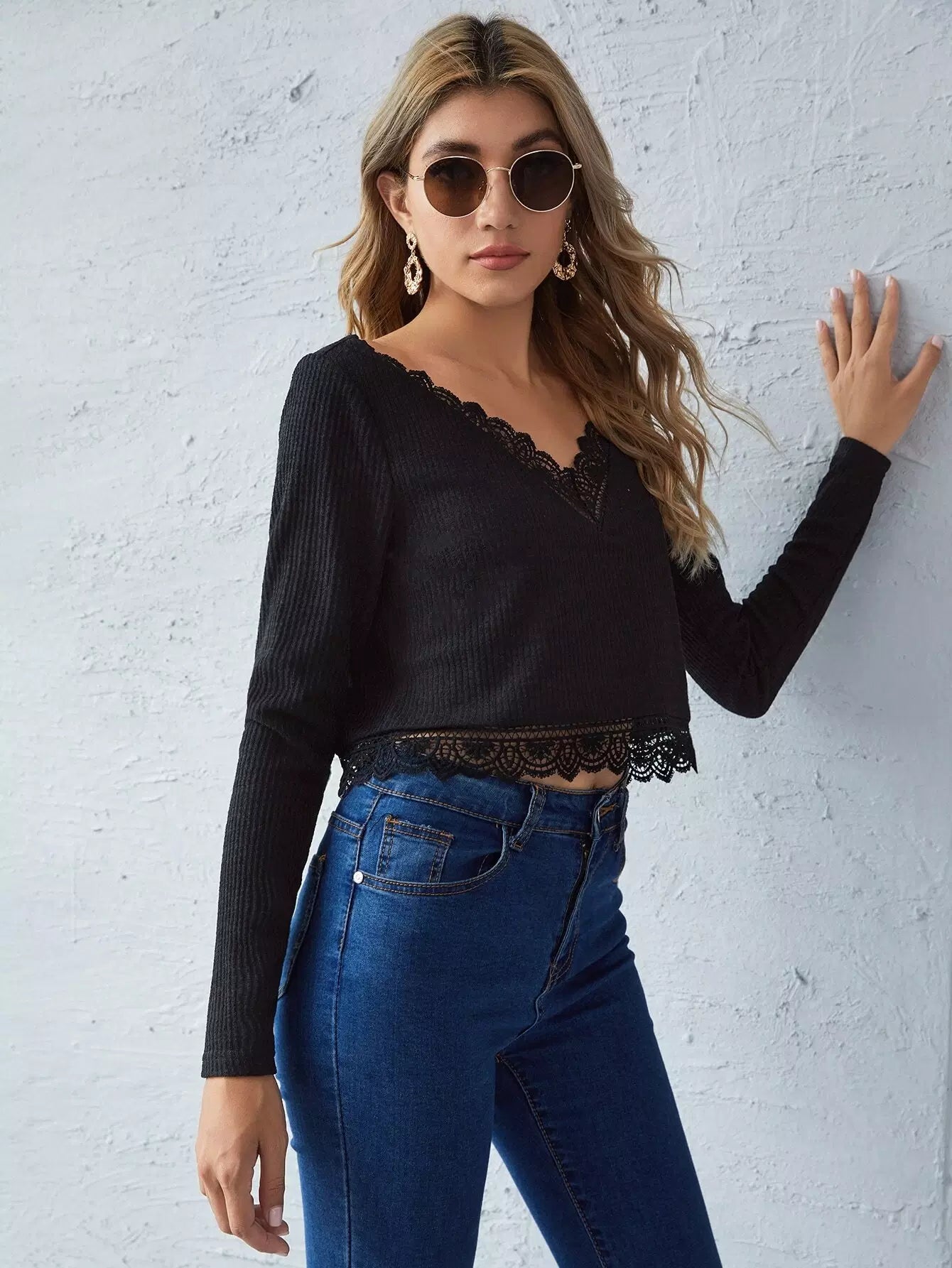 تي شيرت قصير محبوك مضلع ومضلع ومزخرف من الدانتيل