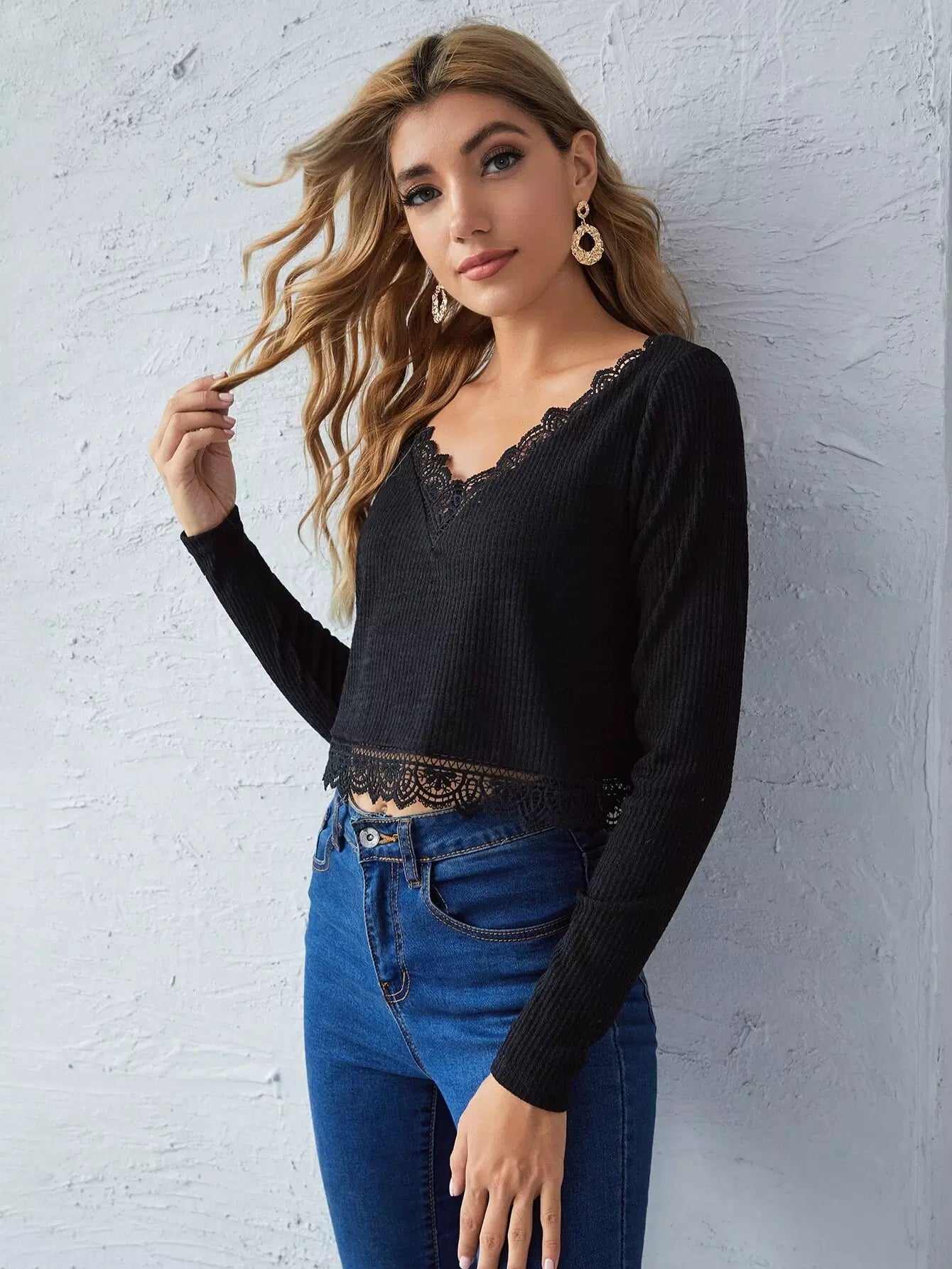 للنساء - تي شيرت قصير محبوك ومضلع بتفاصيل دانتيل