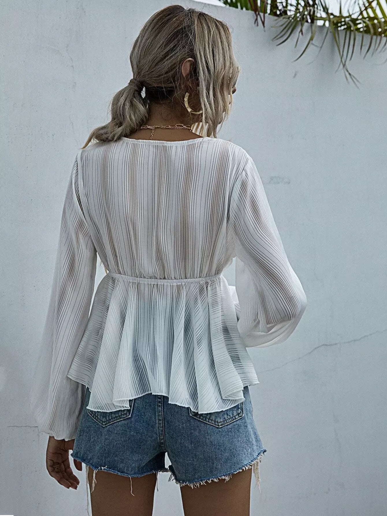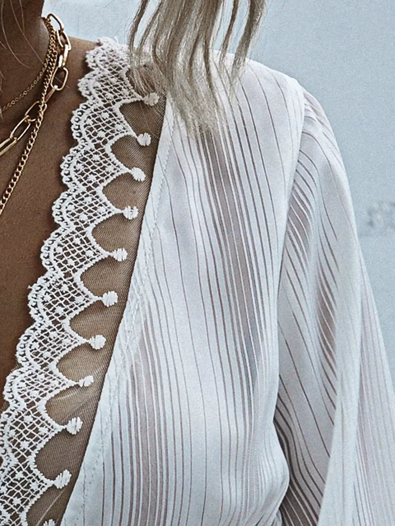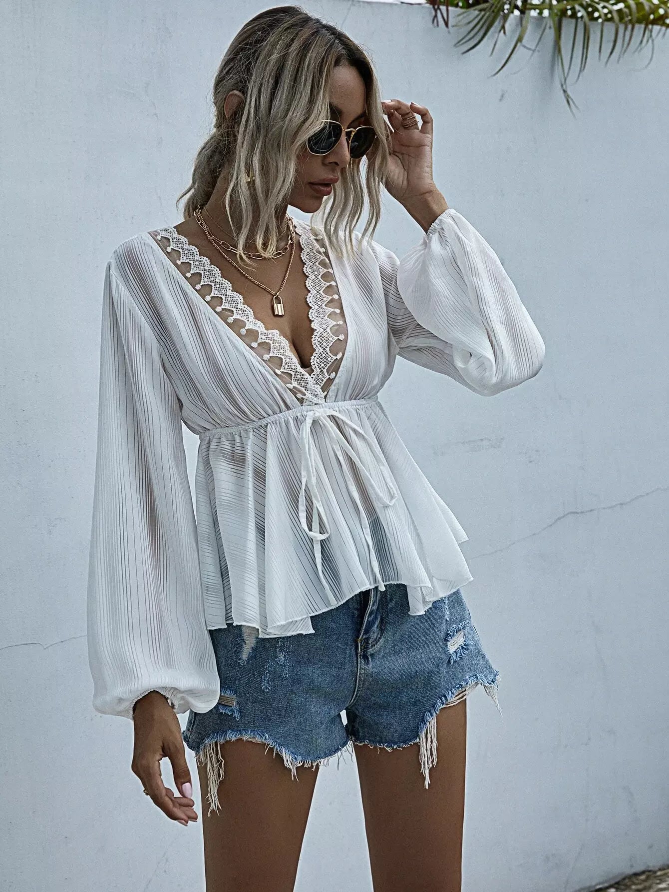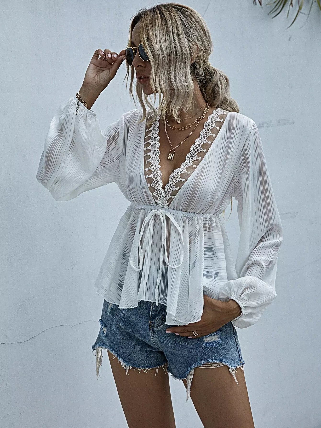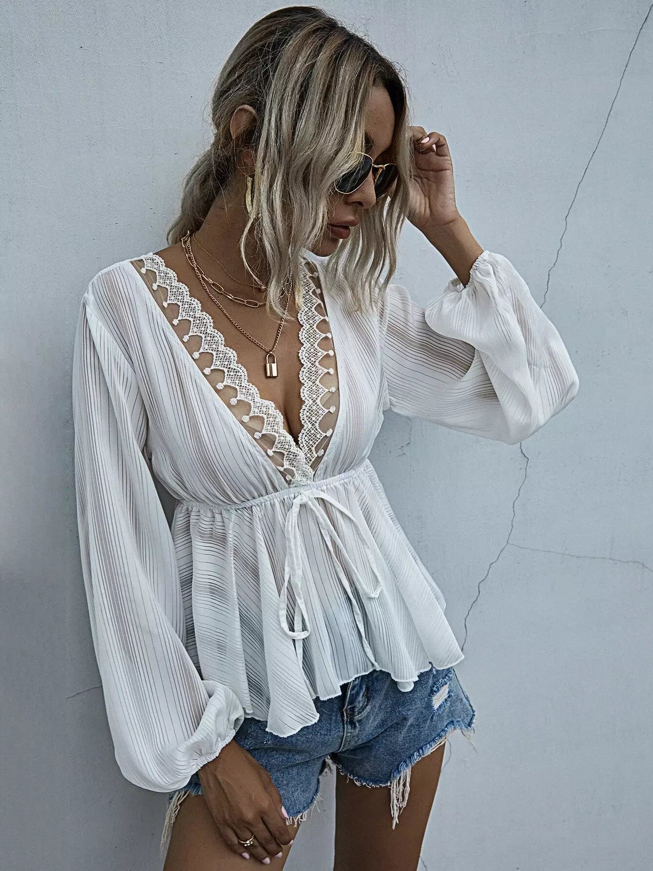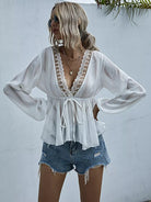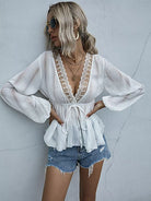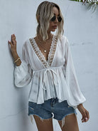 بلوزة من الدانتيل بحواف من الدانتيل بعقدة أمامية من الأمام