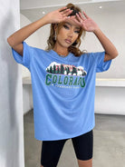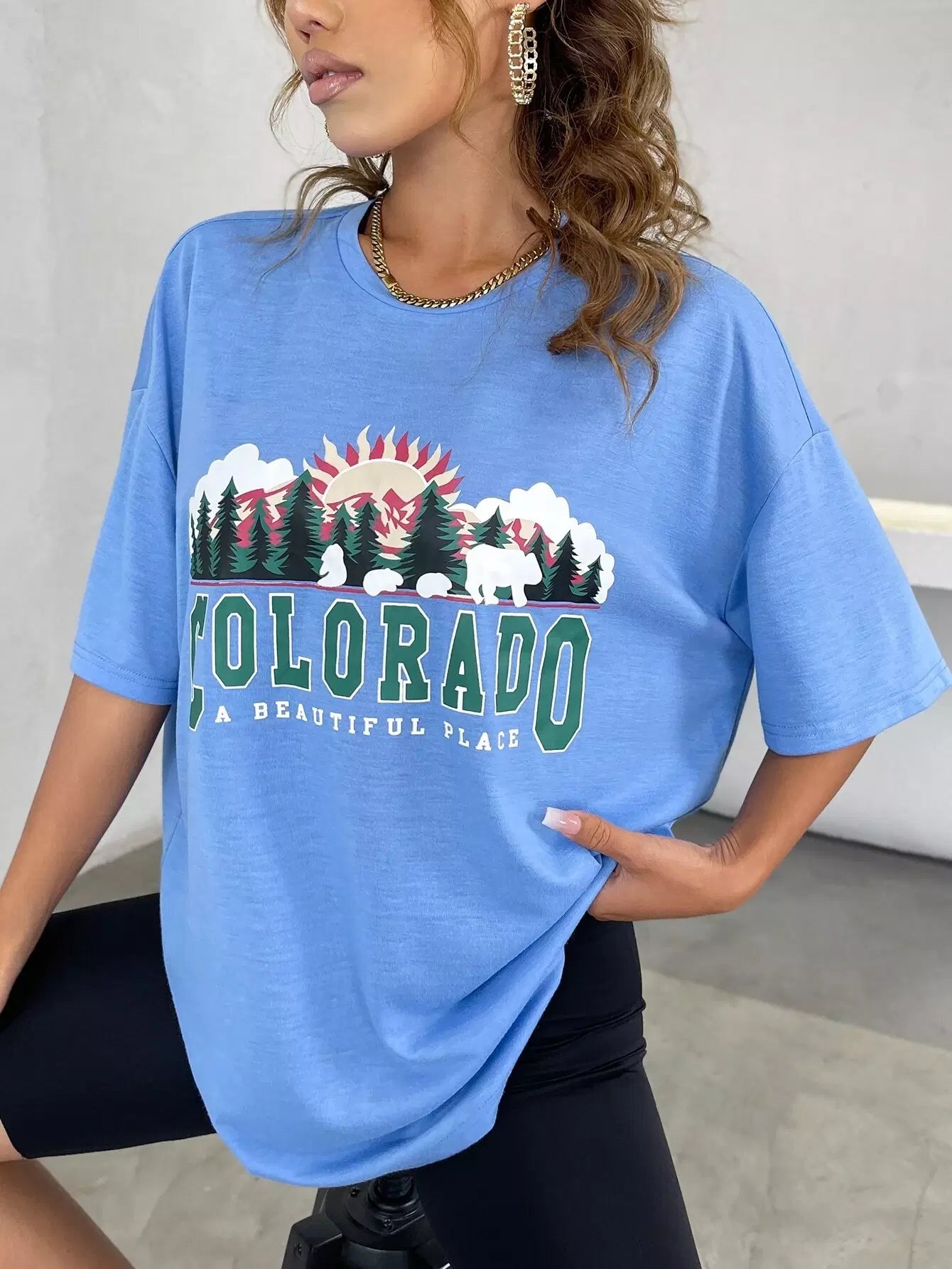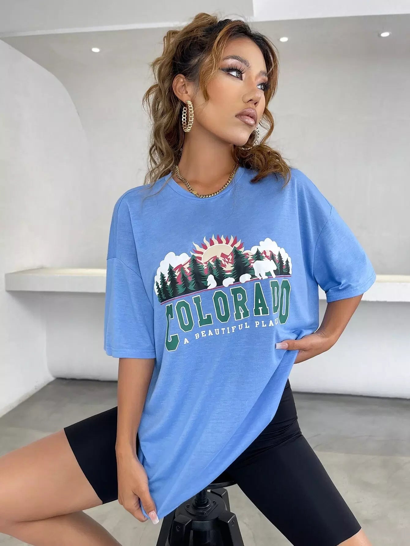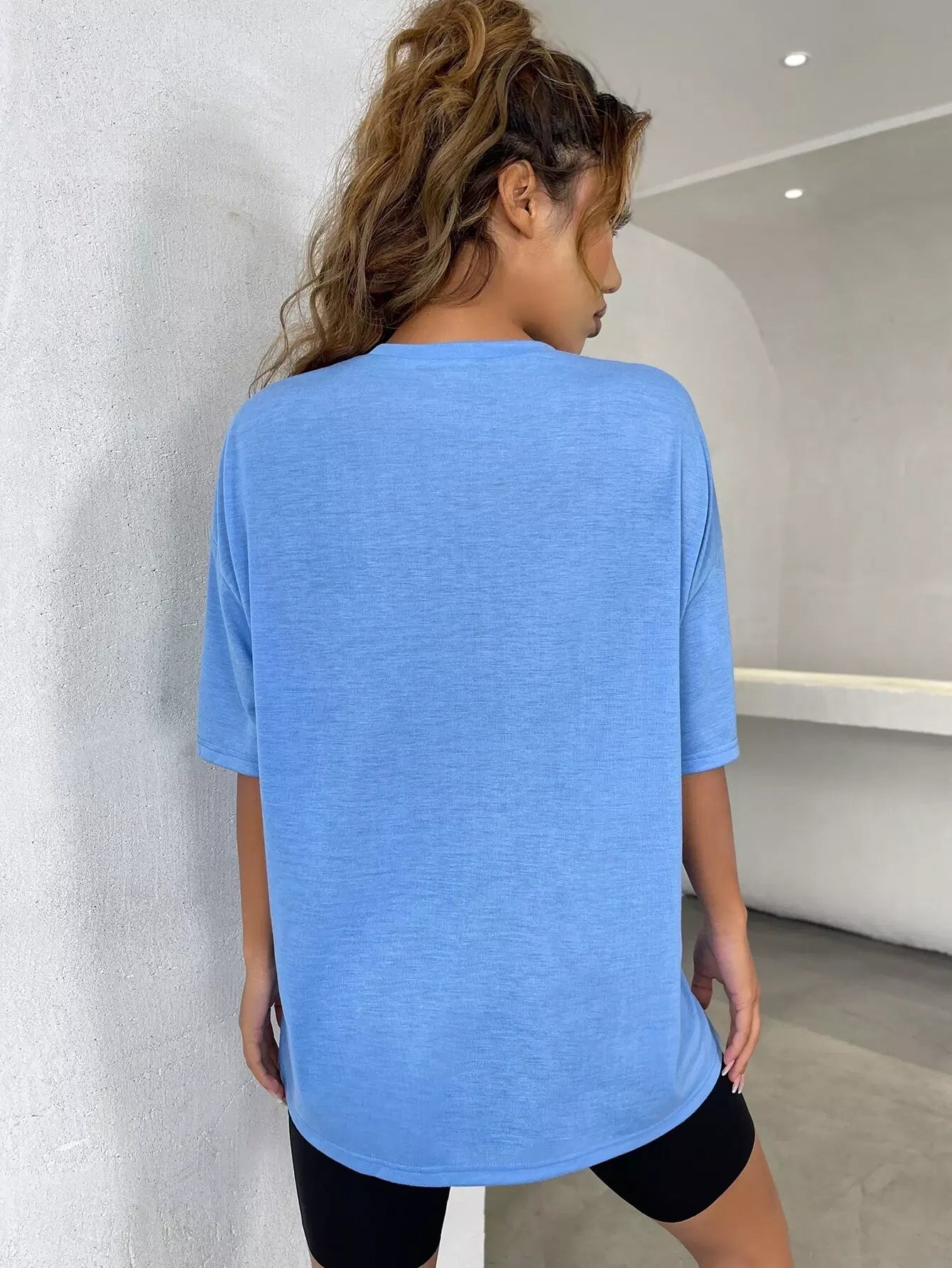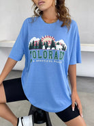 تي شيرت بتصميم منسدل الكتف بتصميم منسدل جرافيك وشعار