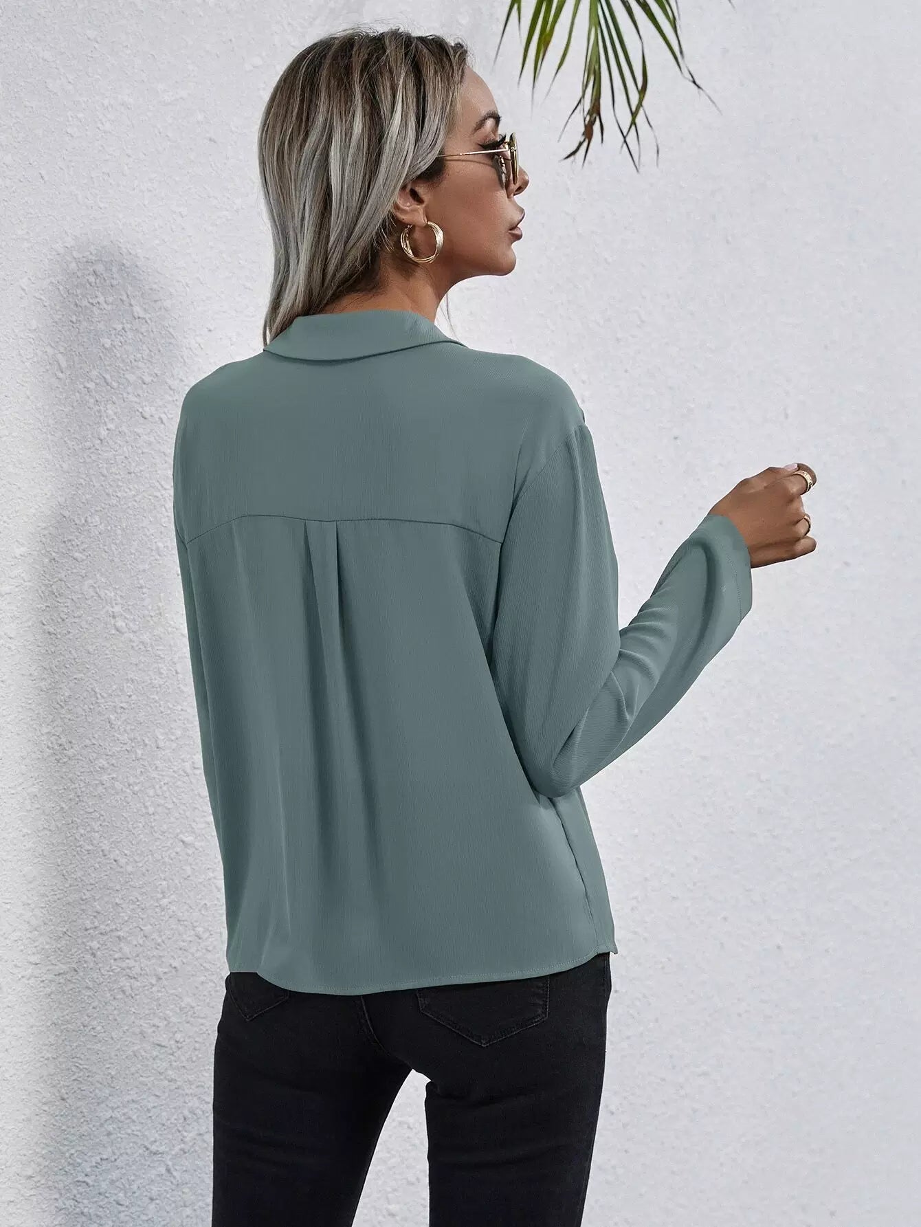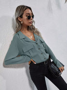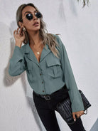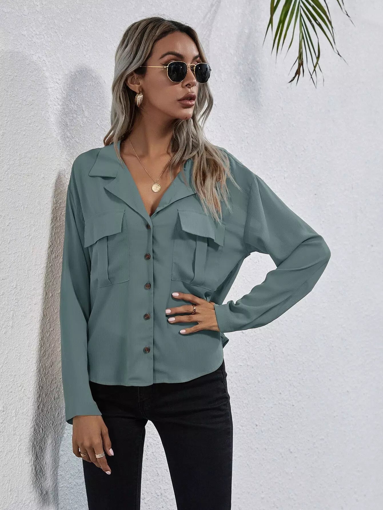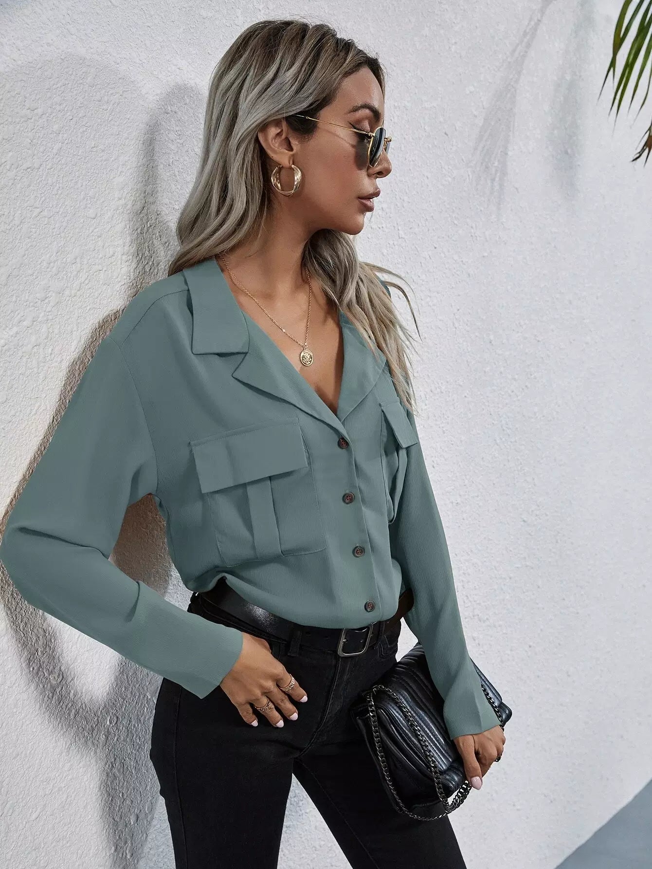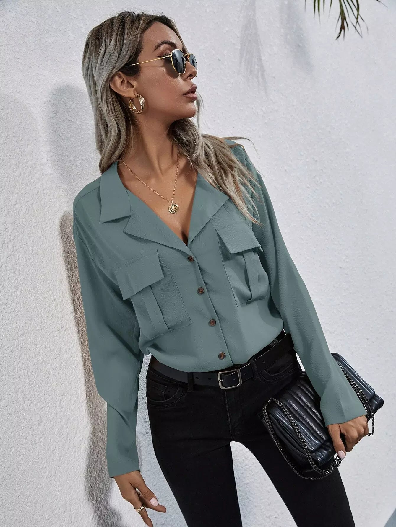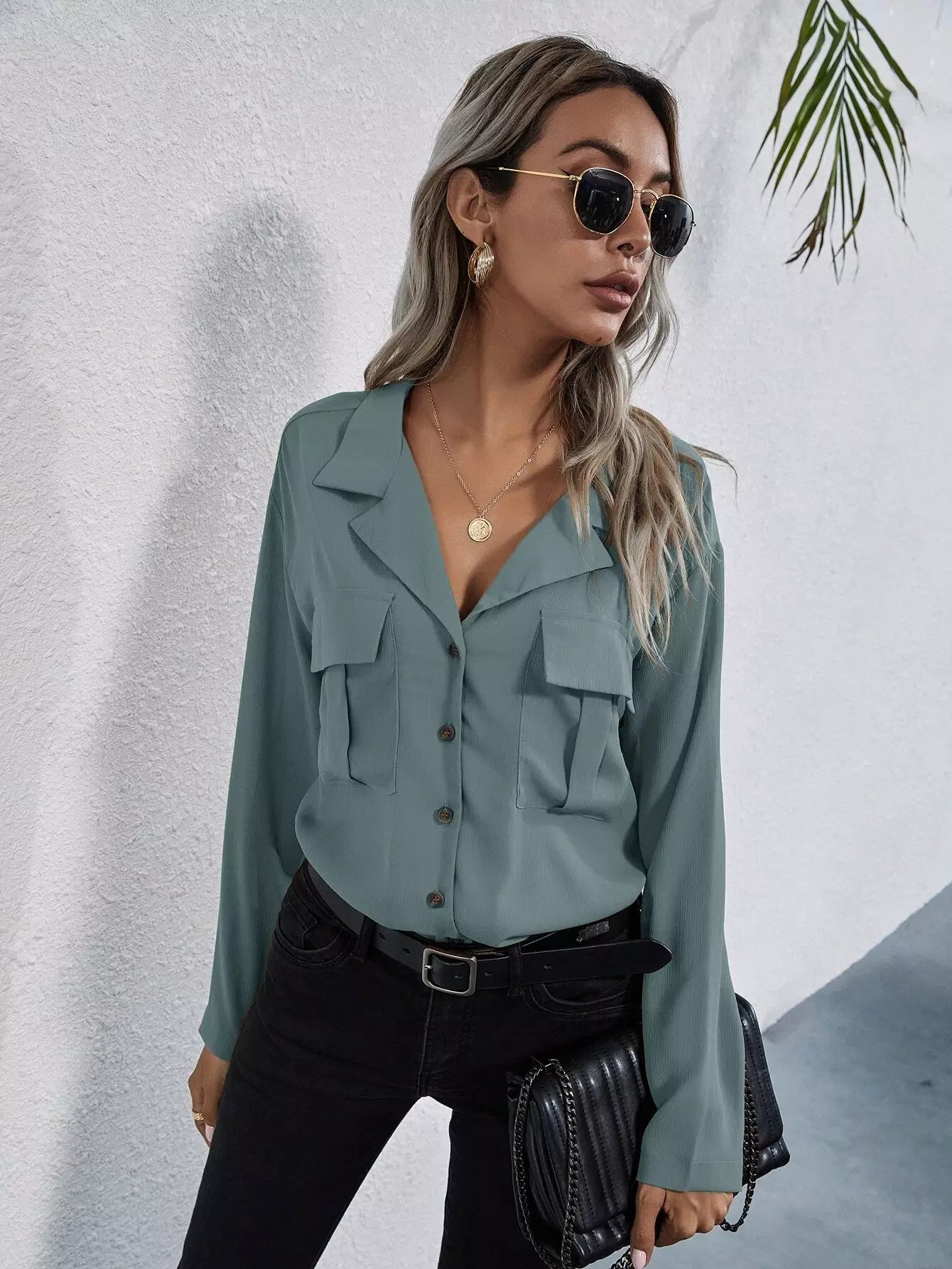 بلوزة بياقة بياقة على الرقبة وجيب بغطاء جيب بأزرار أمامية