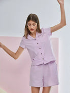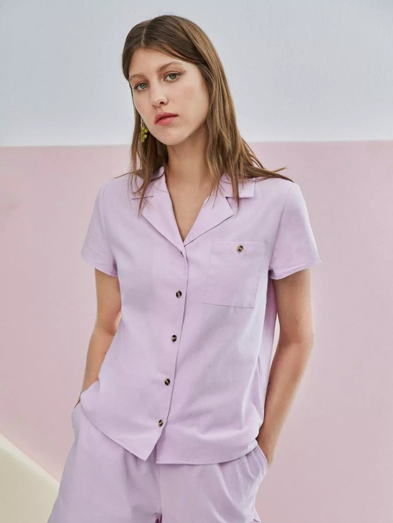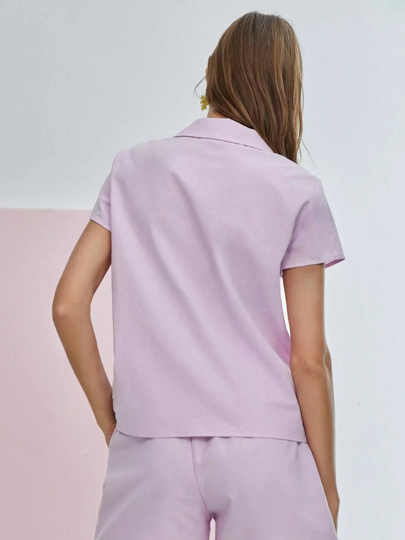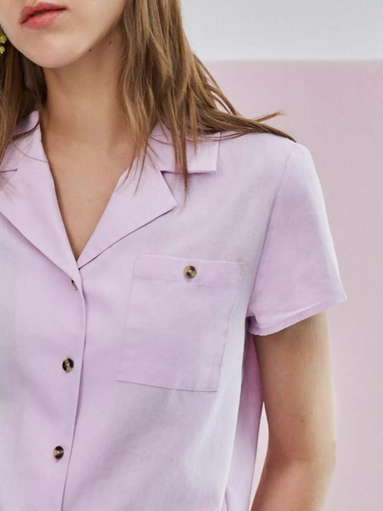بلوزة سادة ذات ياقة مطوية وجيب رقعة