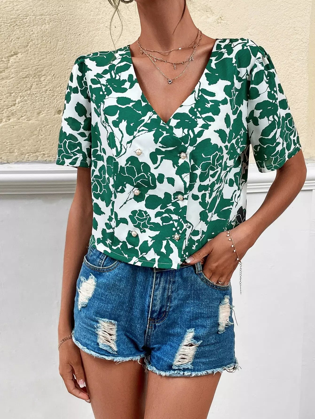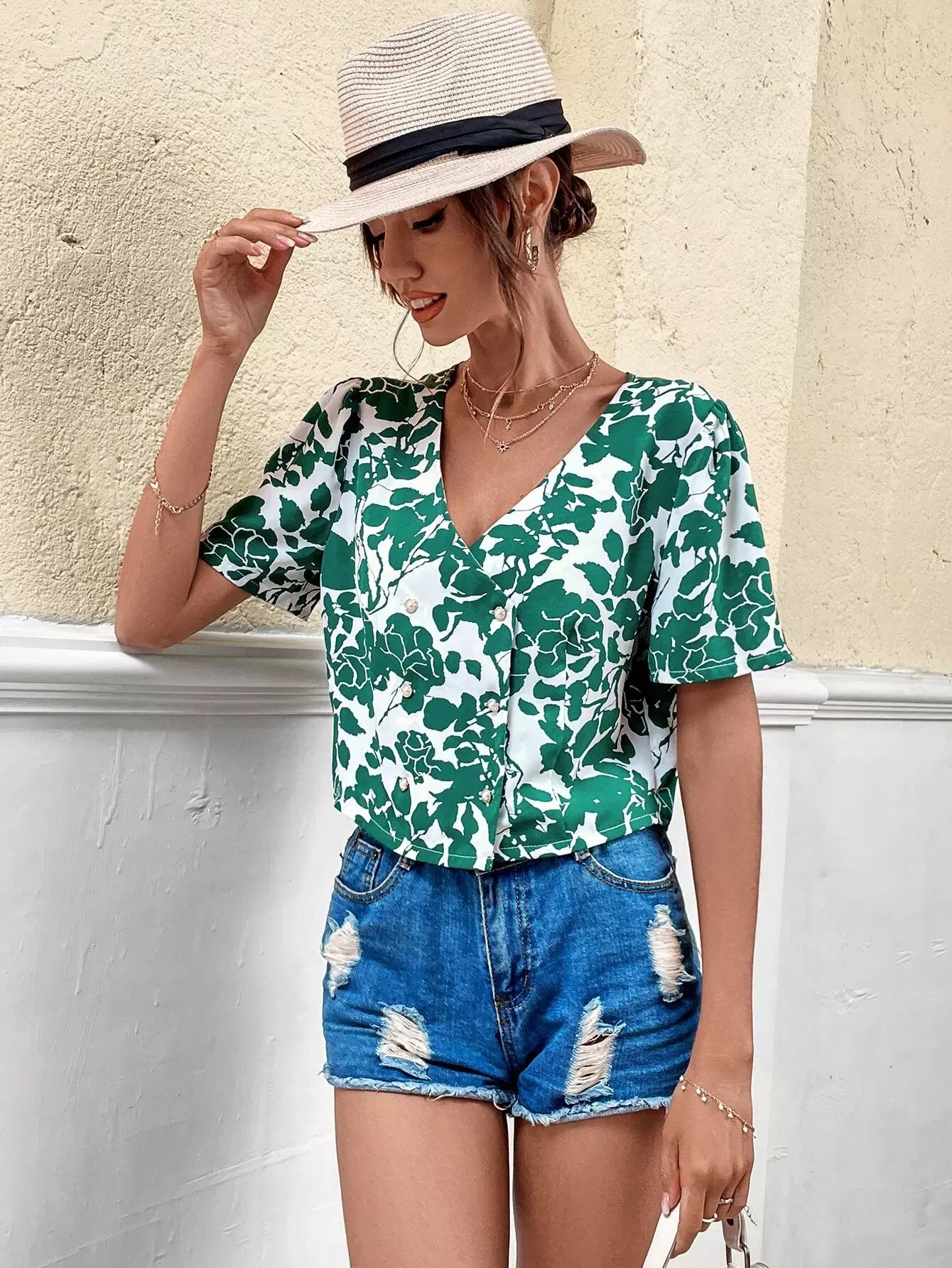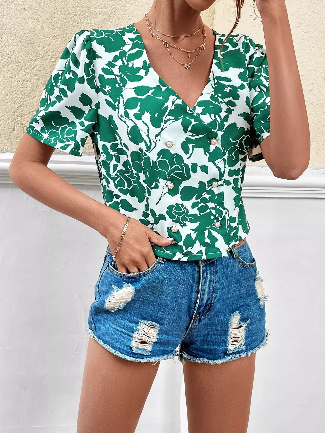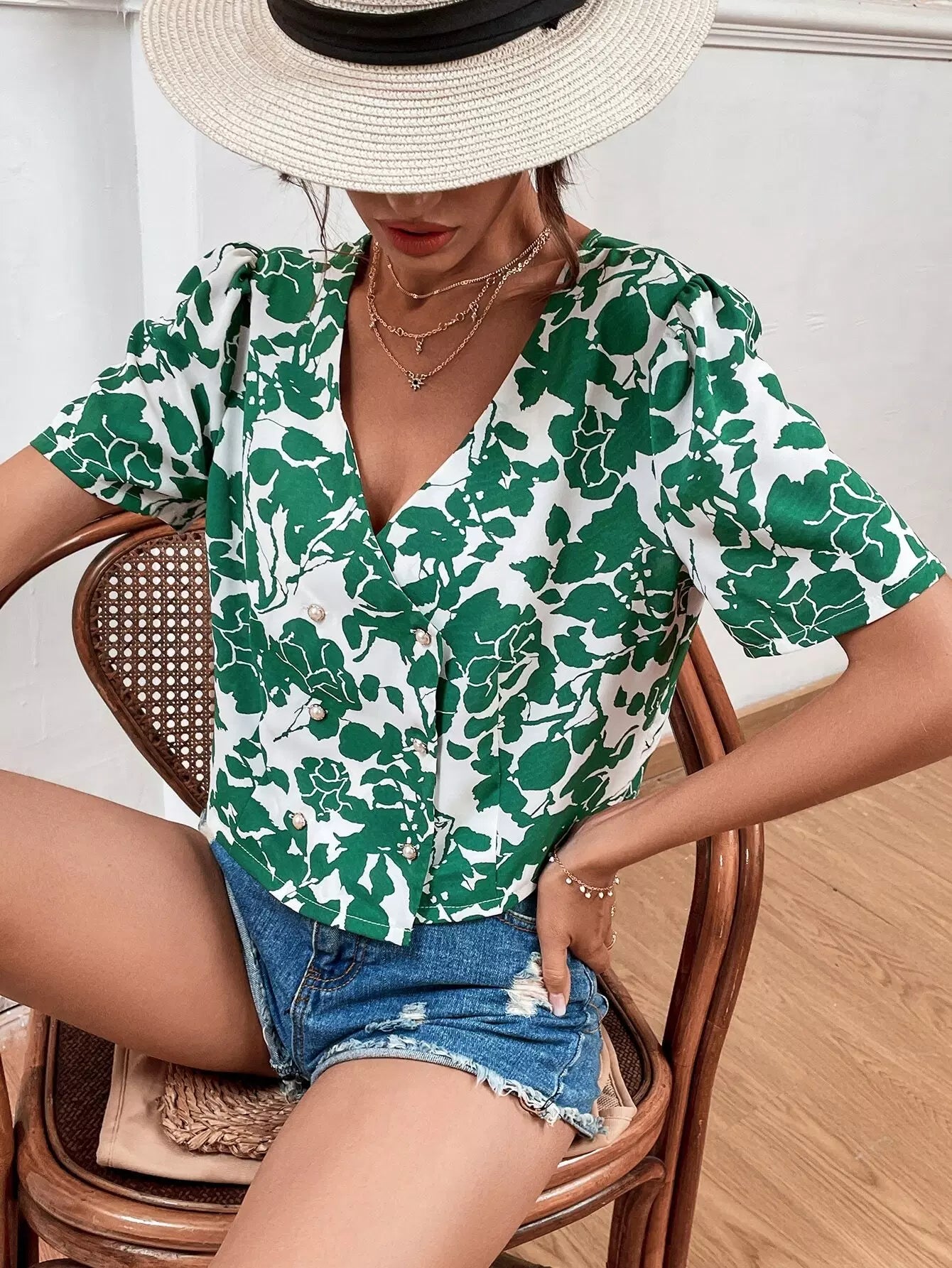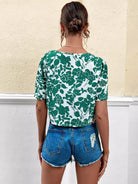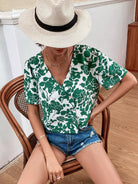 بلوزة بأكمام منفوشة بطبعة أوراق الشجر بياقة على شكل V