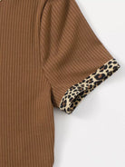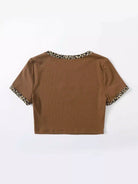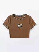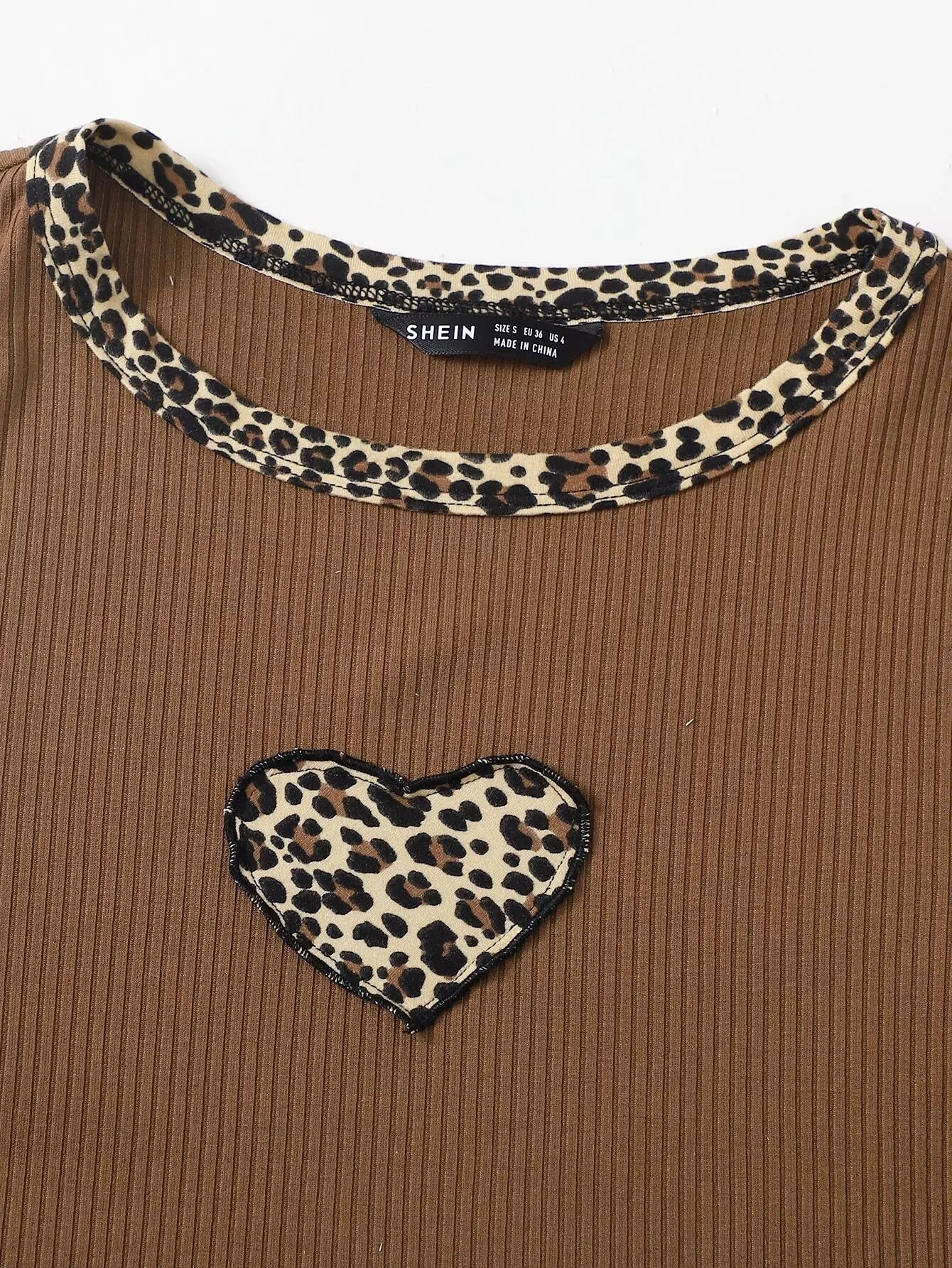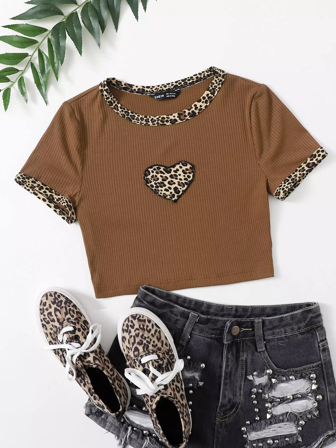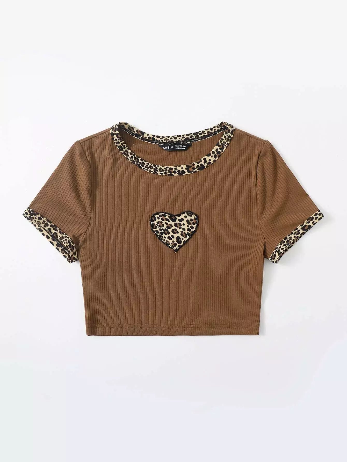 تي شيرت قصير من نسيج مضلع مزين بنقشة جلد النمر على شكل قلب
