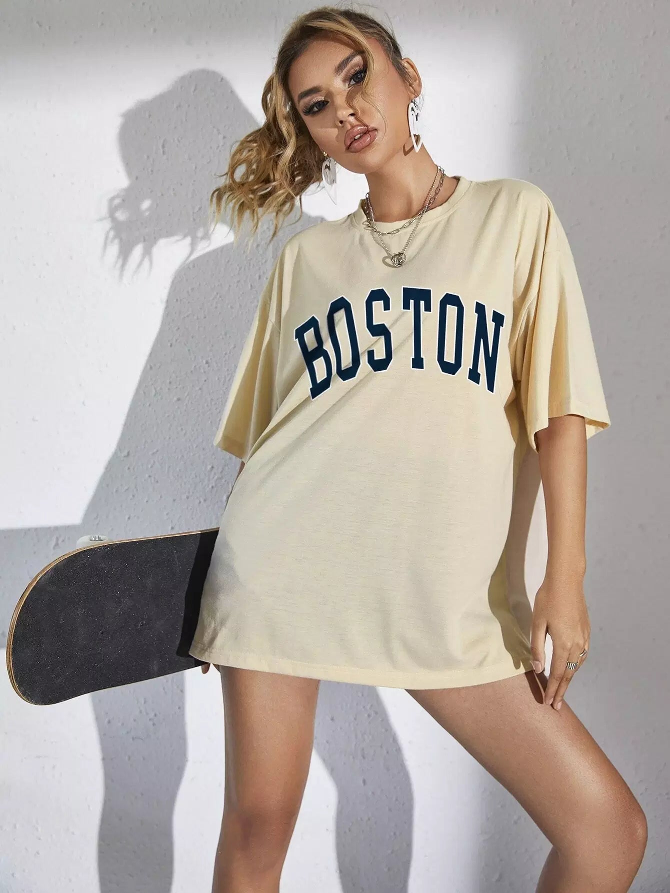 تي شيرت منسدل الكتف برسومات على شكل حرف