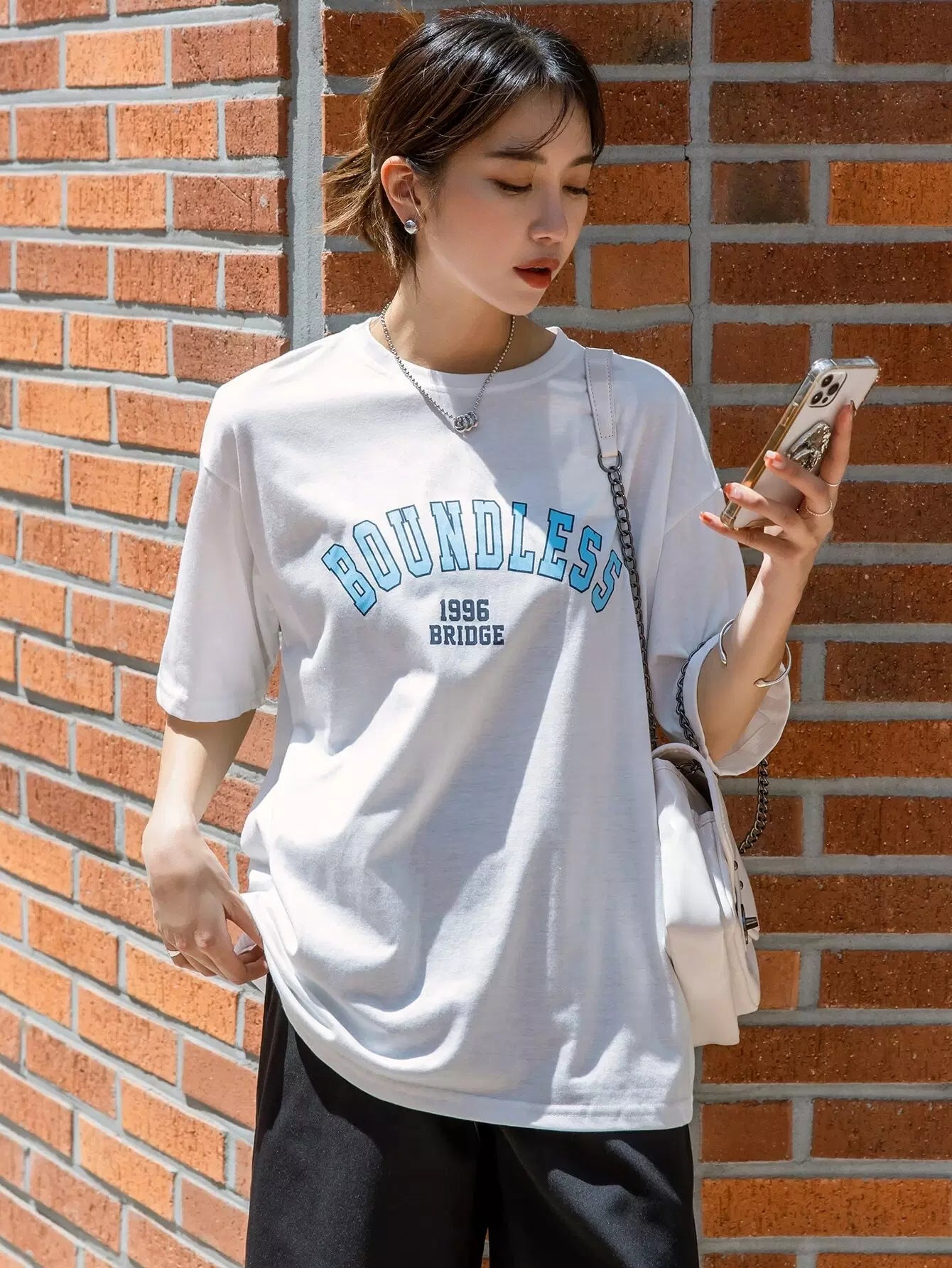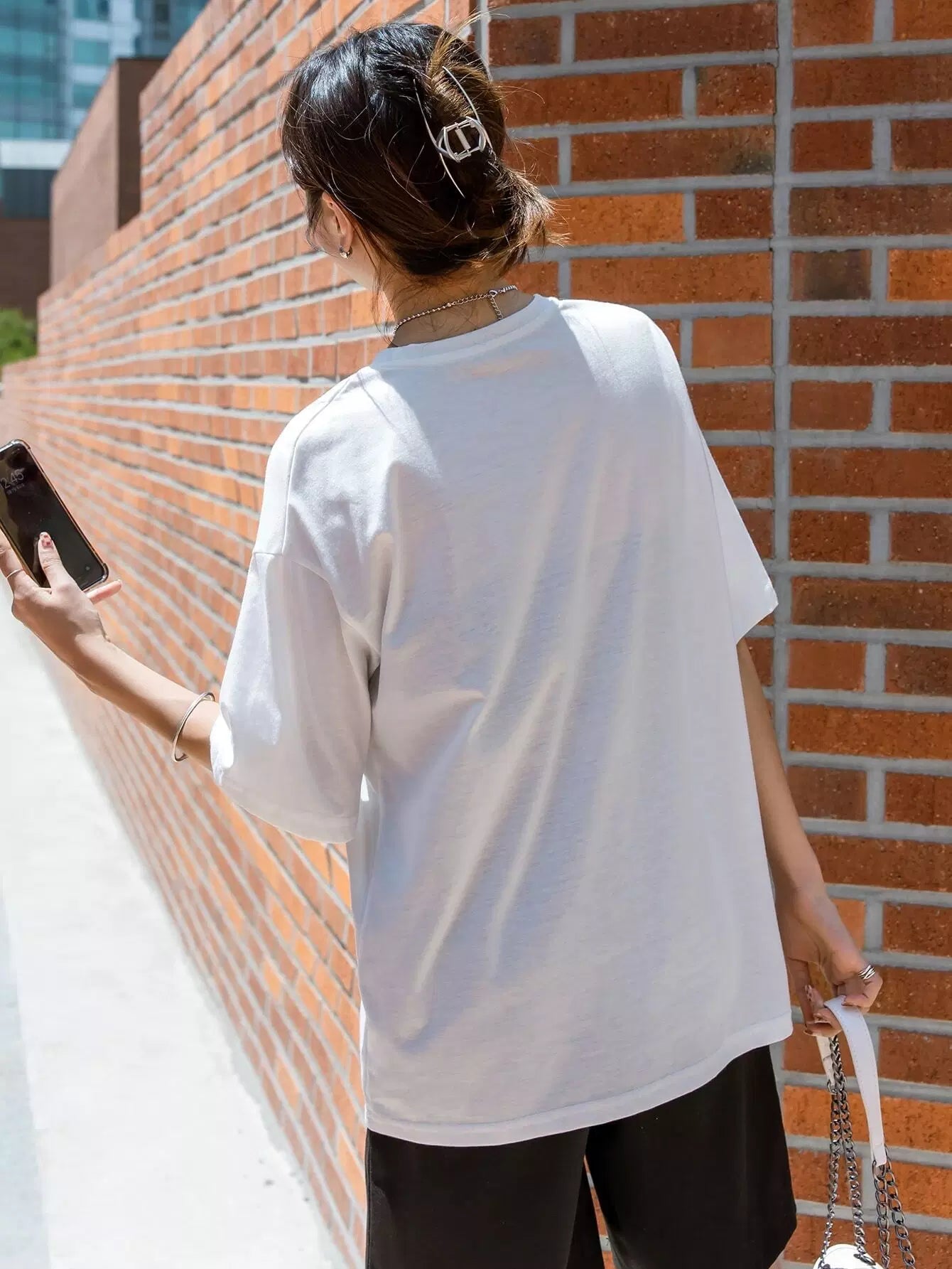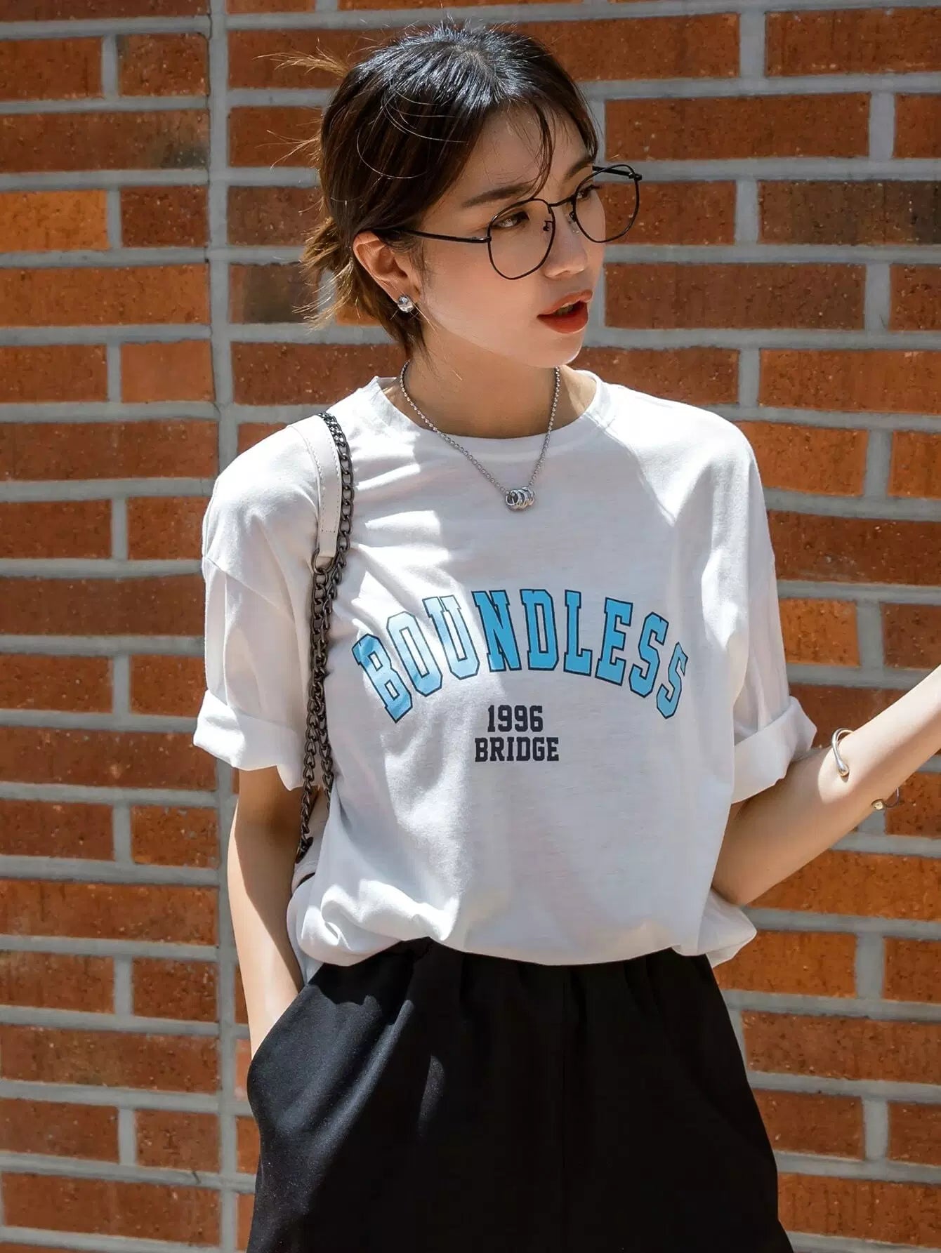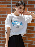 تي شيرت منسدل الكتف برسومات على شكل حرف