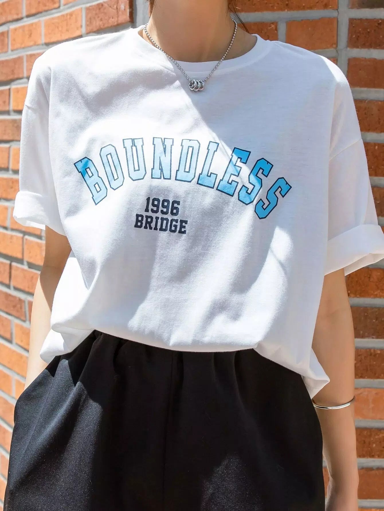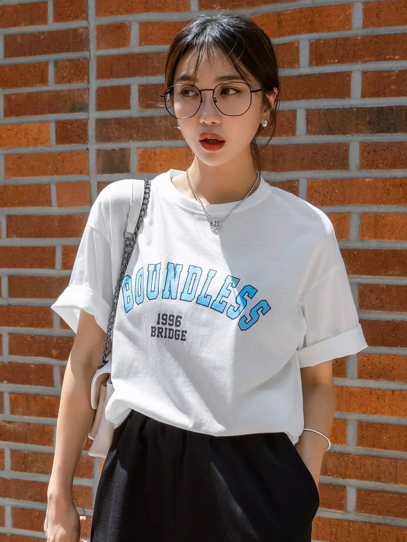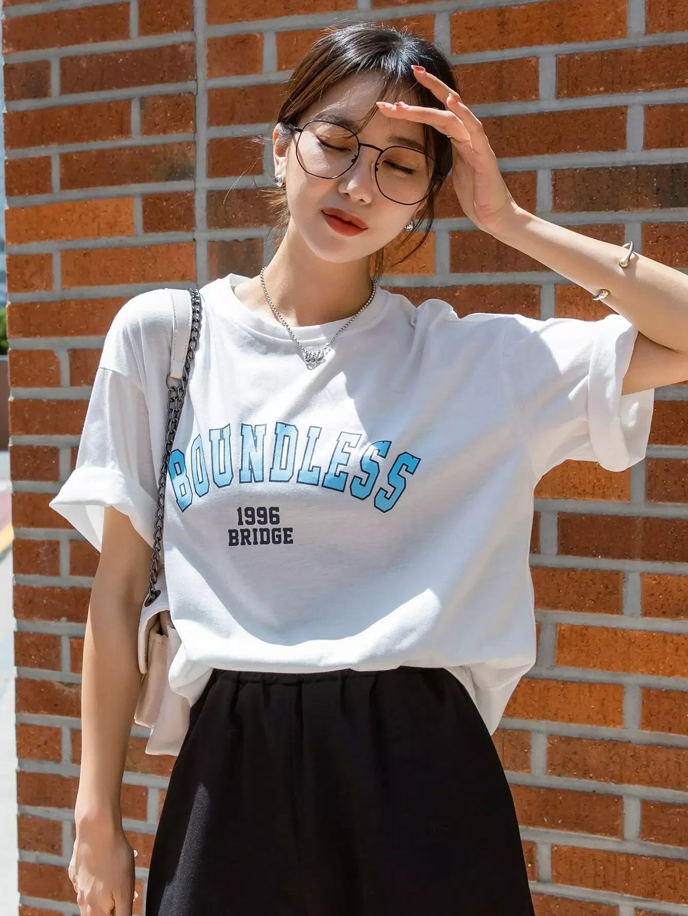 تي شيرت منسدل الكتف برسومات على شكل حرف