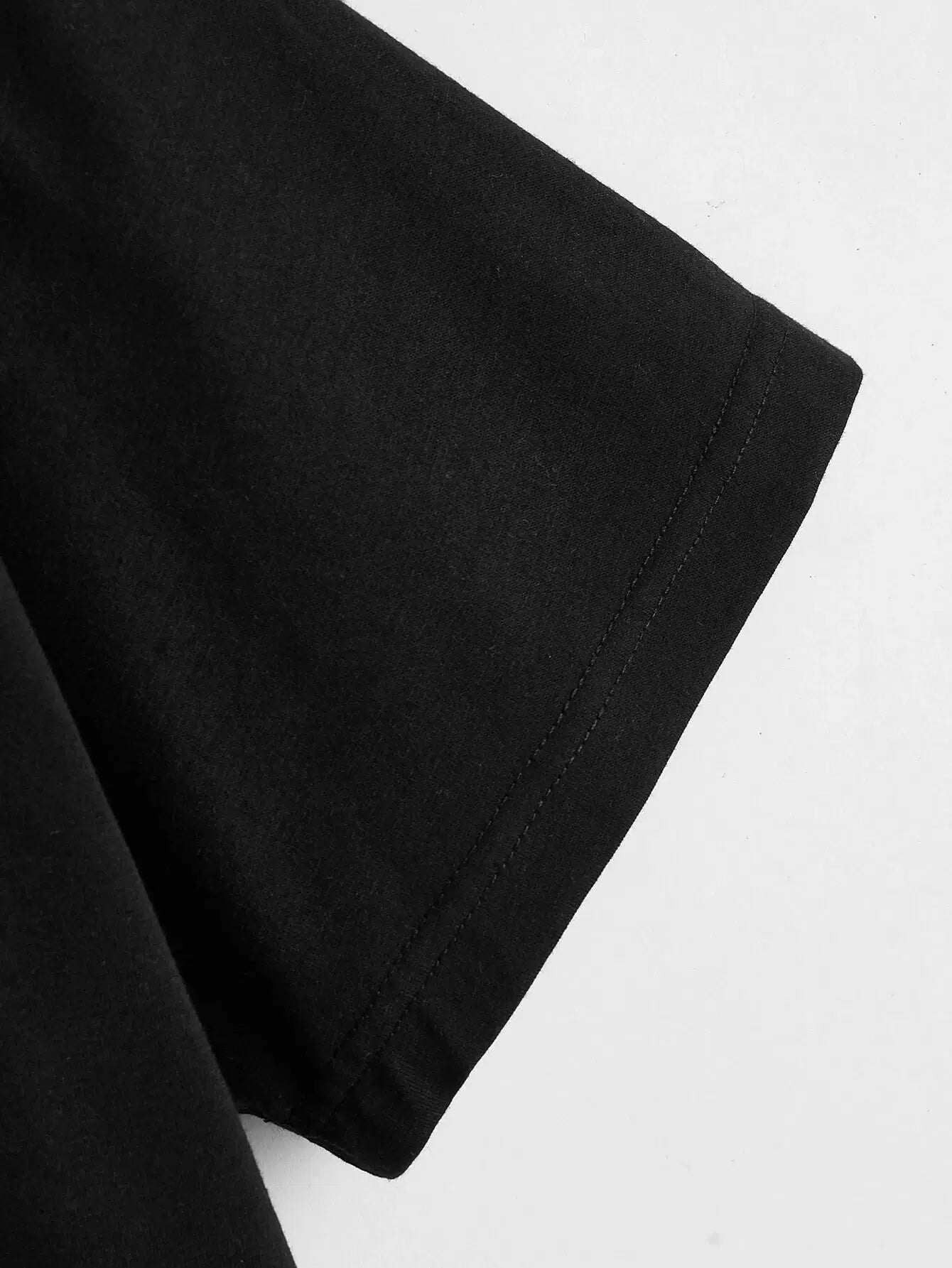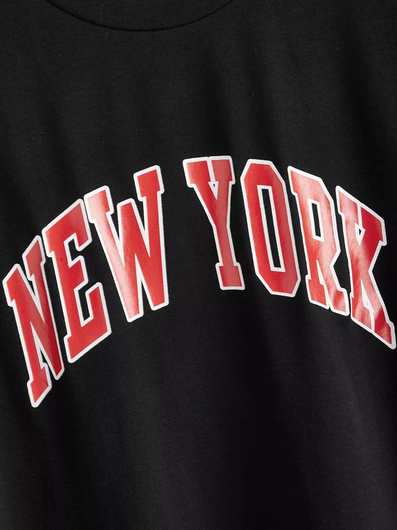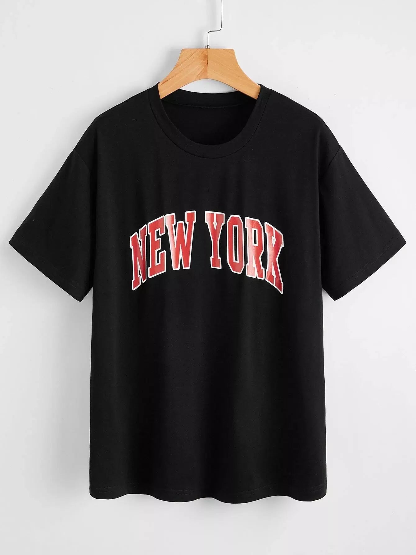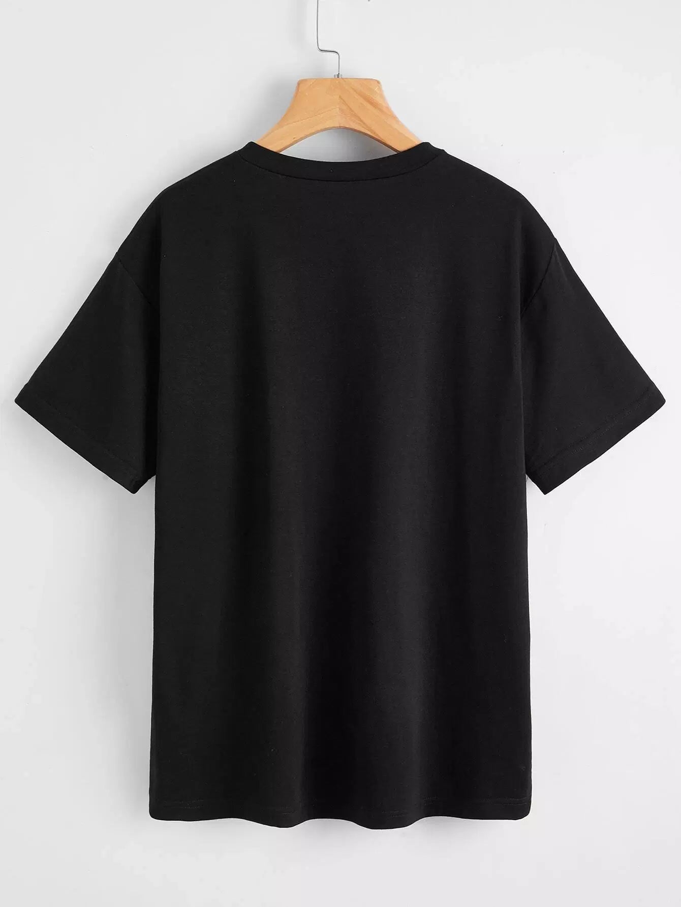 تي شيرت منسدل الكتف برسومات على شكل حرف