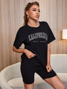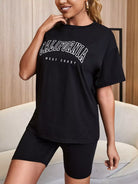 تي شيرت منسدل الكتف برسومات على شكل حرف