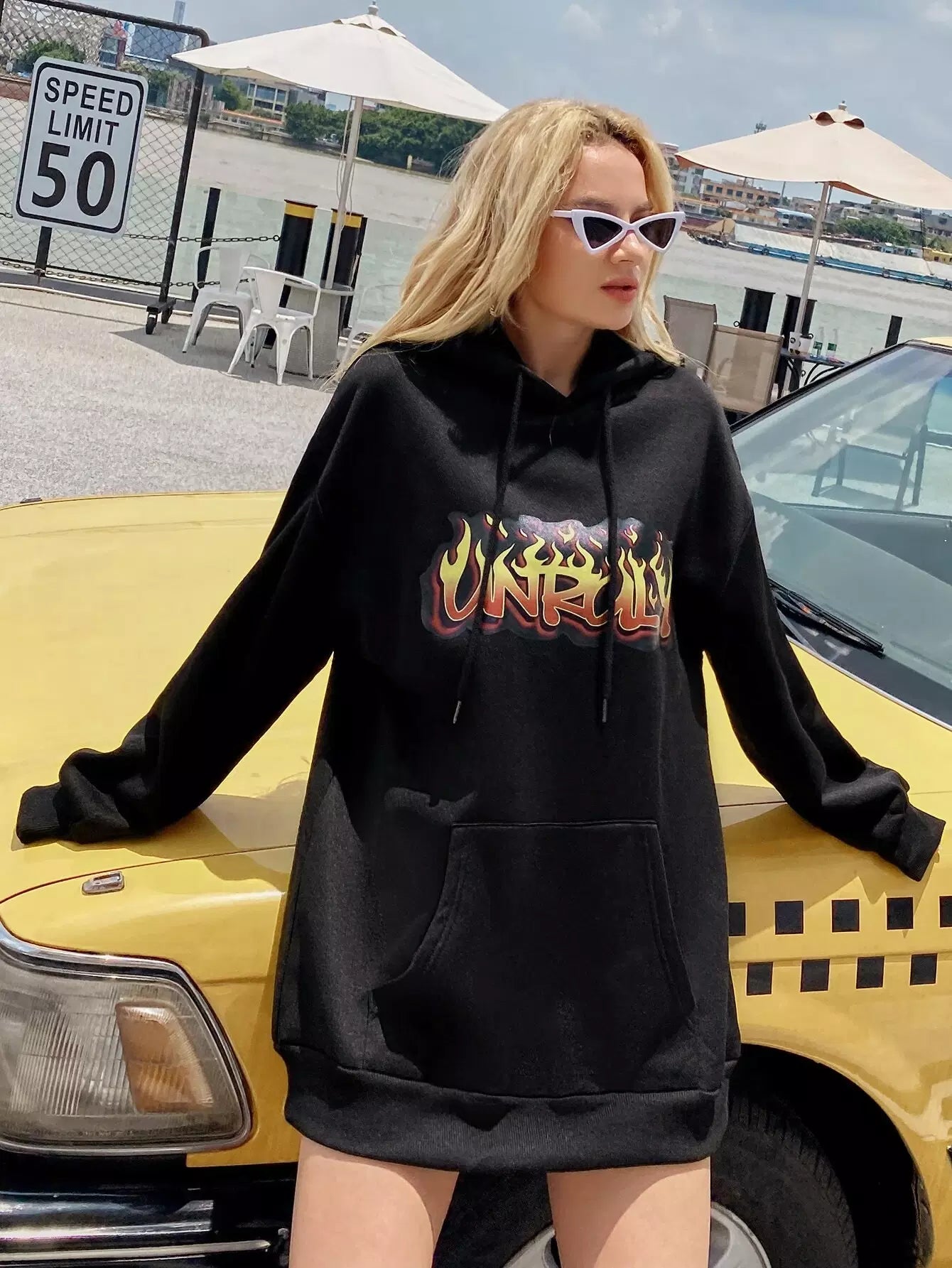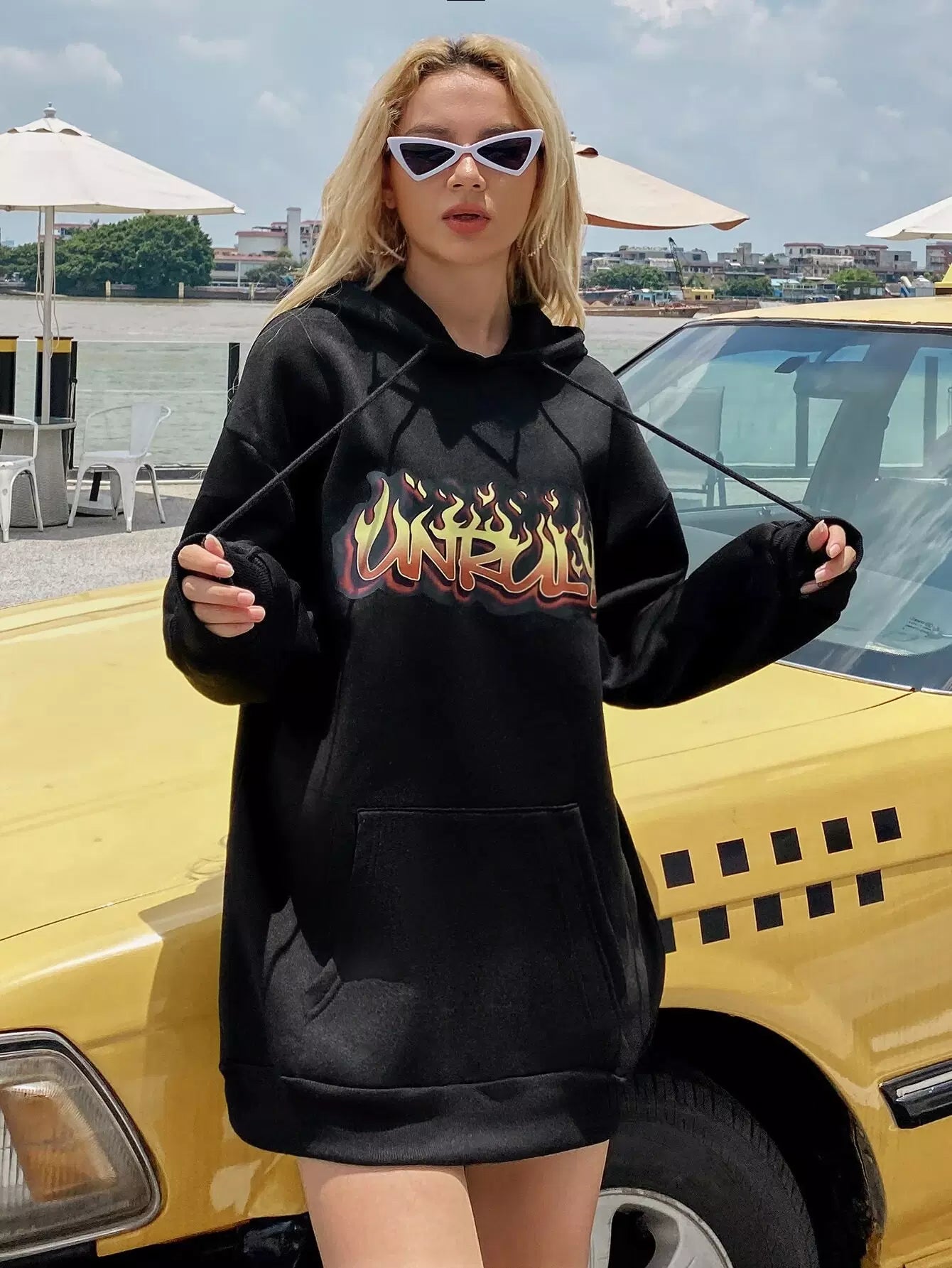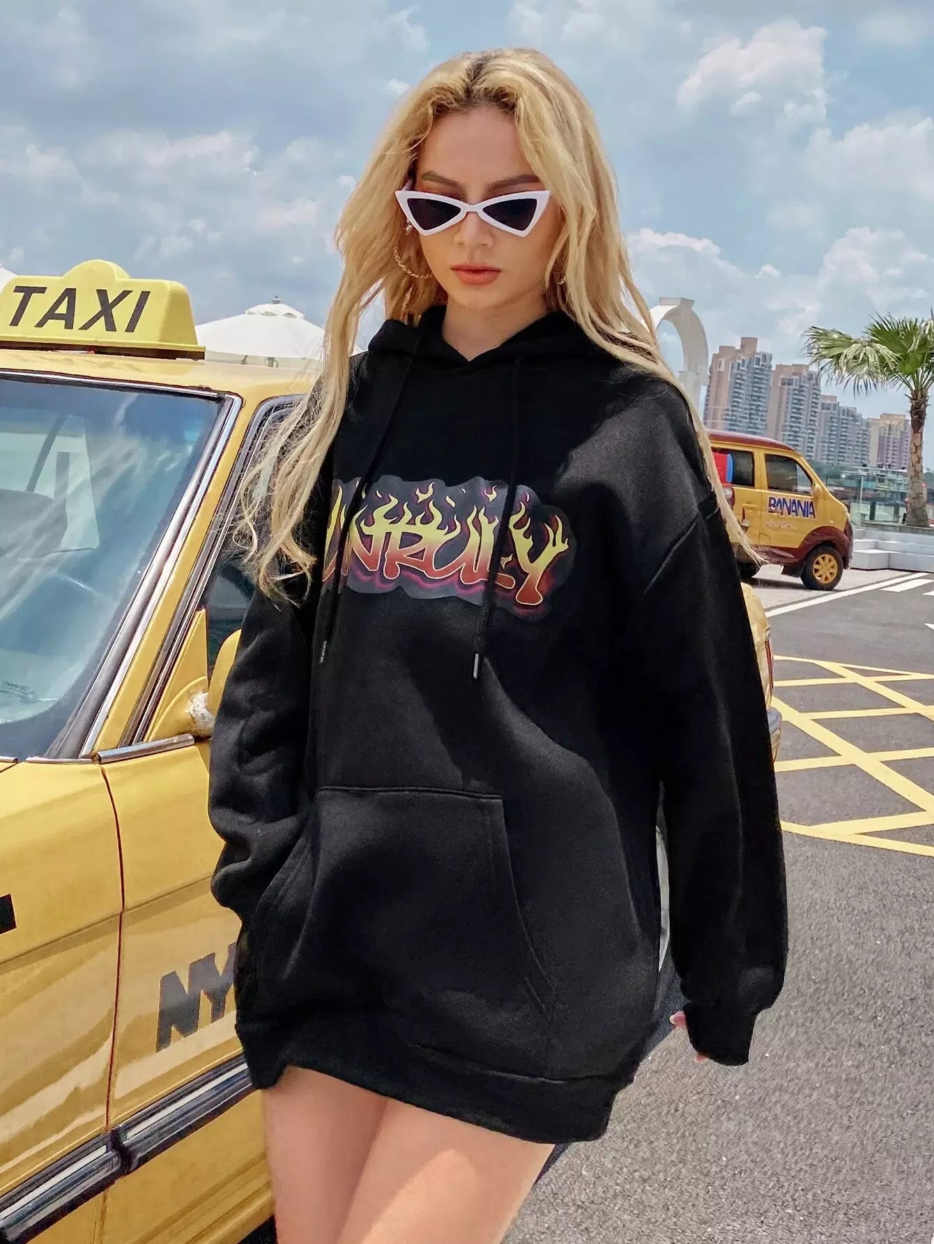 سويت شيرت بغطاء رأس وجيب كنغر مرسوم عليه حروف