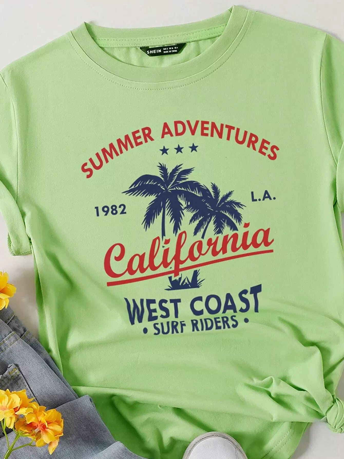 للنساء - تي شيرت مطبوع عليه حروف وشجرة نخيل