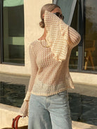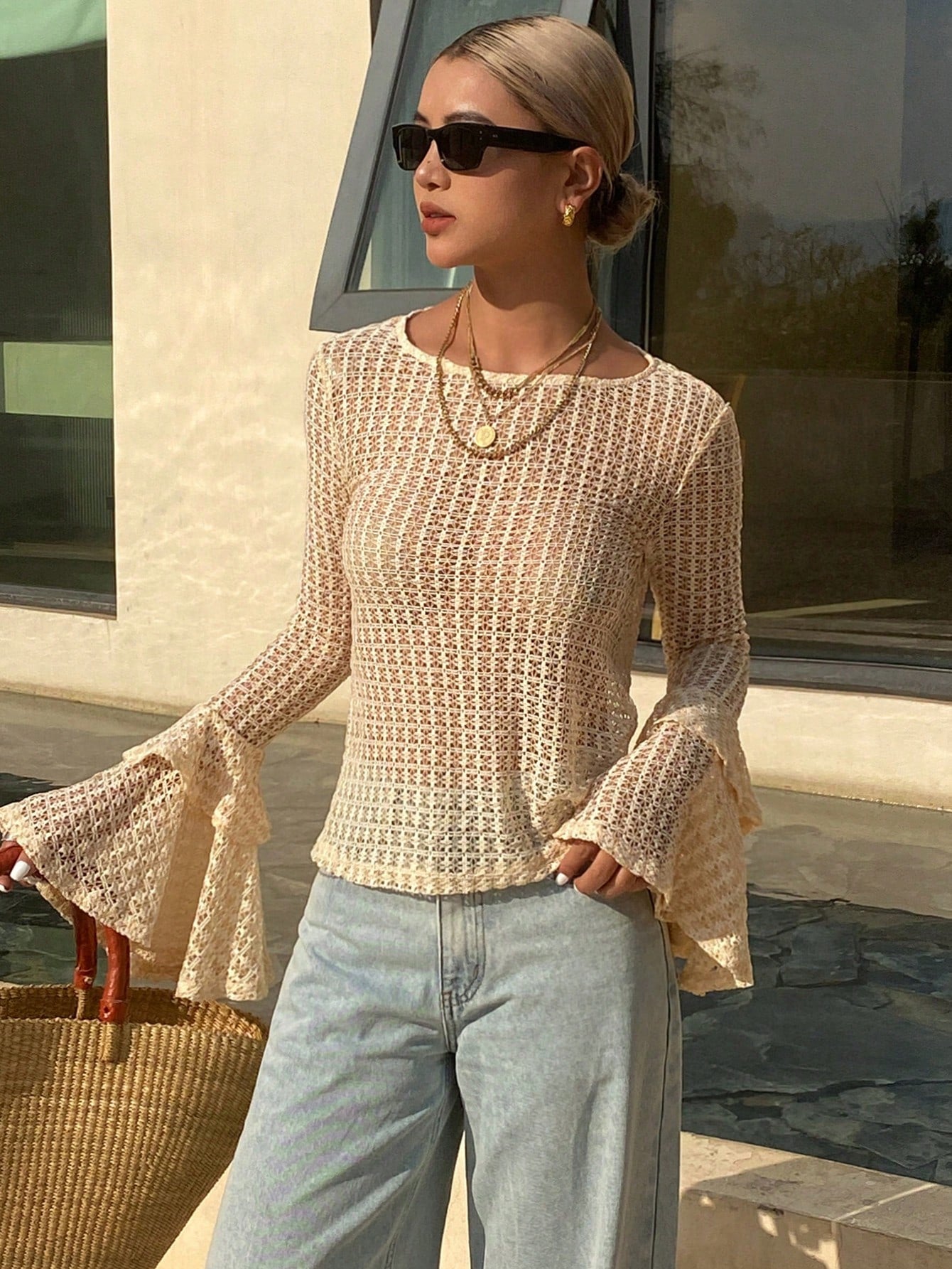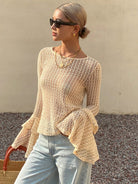 تي شيرت نسائي صيفي فضفاض غير رسمي من Livesso مناسب لقضاء العطلات على الشاطئ مصنوع من شبكة شفافة بأكمام طويلة وكشكشة