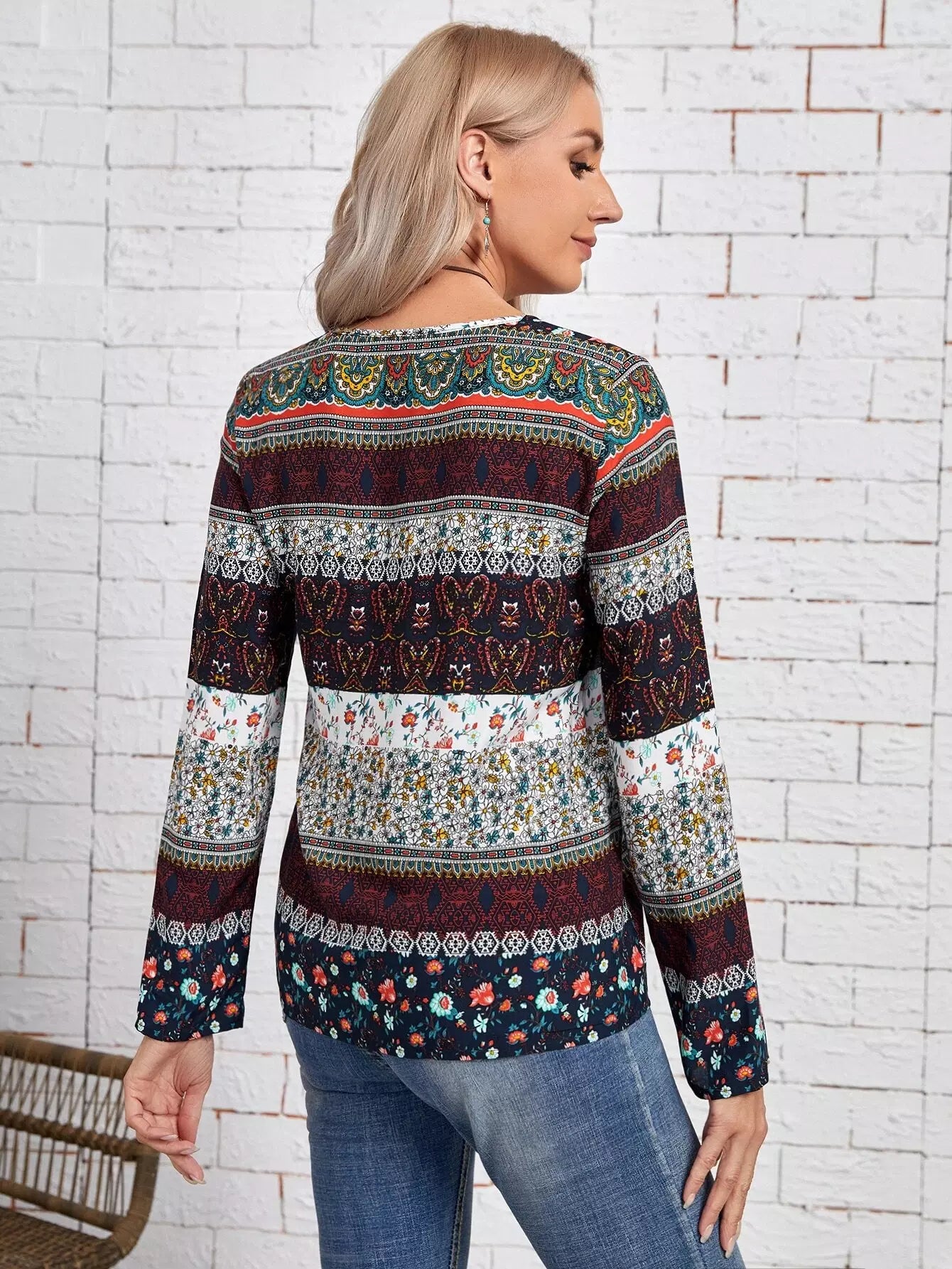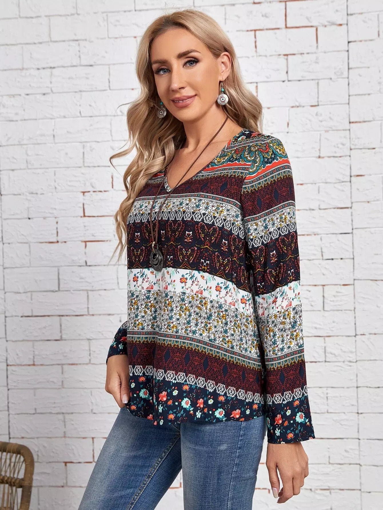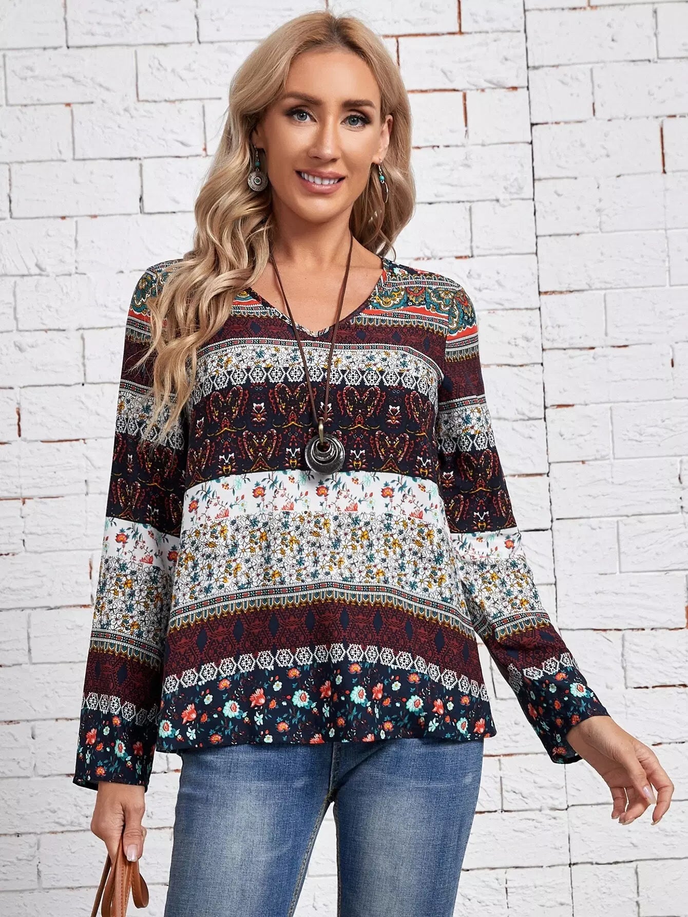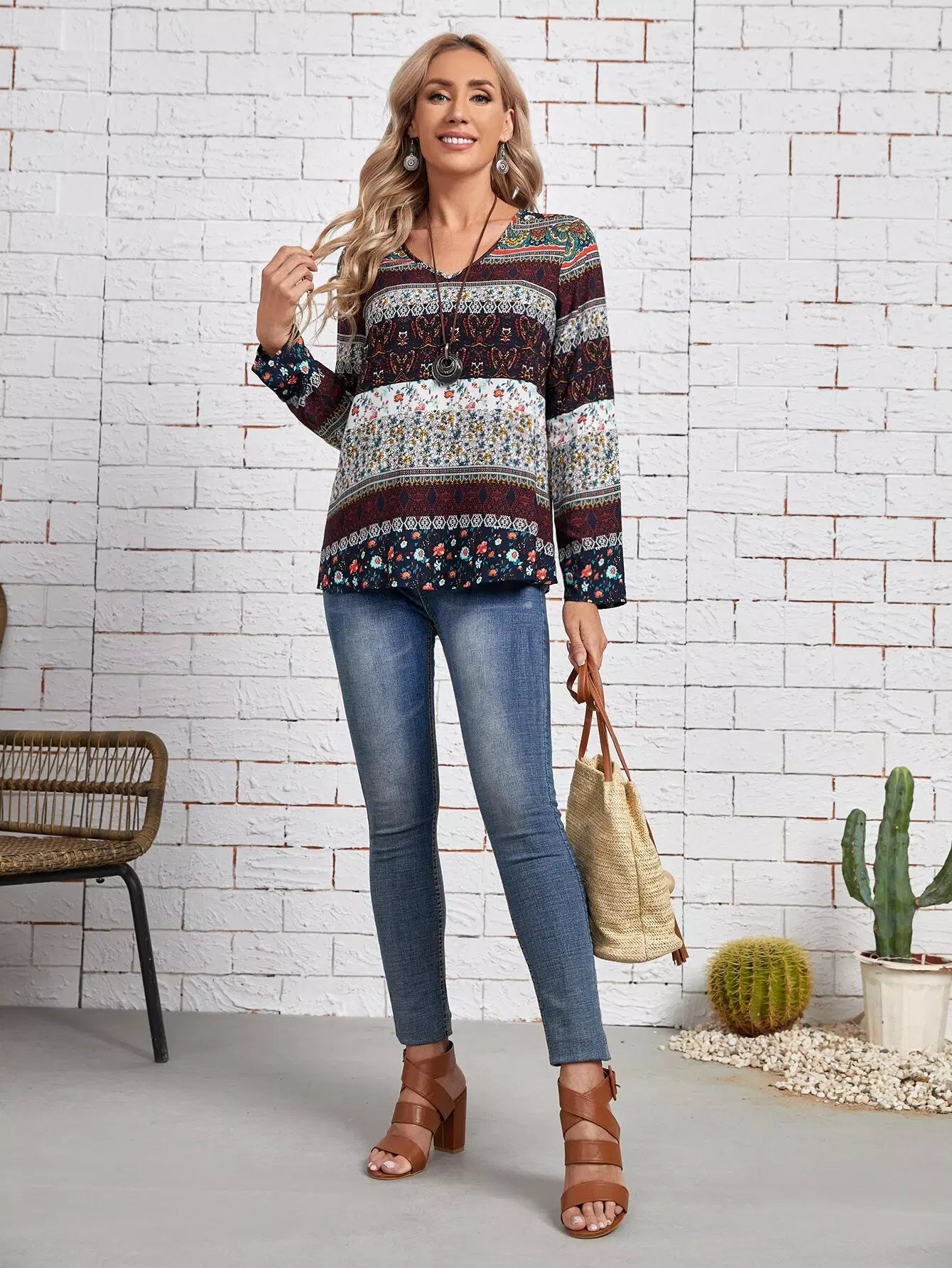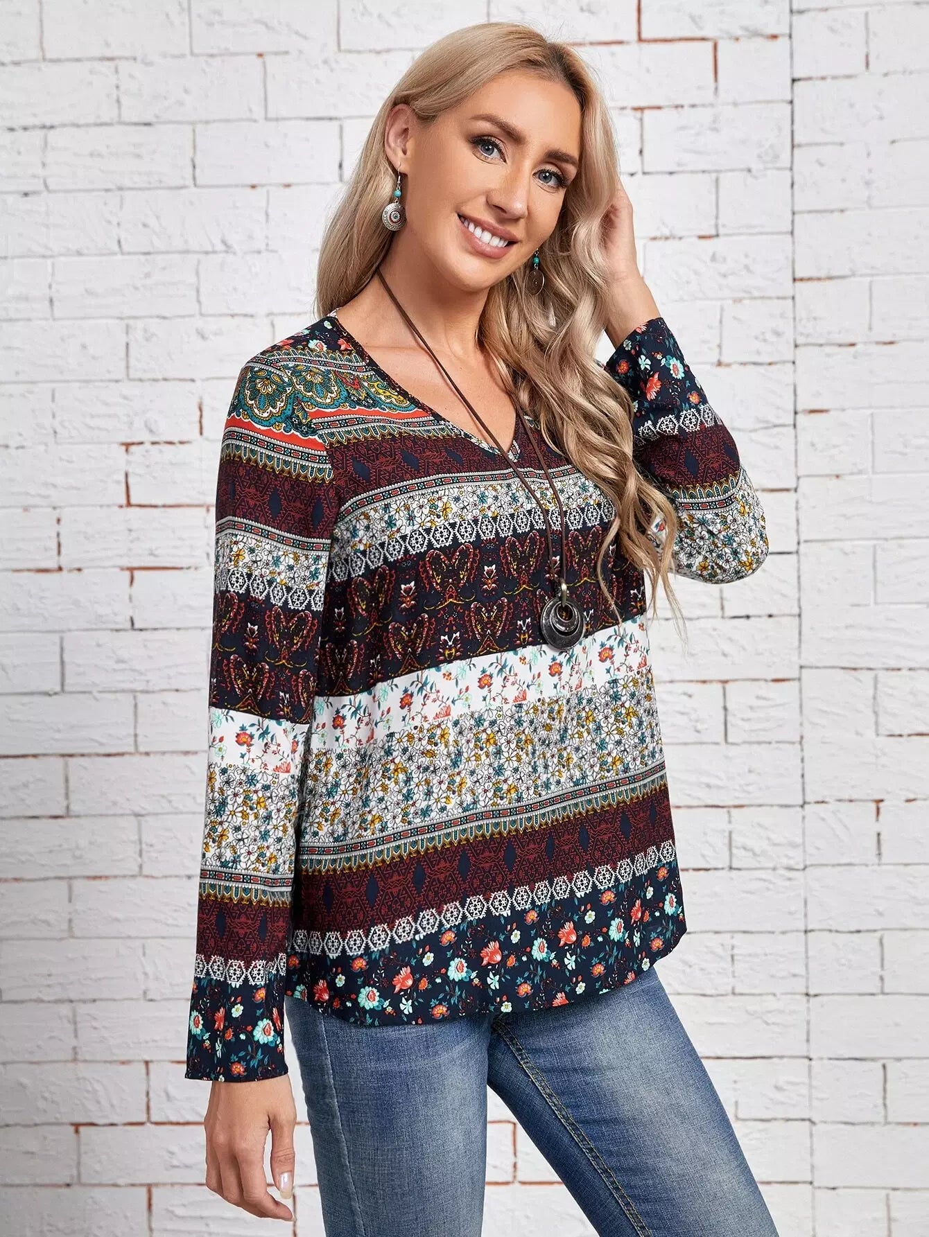 بلوزة برقبة على شكل حرف V مطبوع عليها طبعات مختلطة
