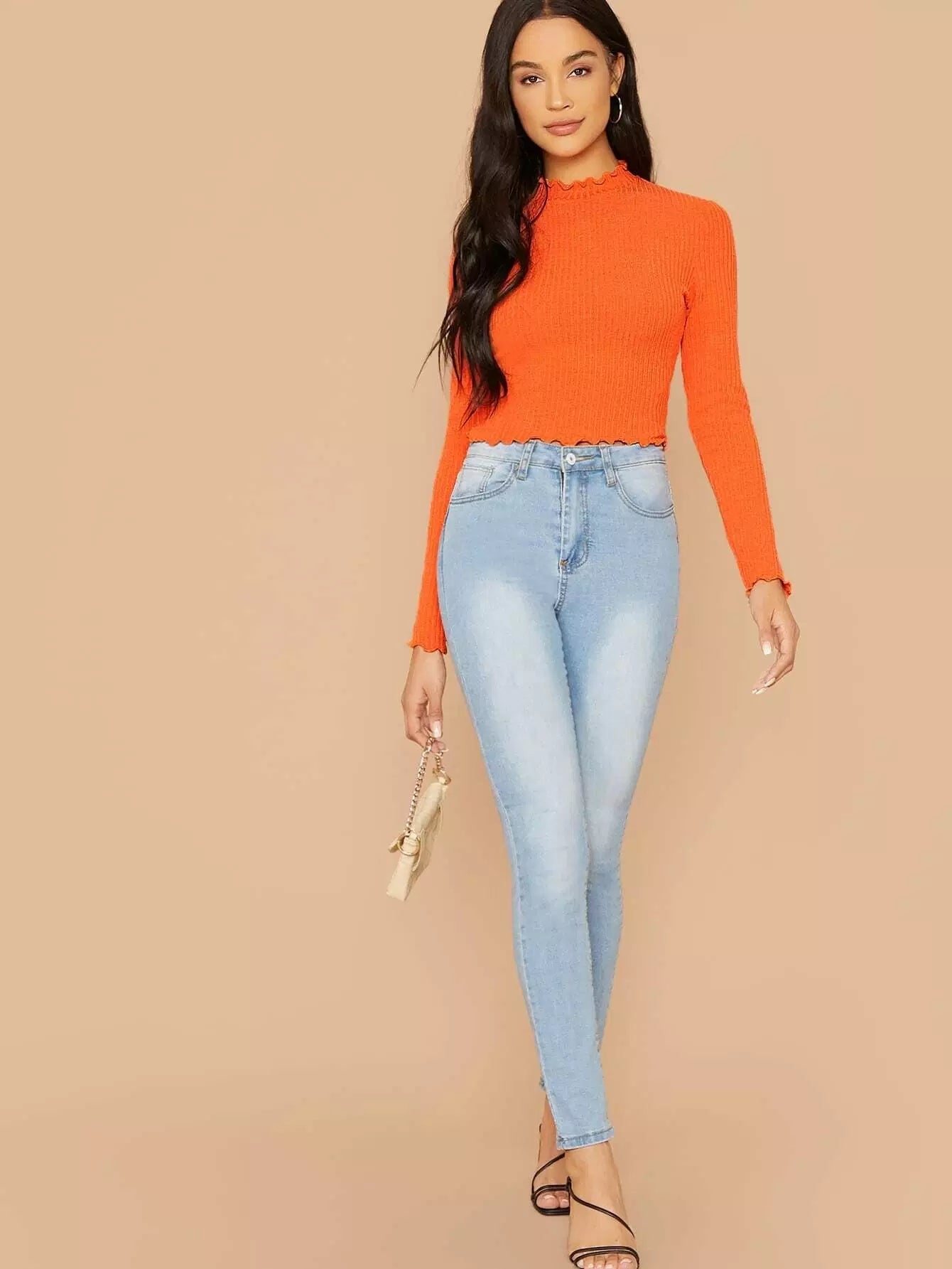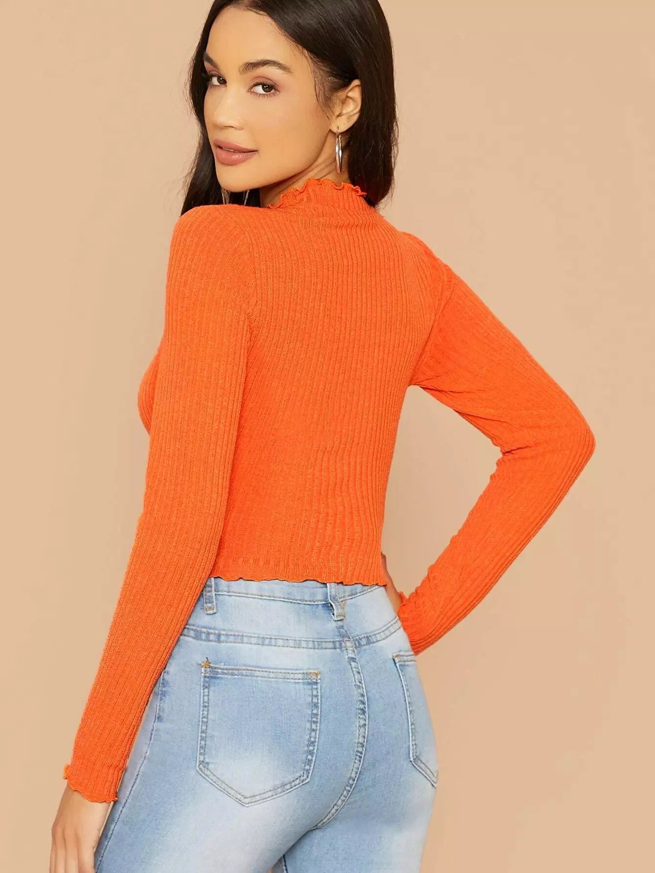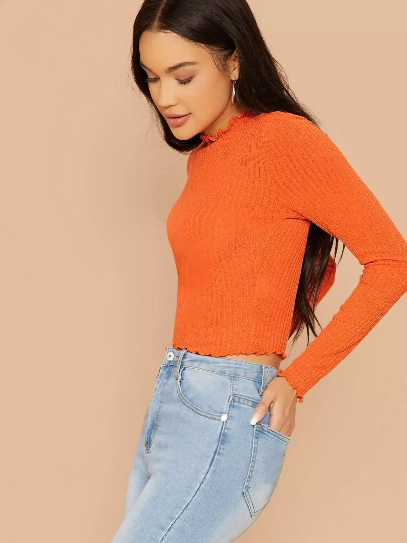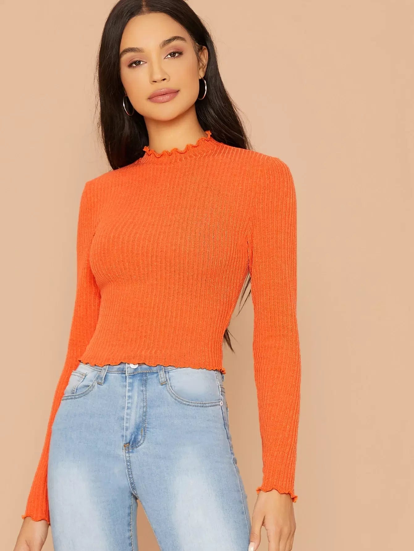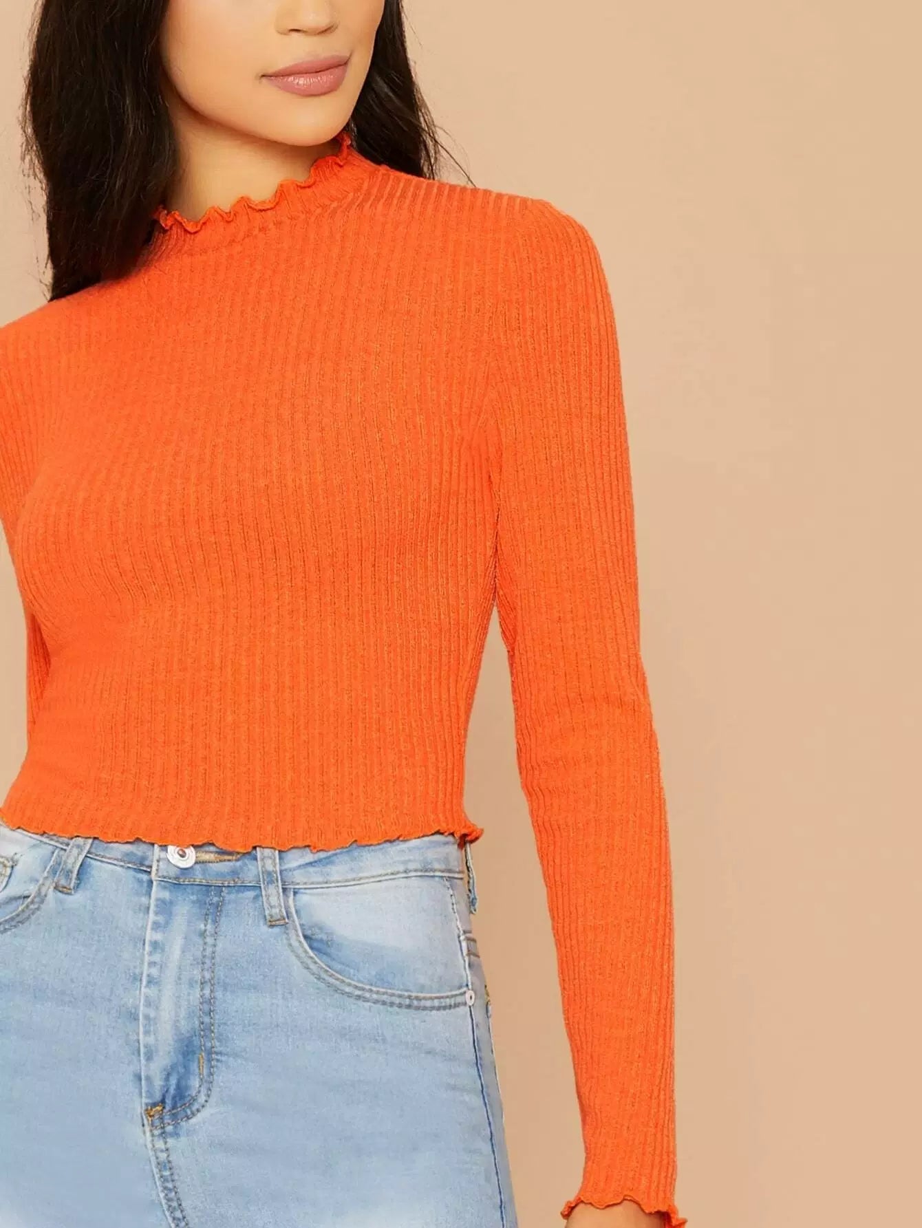 تي شيرت بحواف برتقالية مزينة بالخس محبوكة على شكل ضلع