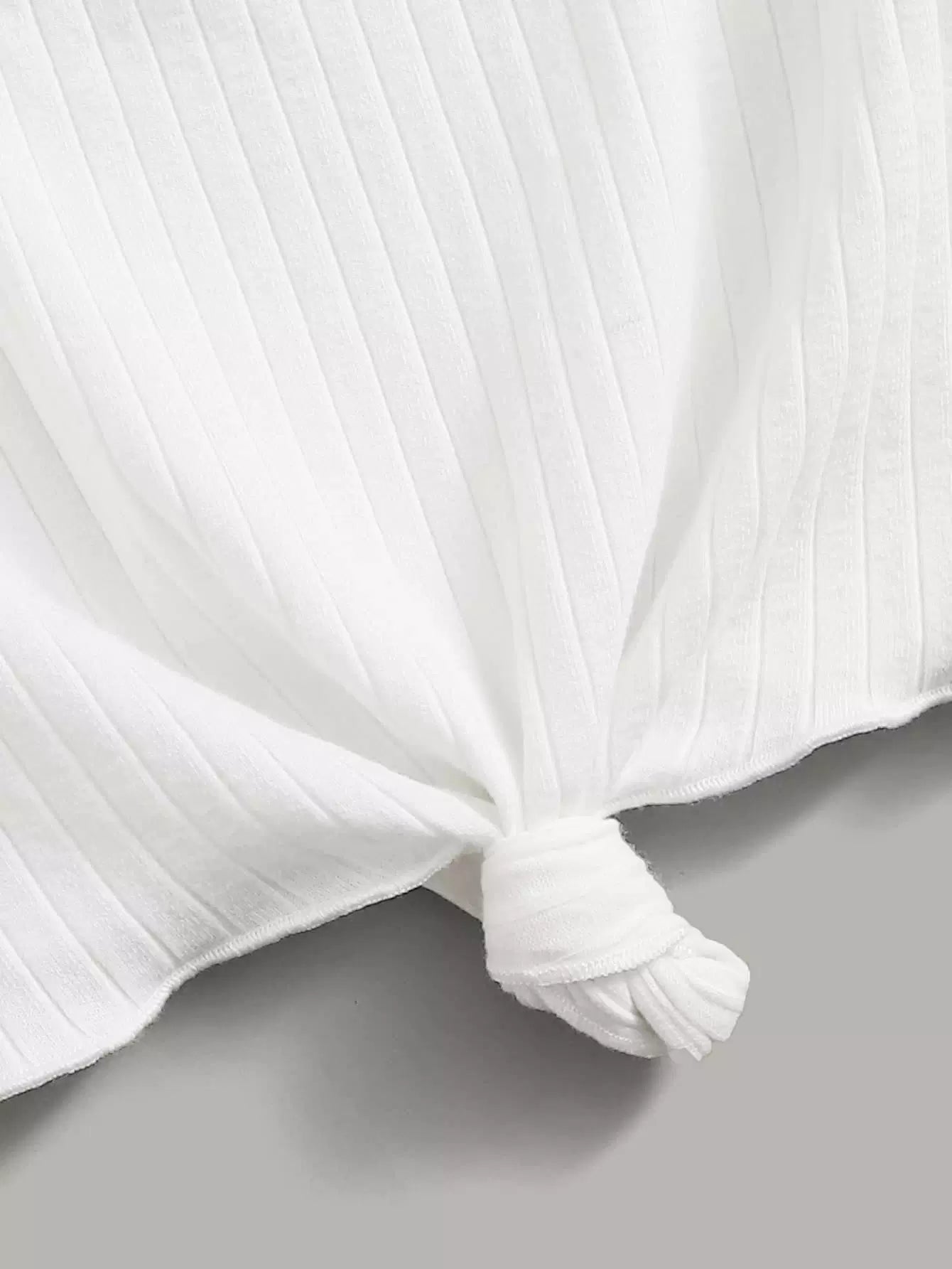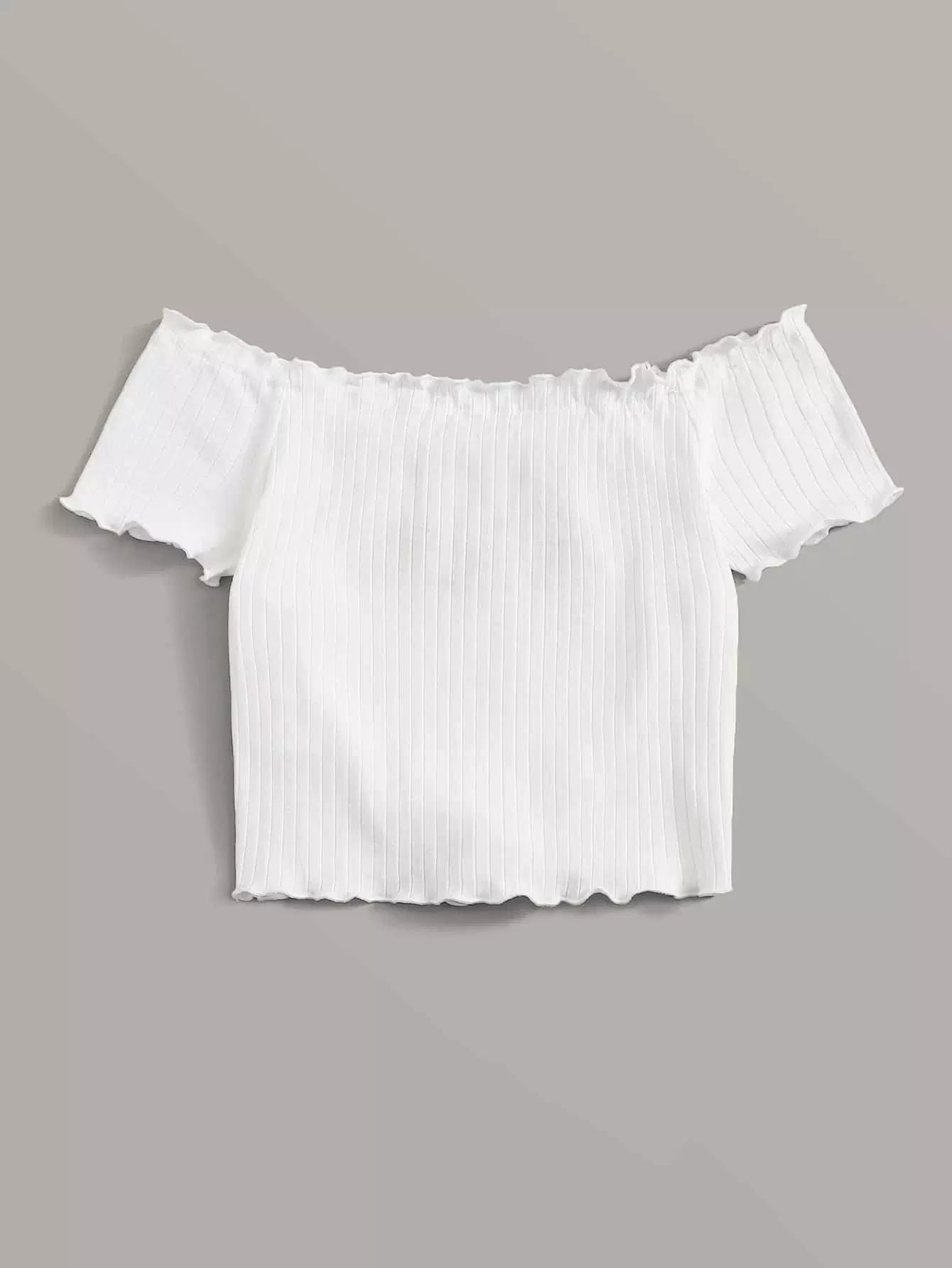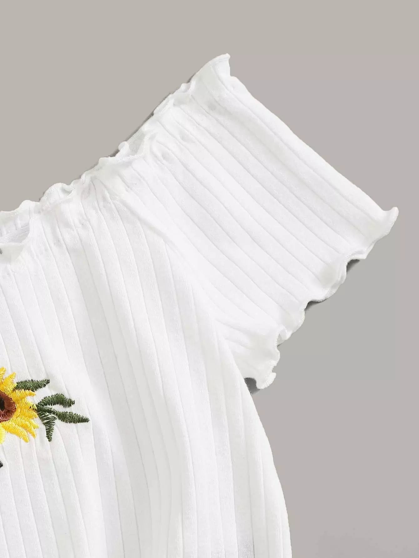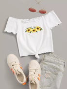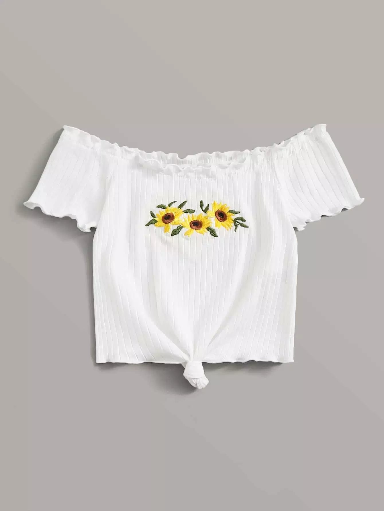بلوزة بحاشية مطرزة بكشكش بحافة مطرزة بعقدة من دون أكتاف