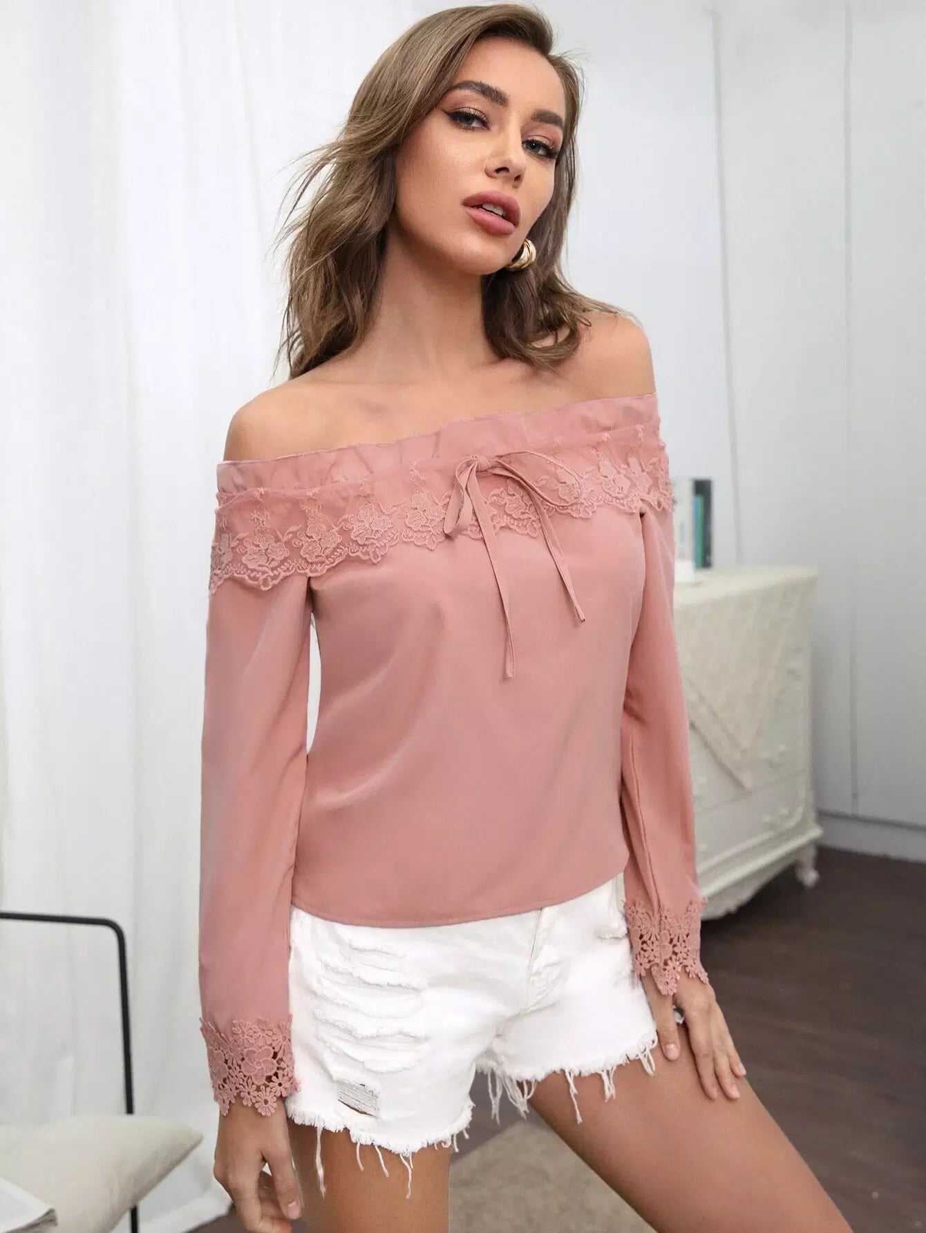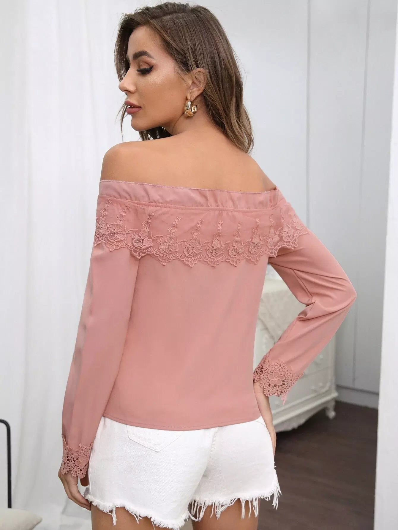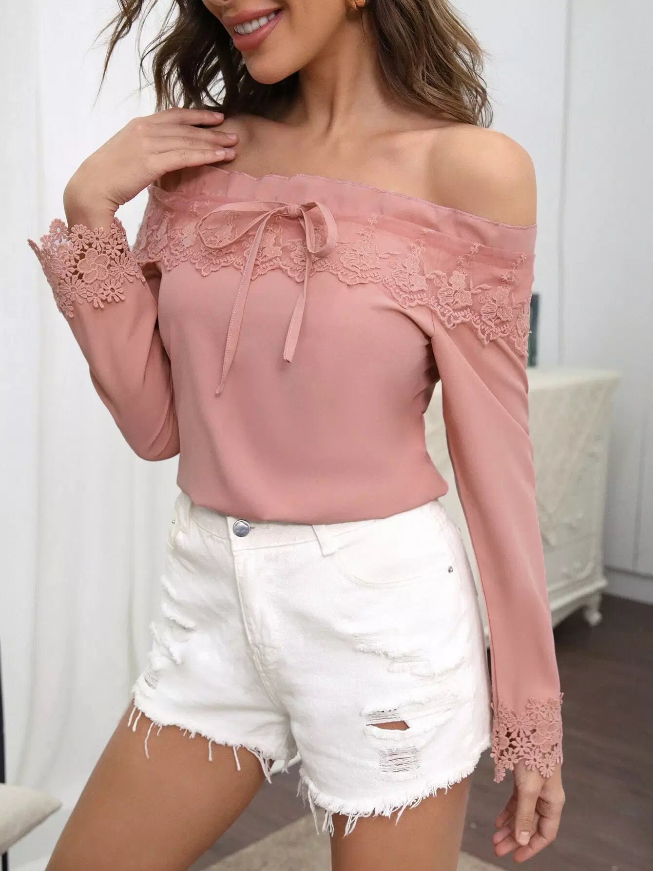 بلوزة مكشوفة الأكتاف مزينة بالدانتيل