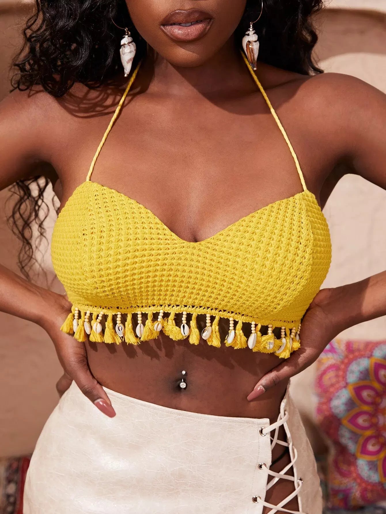 بلوزة قصيرة مكشوفة الظهر مع حافة مزينة بالشراشيب