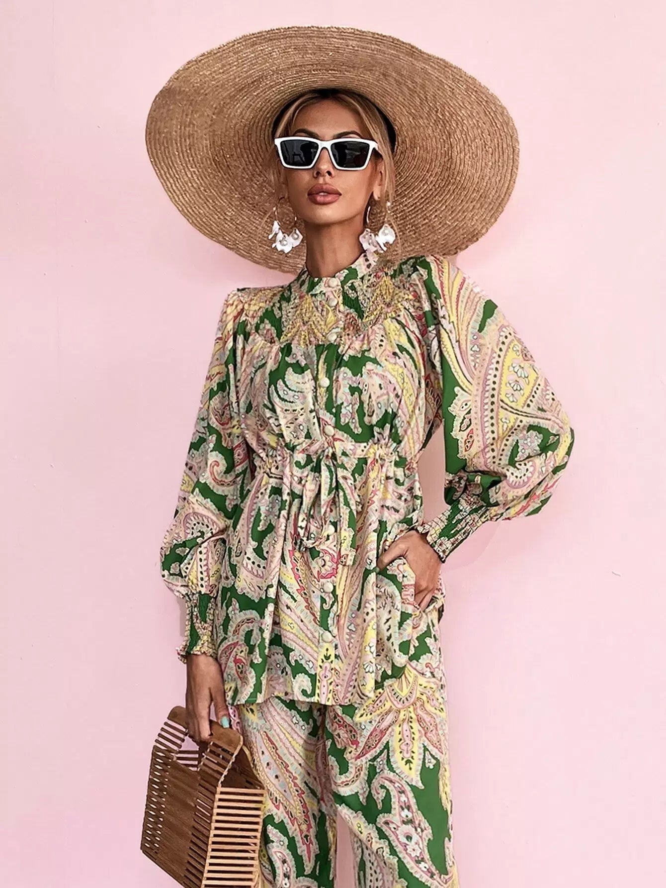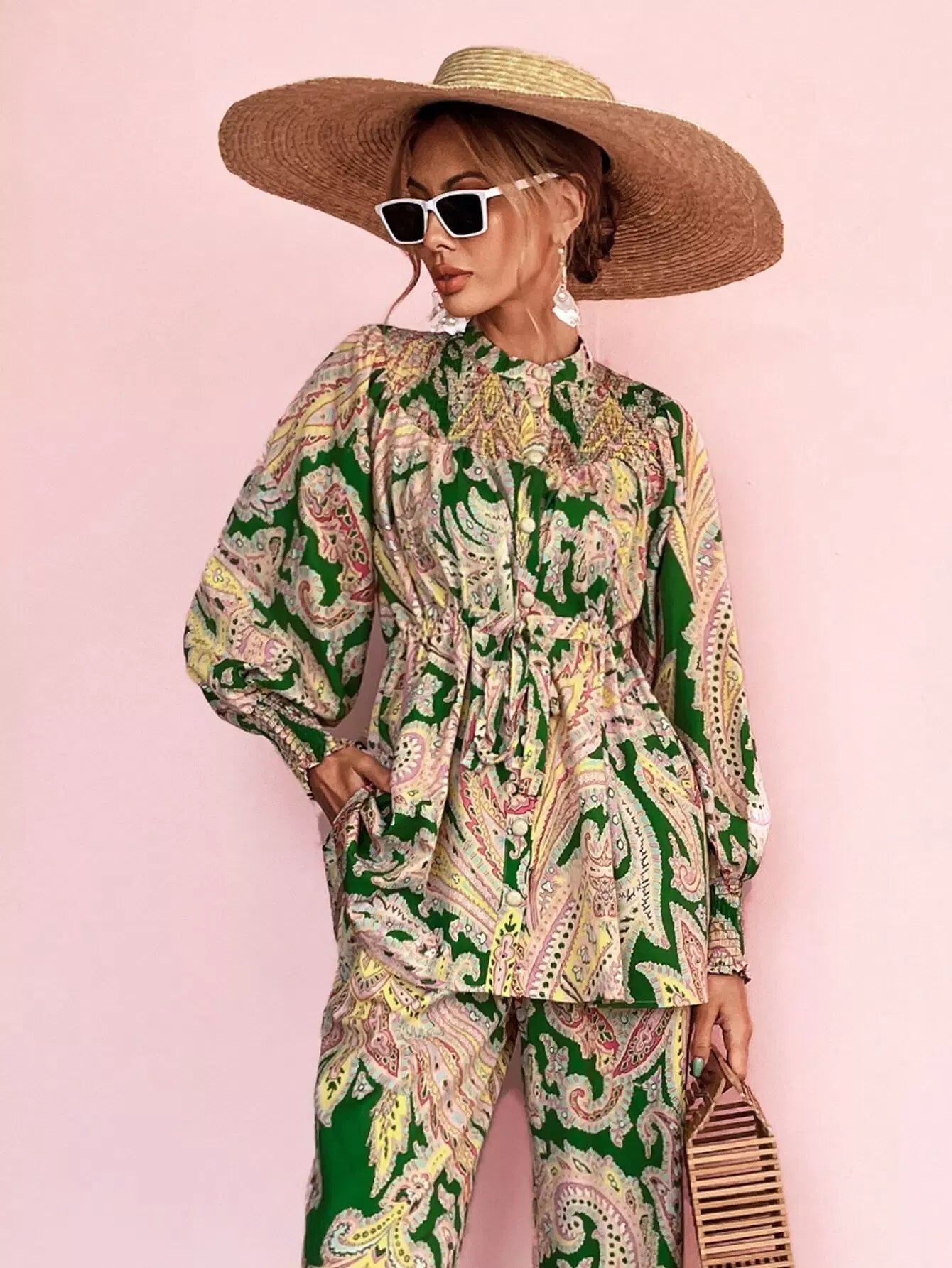 بلوزة بأكمام بأزرار وأزرار وأربطة بأكمام بيزلي مطبوعة بيزلي