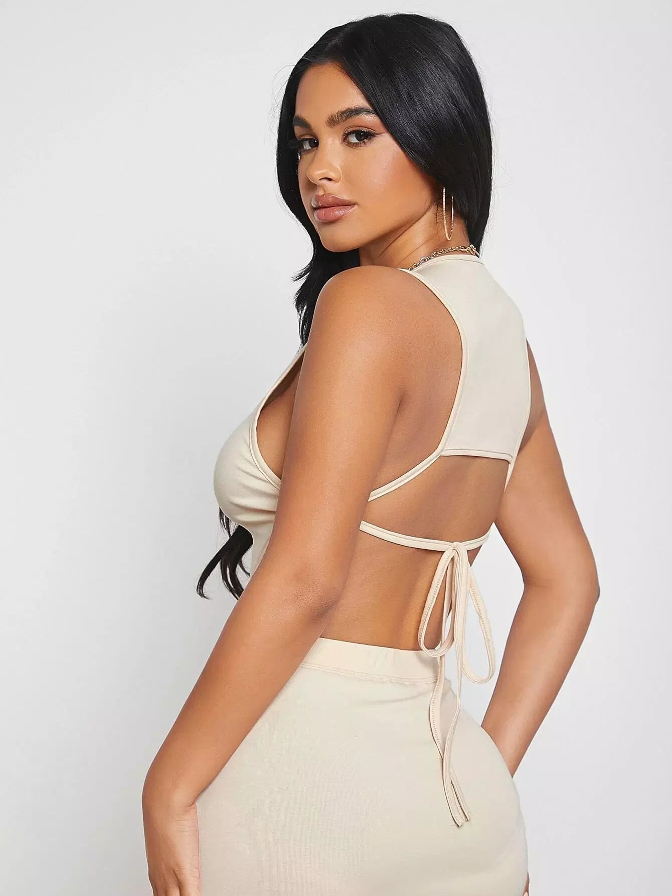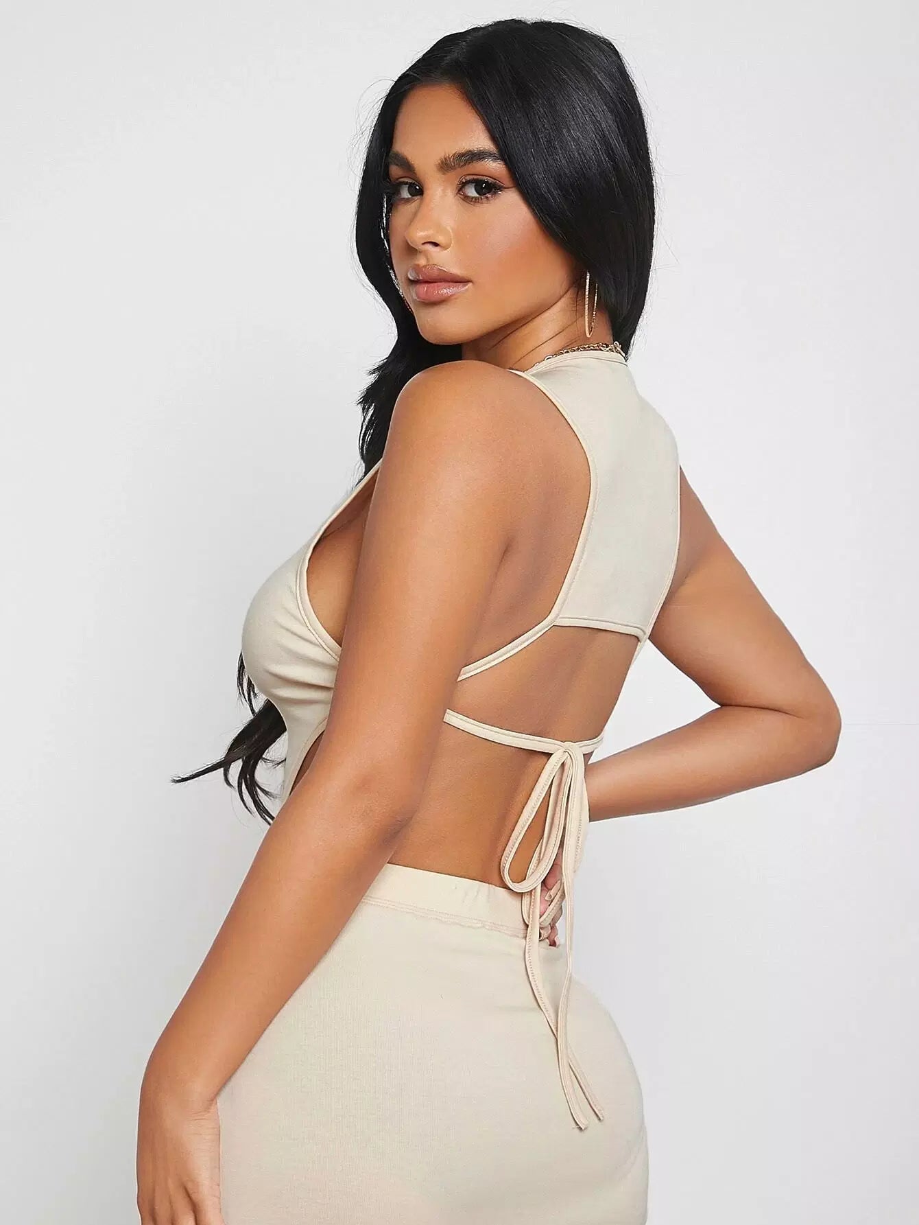 قميص بدون أكمام بحاشية غير متناسقة ذات تفاصيل مرقعة برباط من الخلف