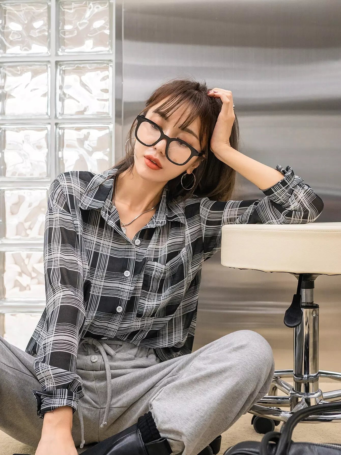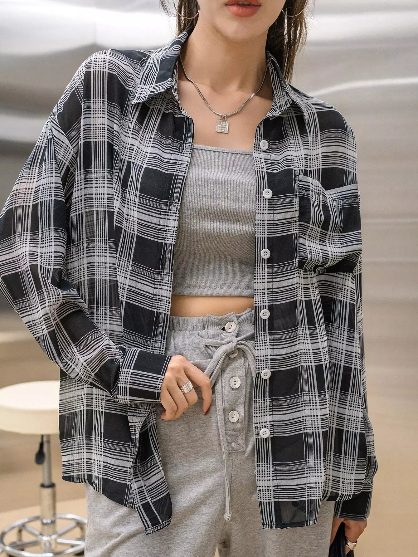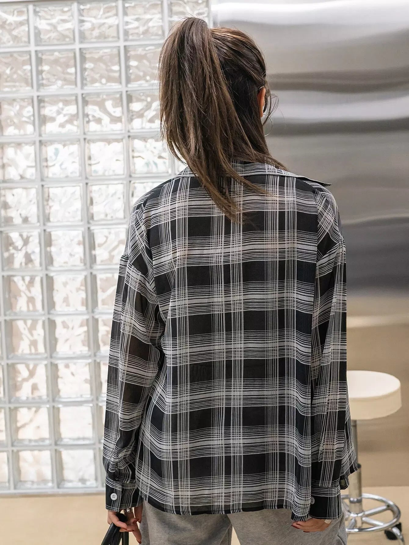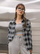 قميص منقوش منسدل الكتفين منسدل الكتفين طويل الأكمام