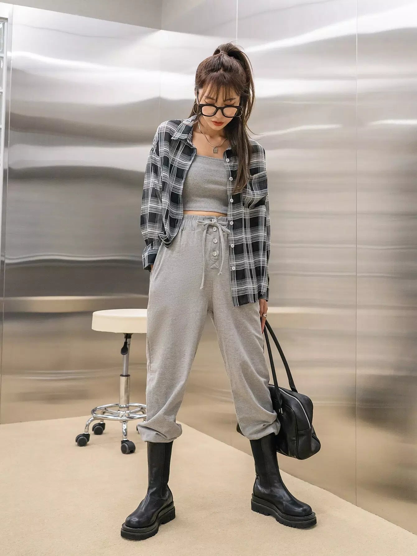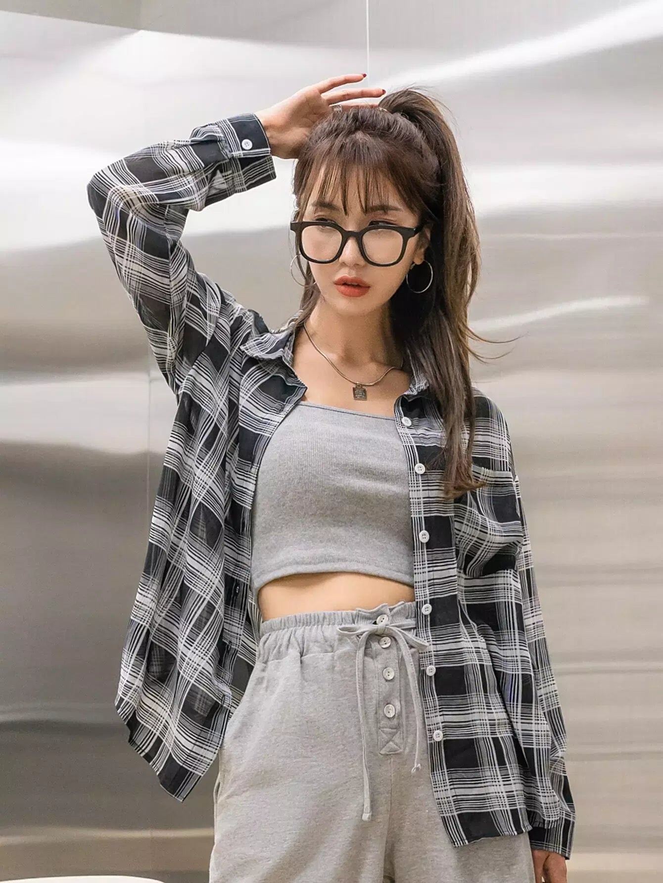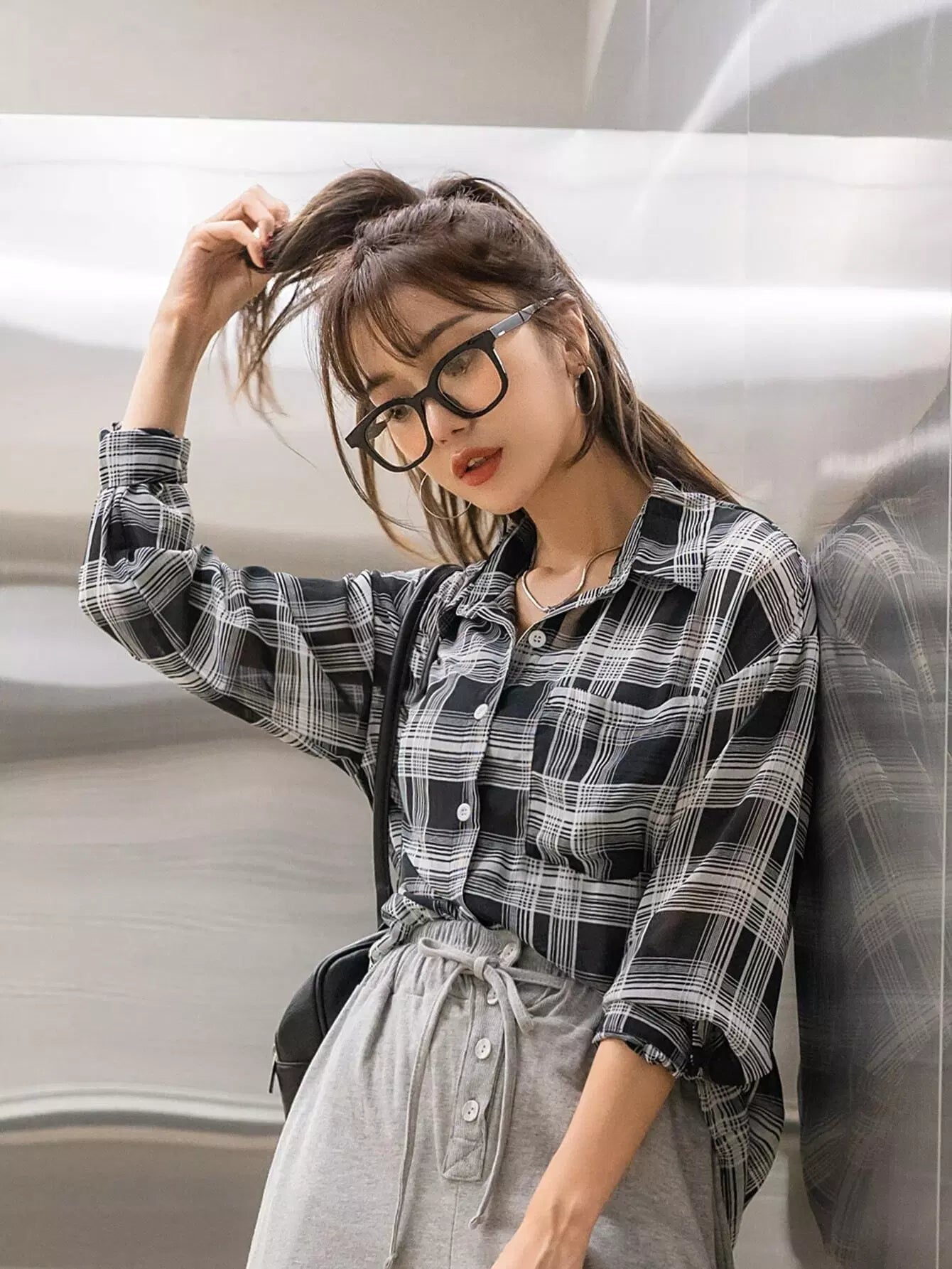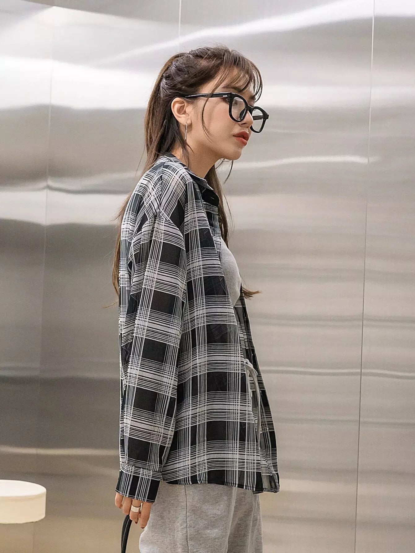 قميص منقوش منسدل الكتفين منسدل الكتفين طويل الأكمام