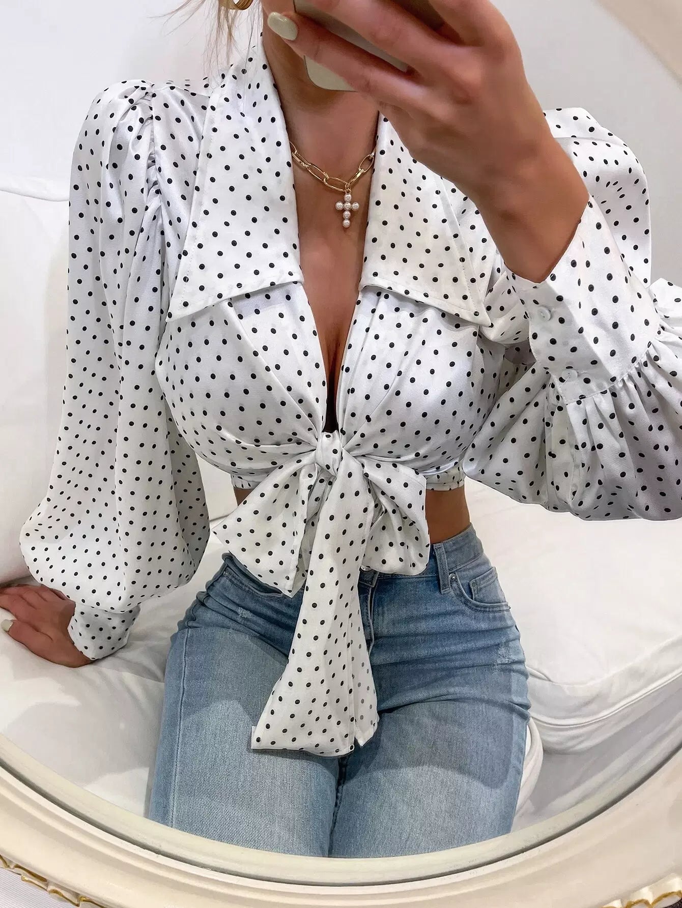 بلوزة منقطة بربطة عنق أمامية منقطة