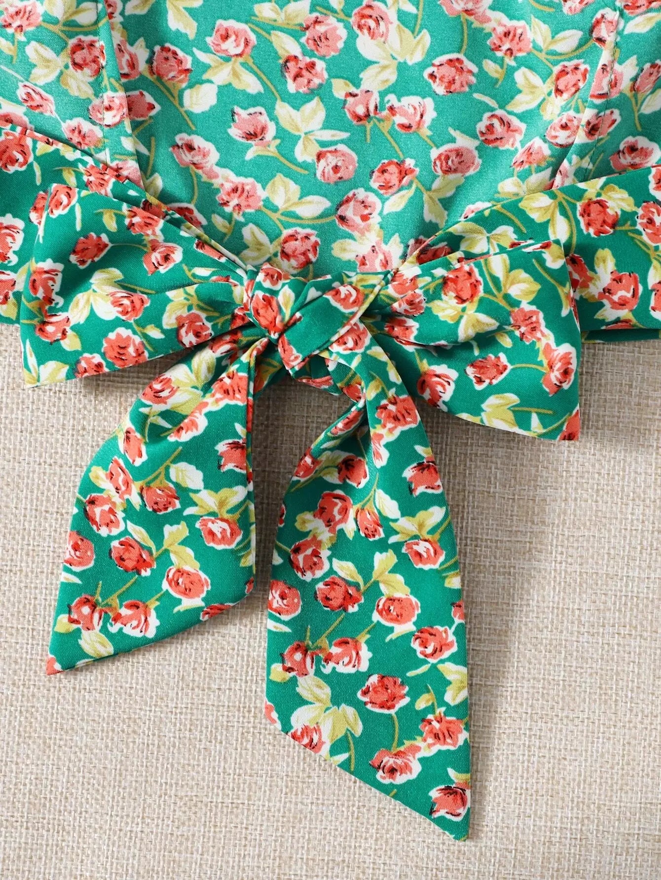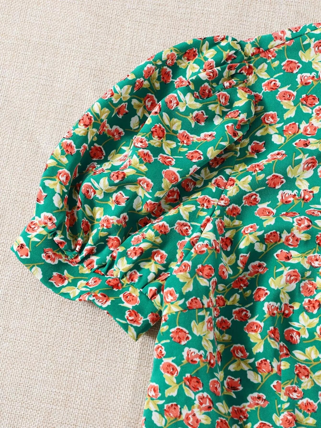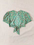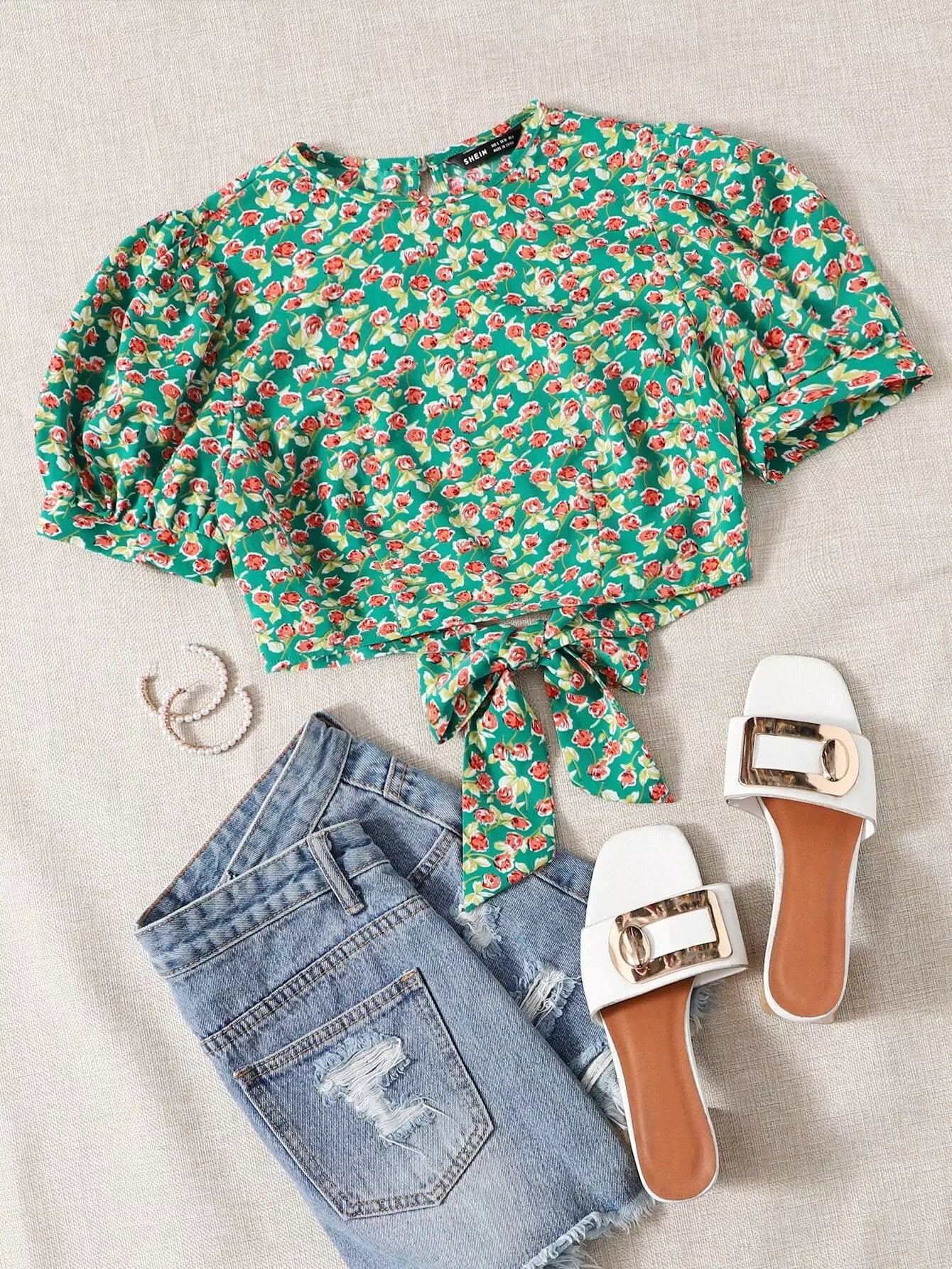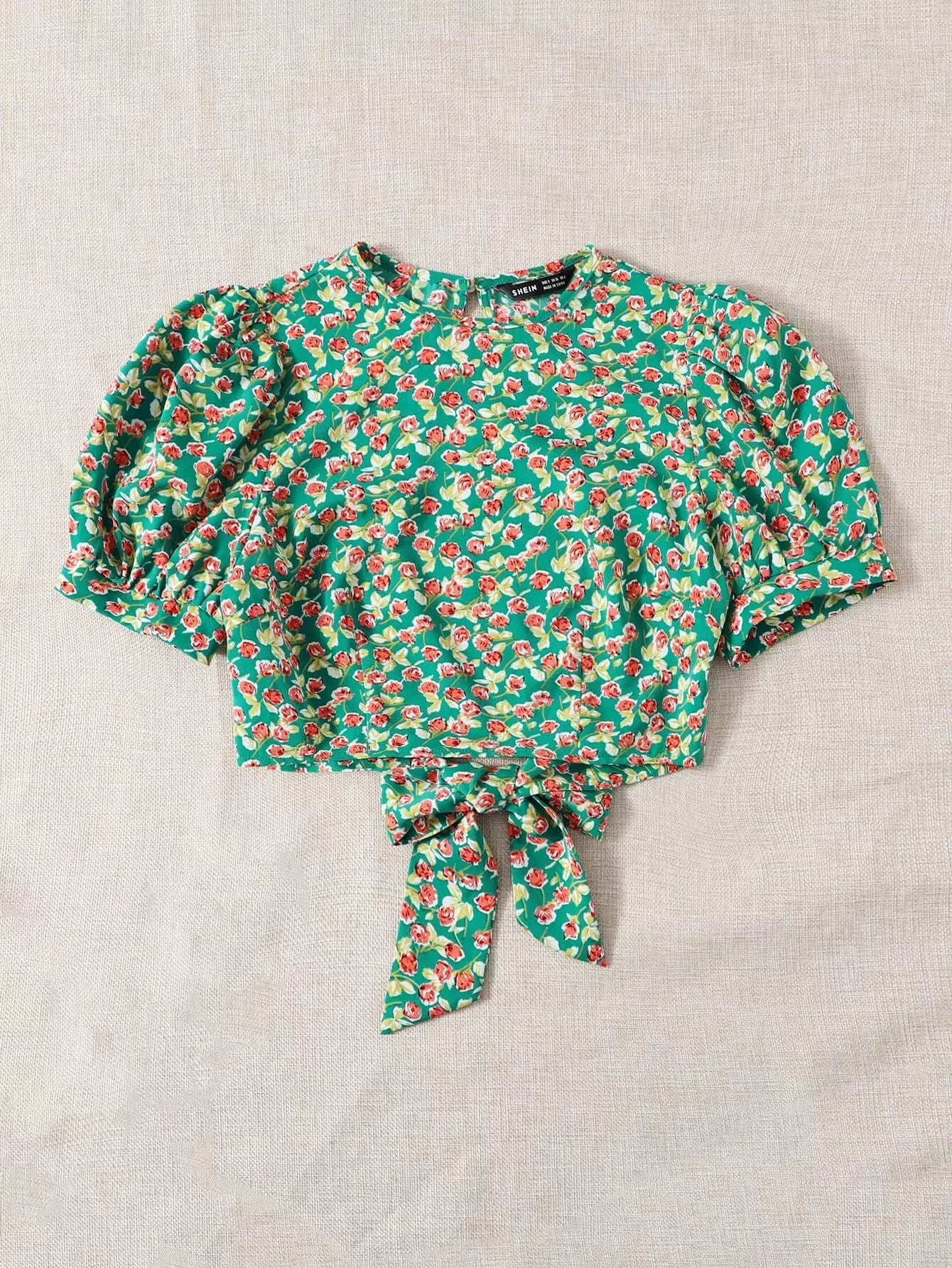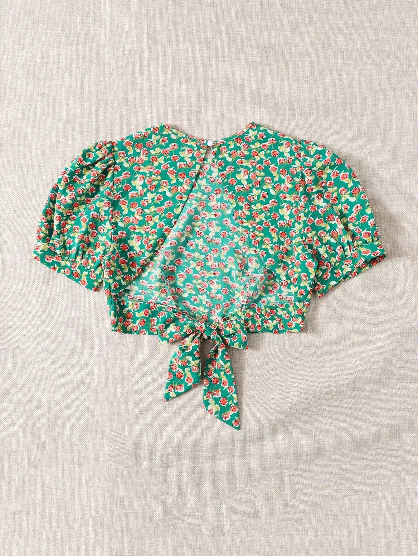 بلوزة بأكمام منفوخة مربوطة من الخلف مكشوفة الأكمام ومزينة بالورود