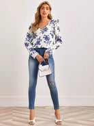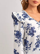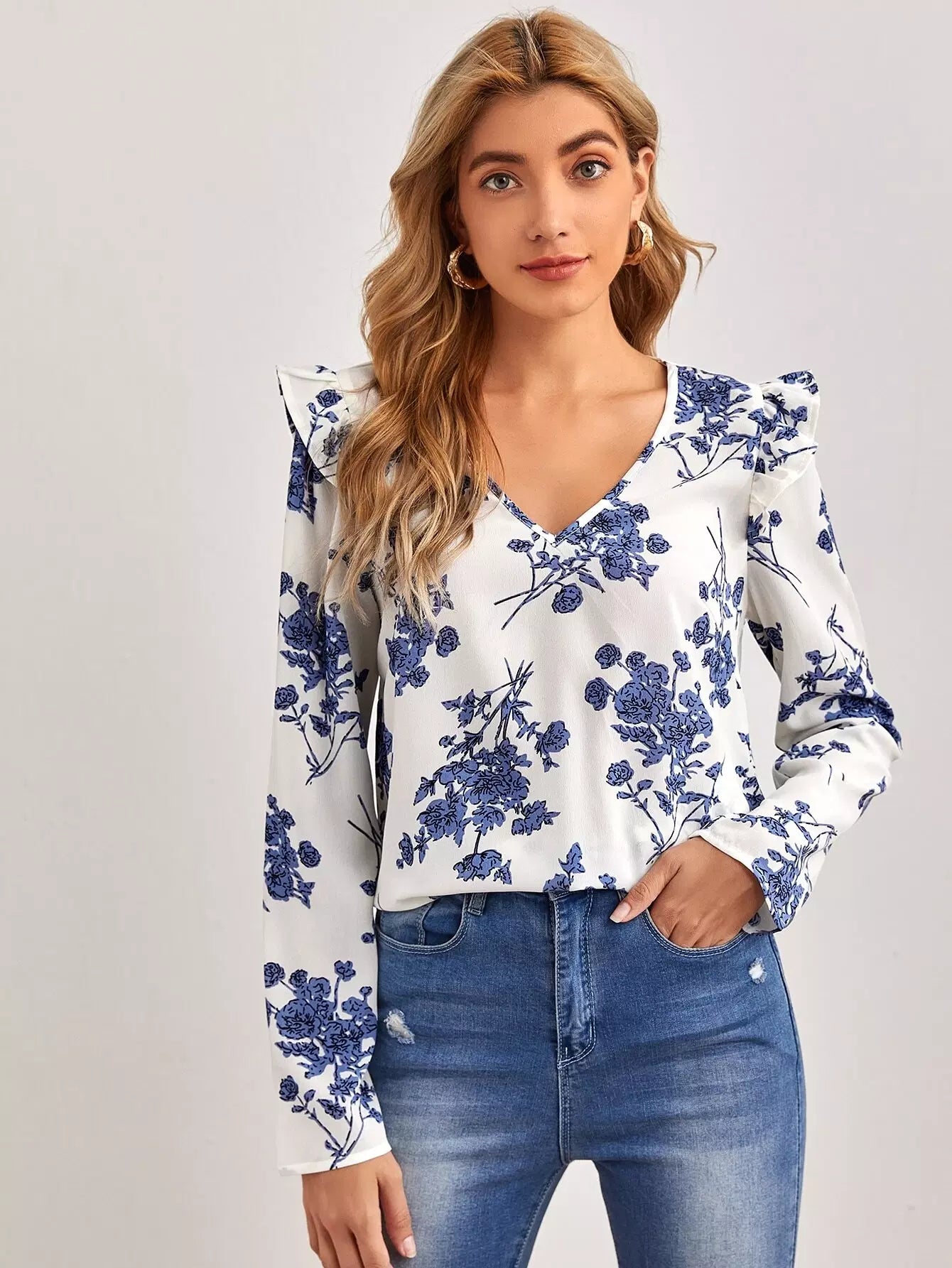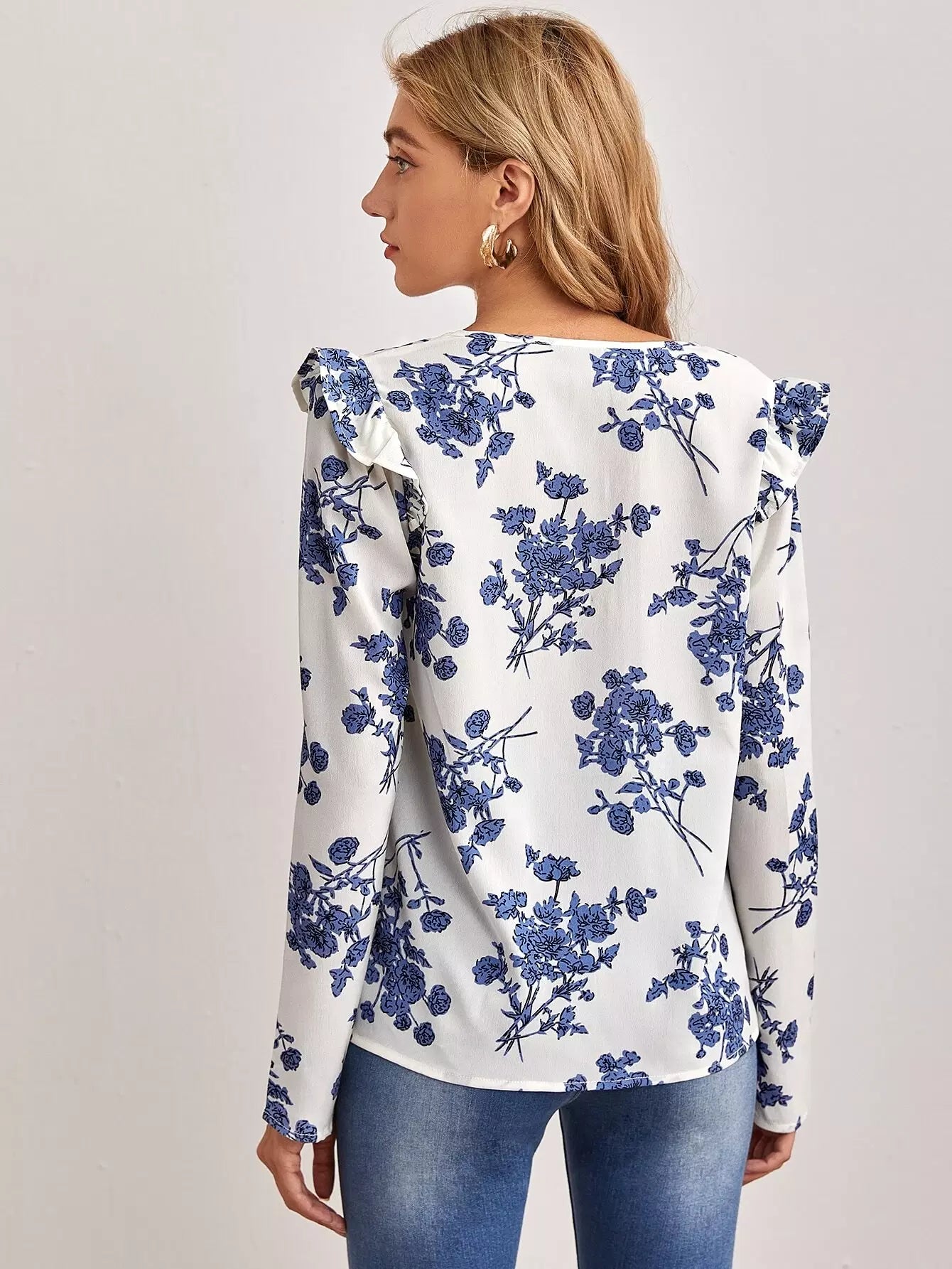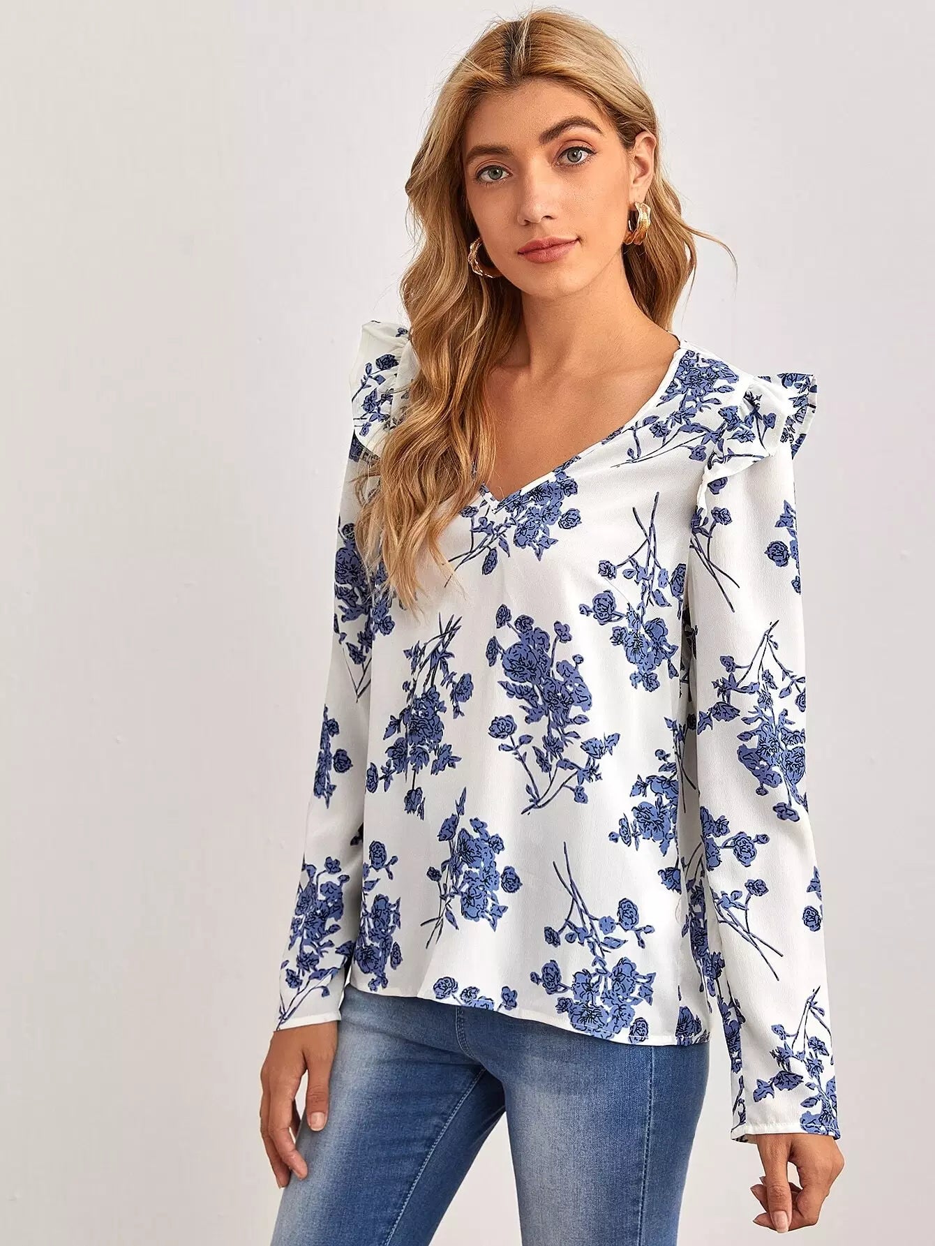 بلوزة مزينة بكشكش مطبوع عليها زهور