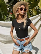 تي شيرت برقبة دائرية بنصف زر محبوك على شكل ضلع