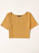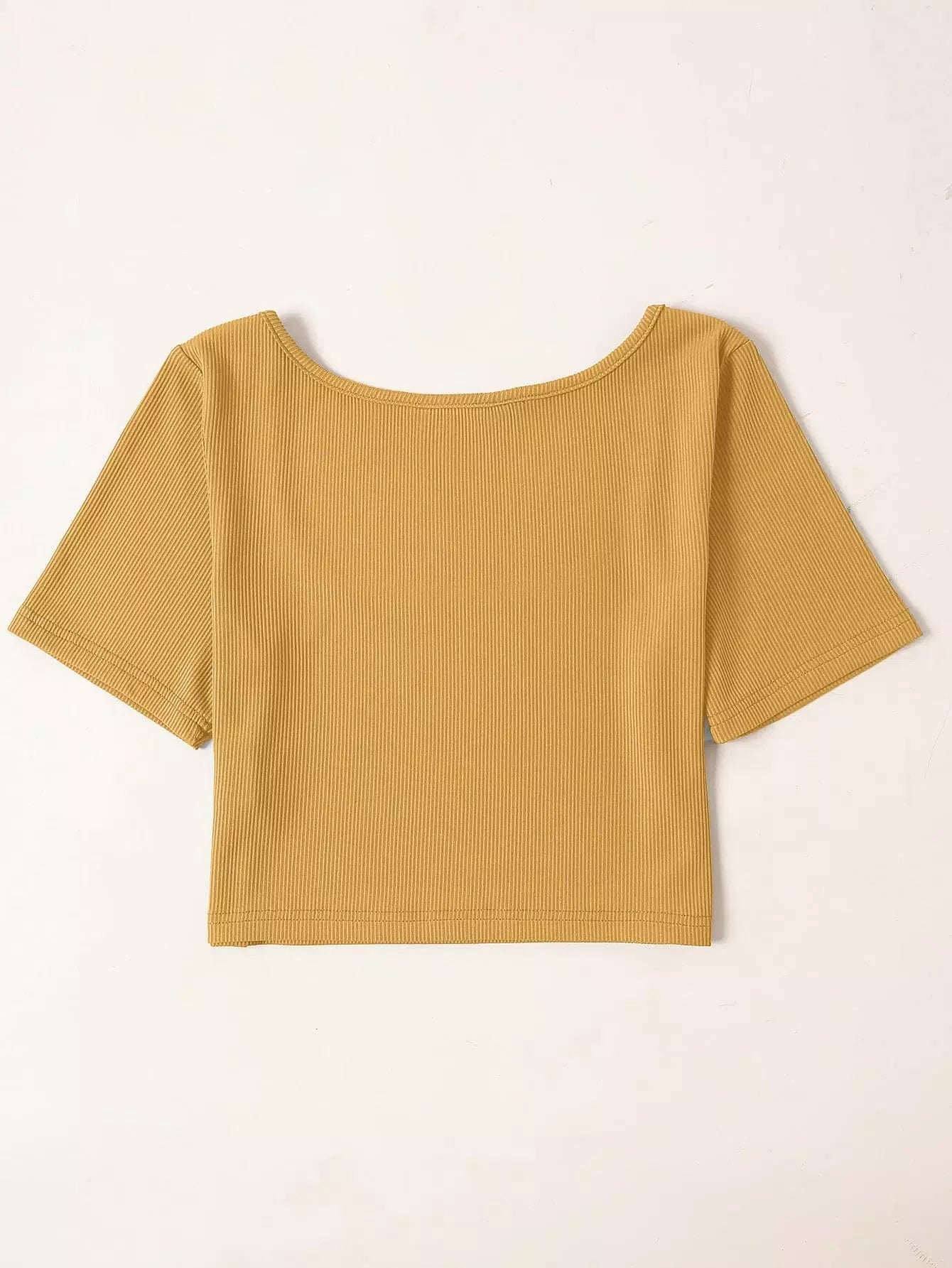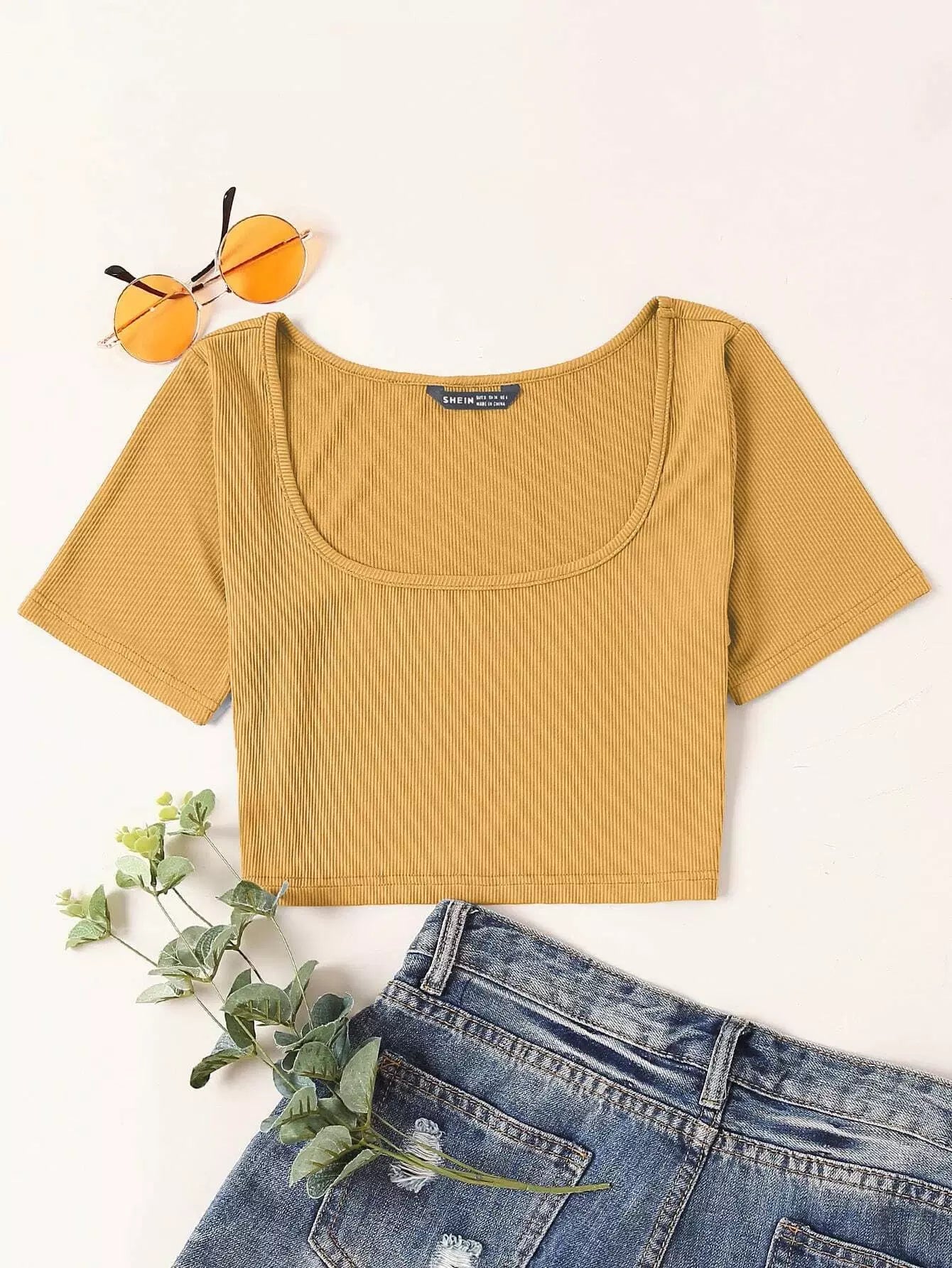 تي شيرت قصير محبوك بفتحة رقبة دائرية