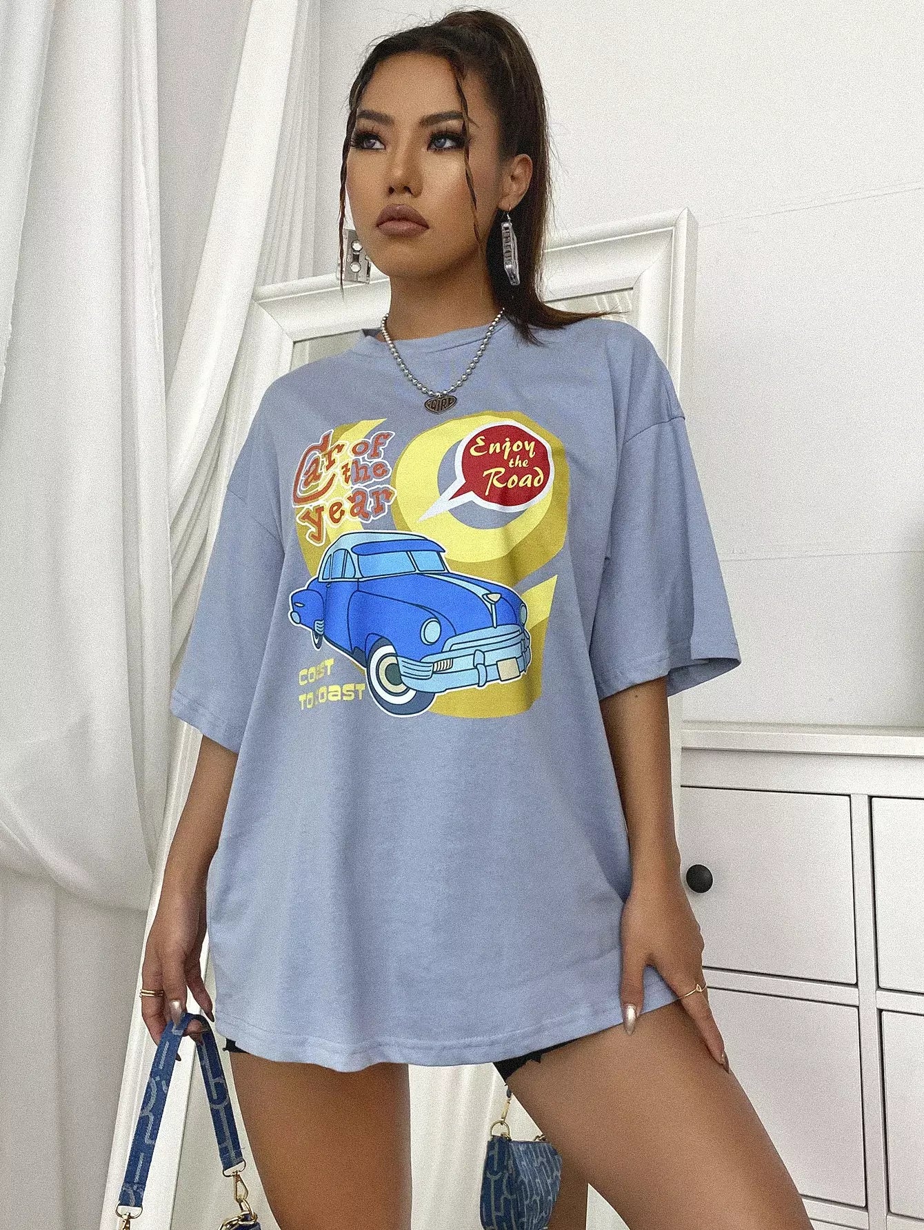 تي شيرت طويل منسدل الكتفين مطبوع عليه شعار وسيارة