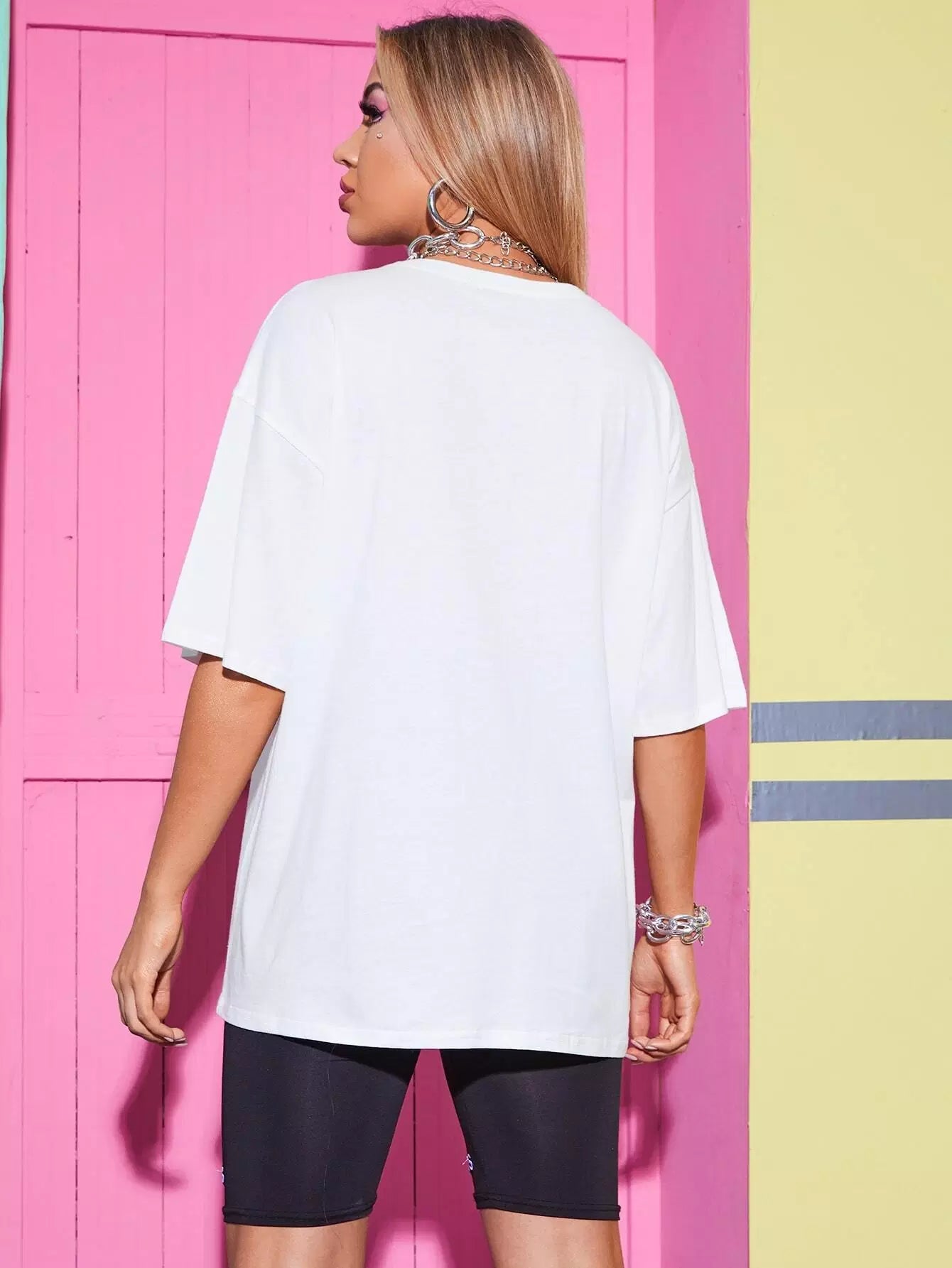 للنساء - تي شيرت طويل كبير الحجم بكتف منسدل ورسومات الشعار