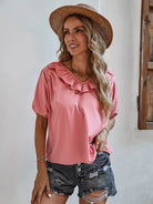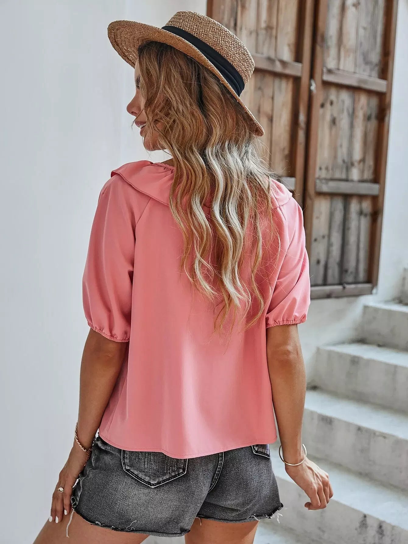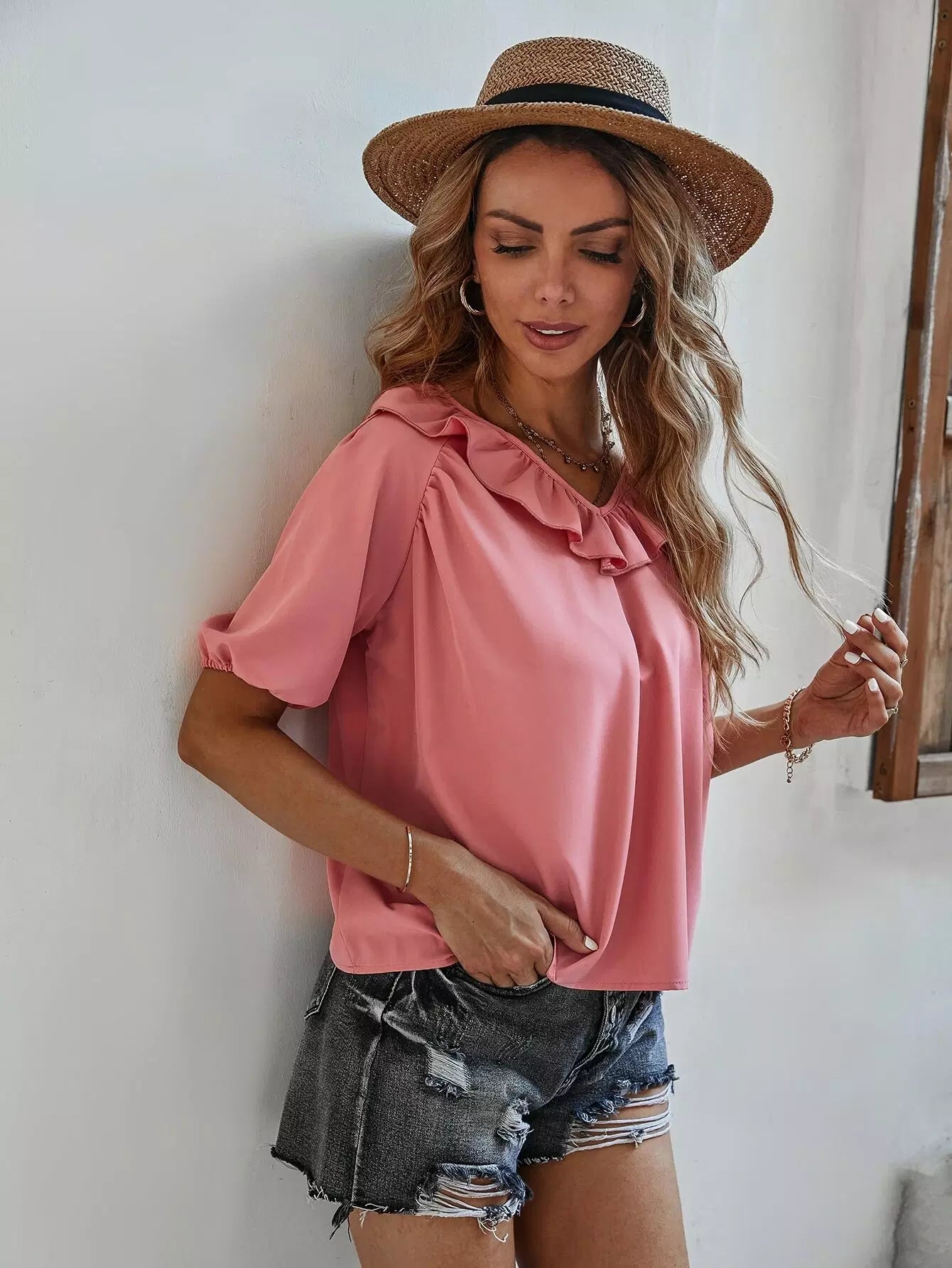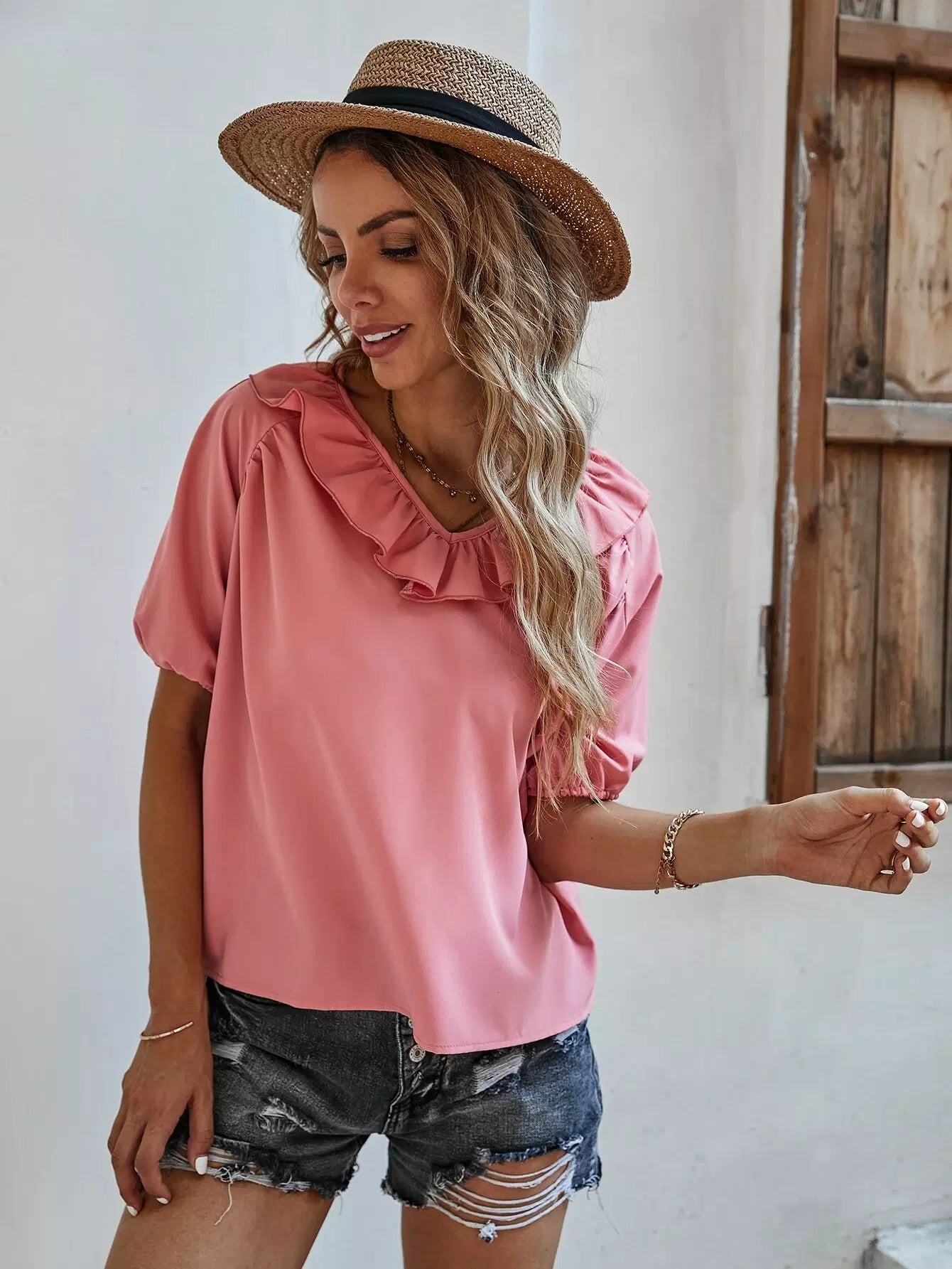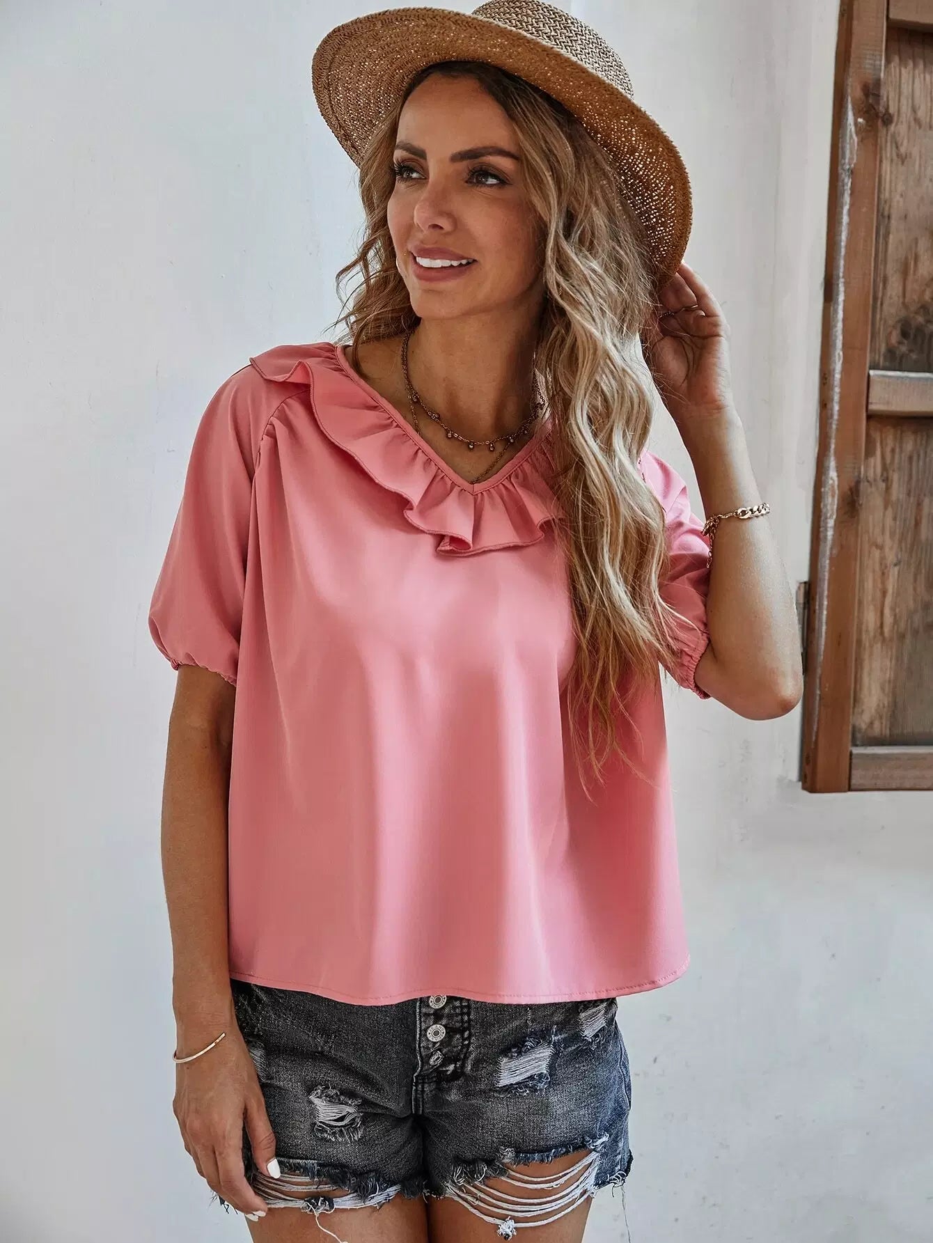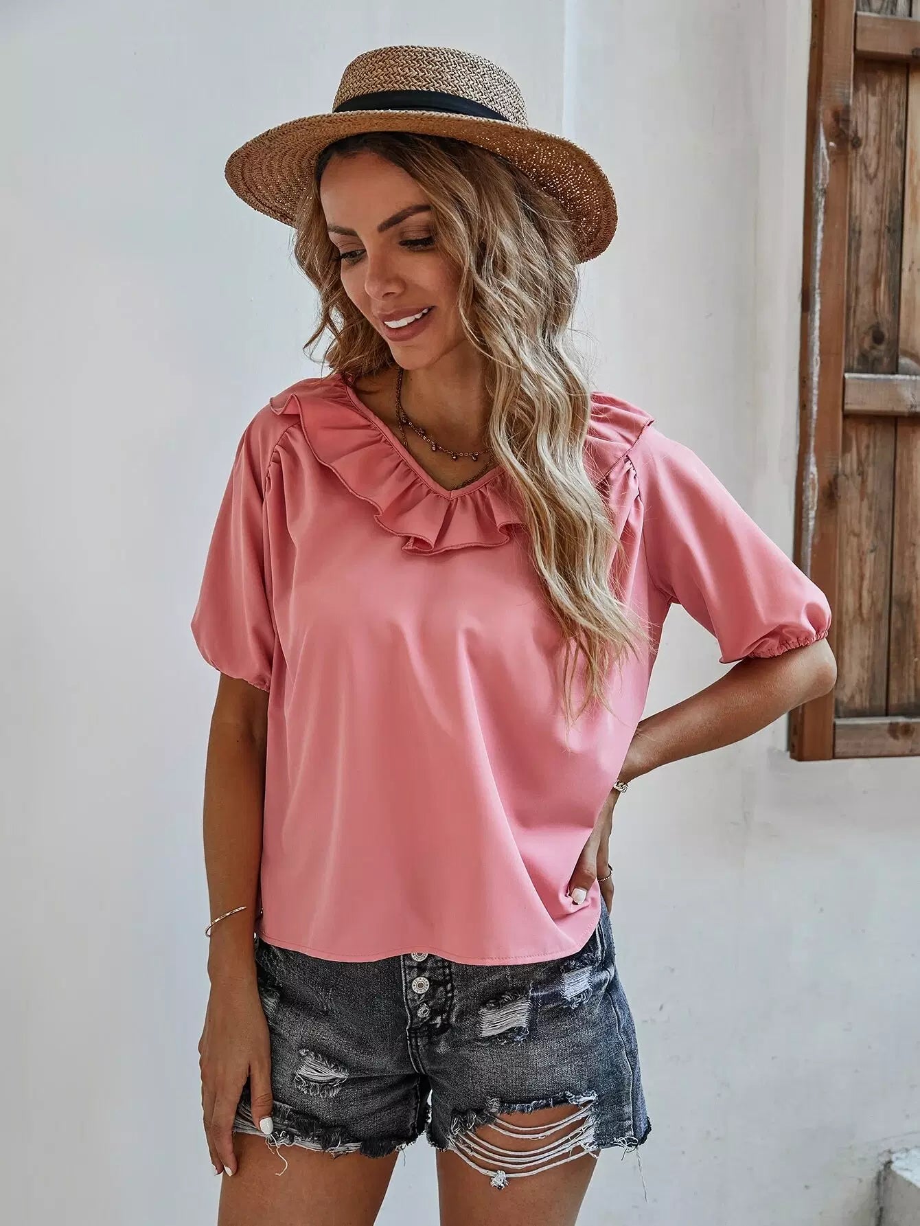 بلوزة سادة بأكمام راجلان وحواف مكشكشة