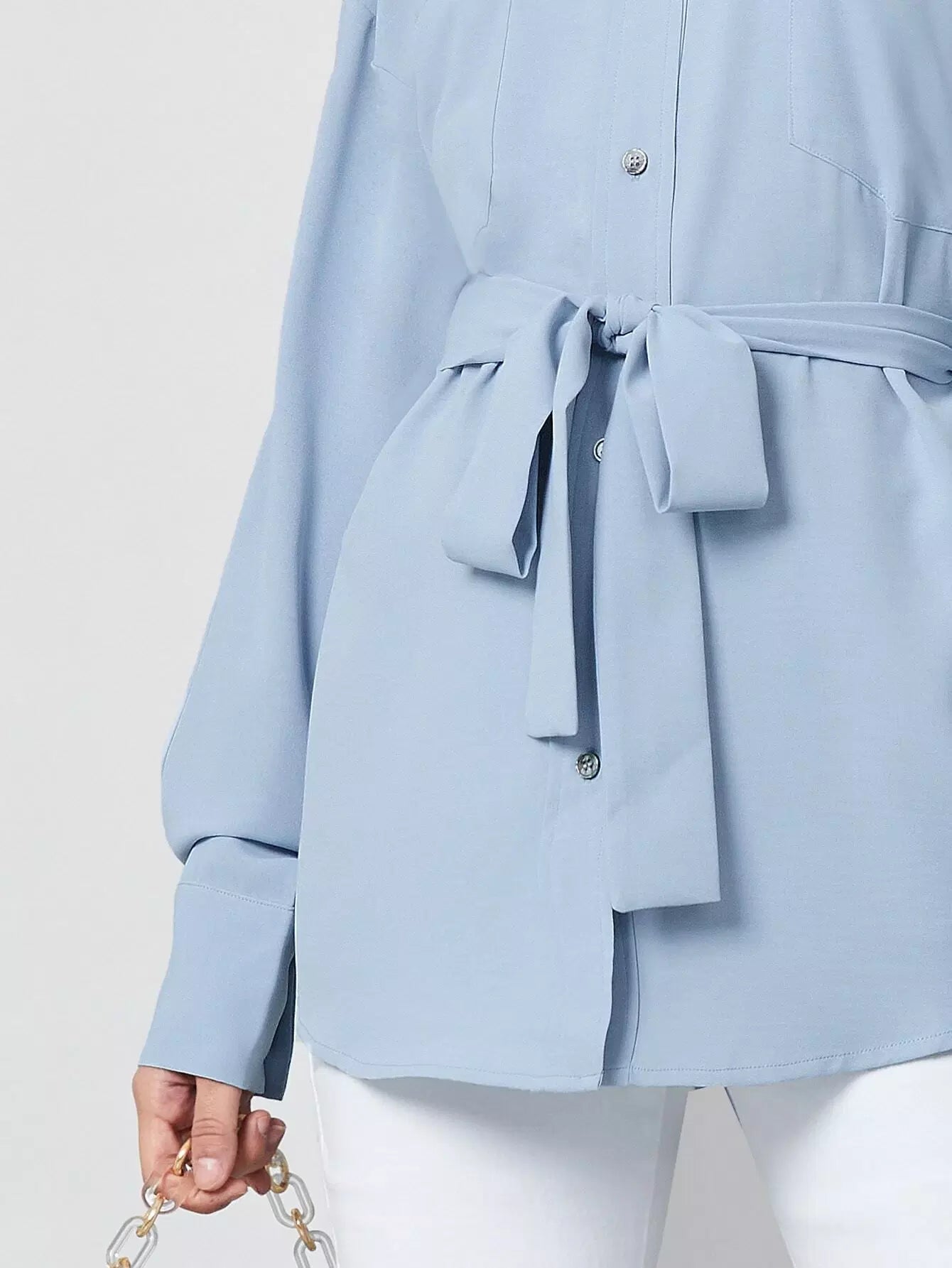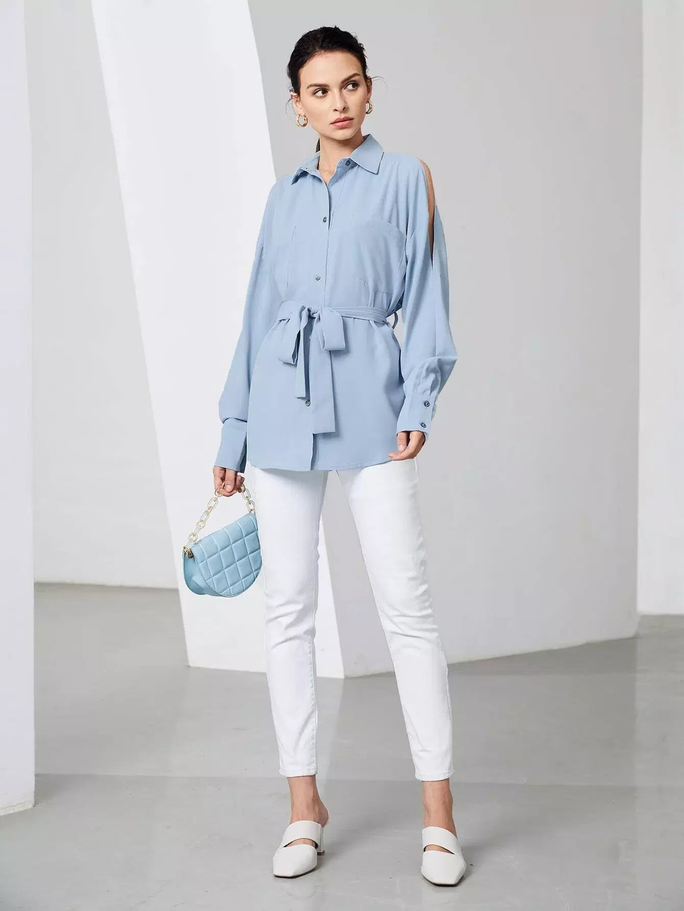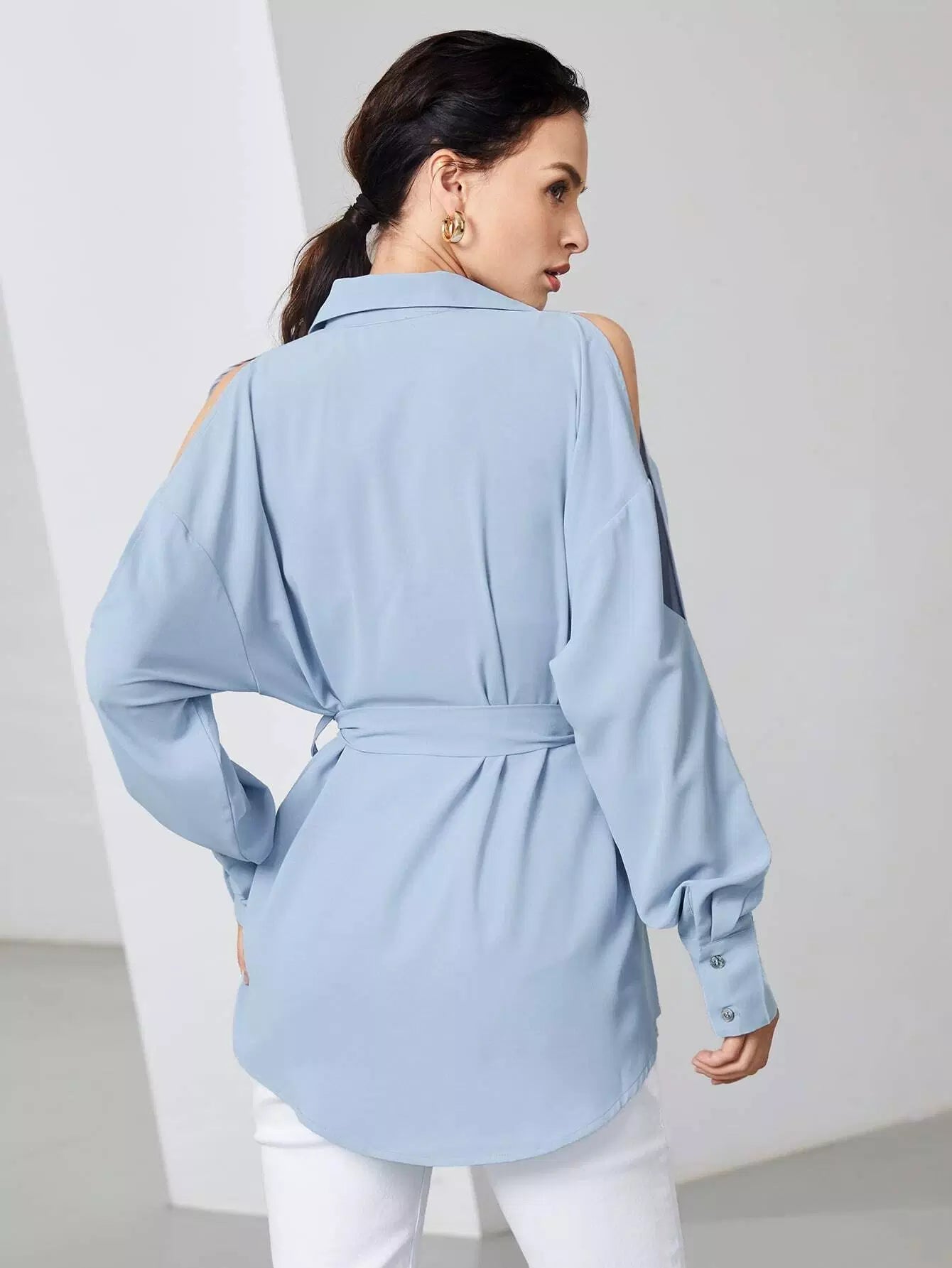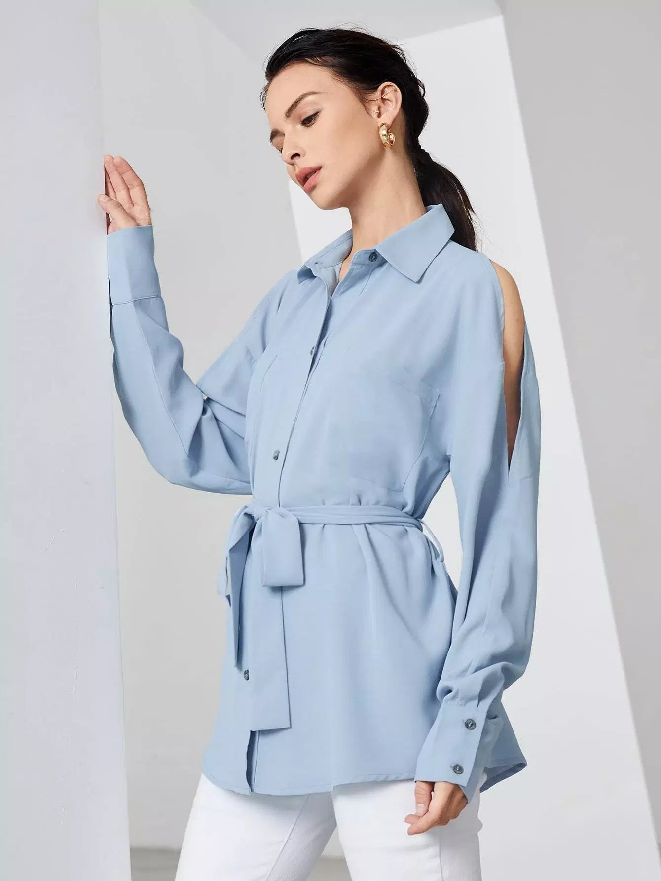 قميص بأكمام مقسمة وأزرار لأعلى بدون حزام