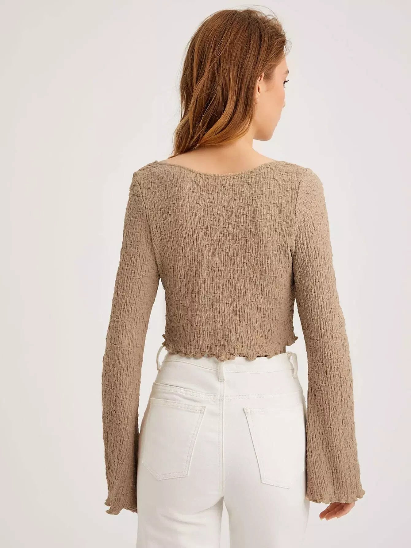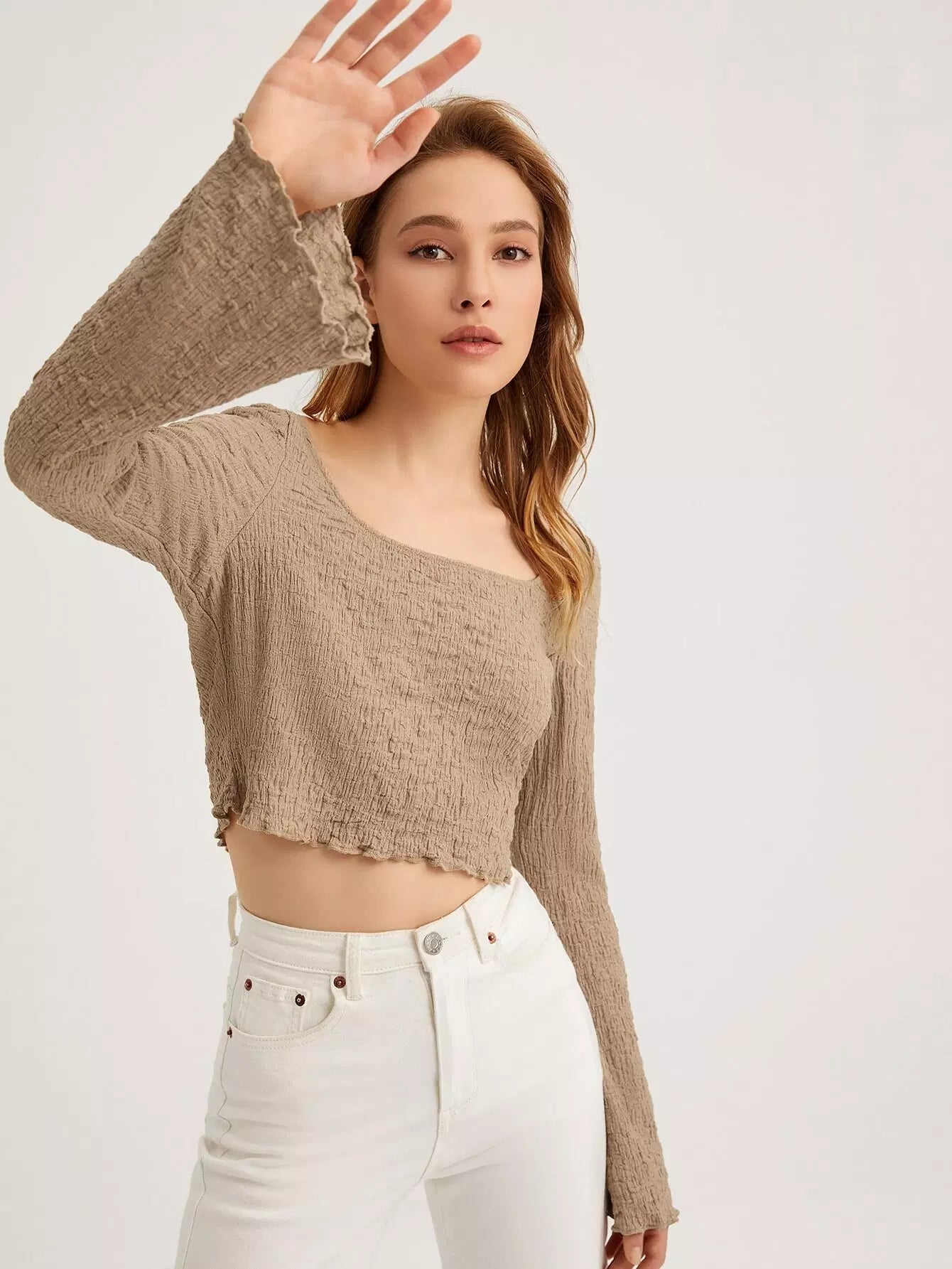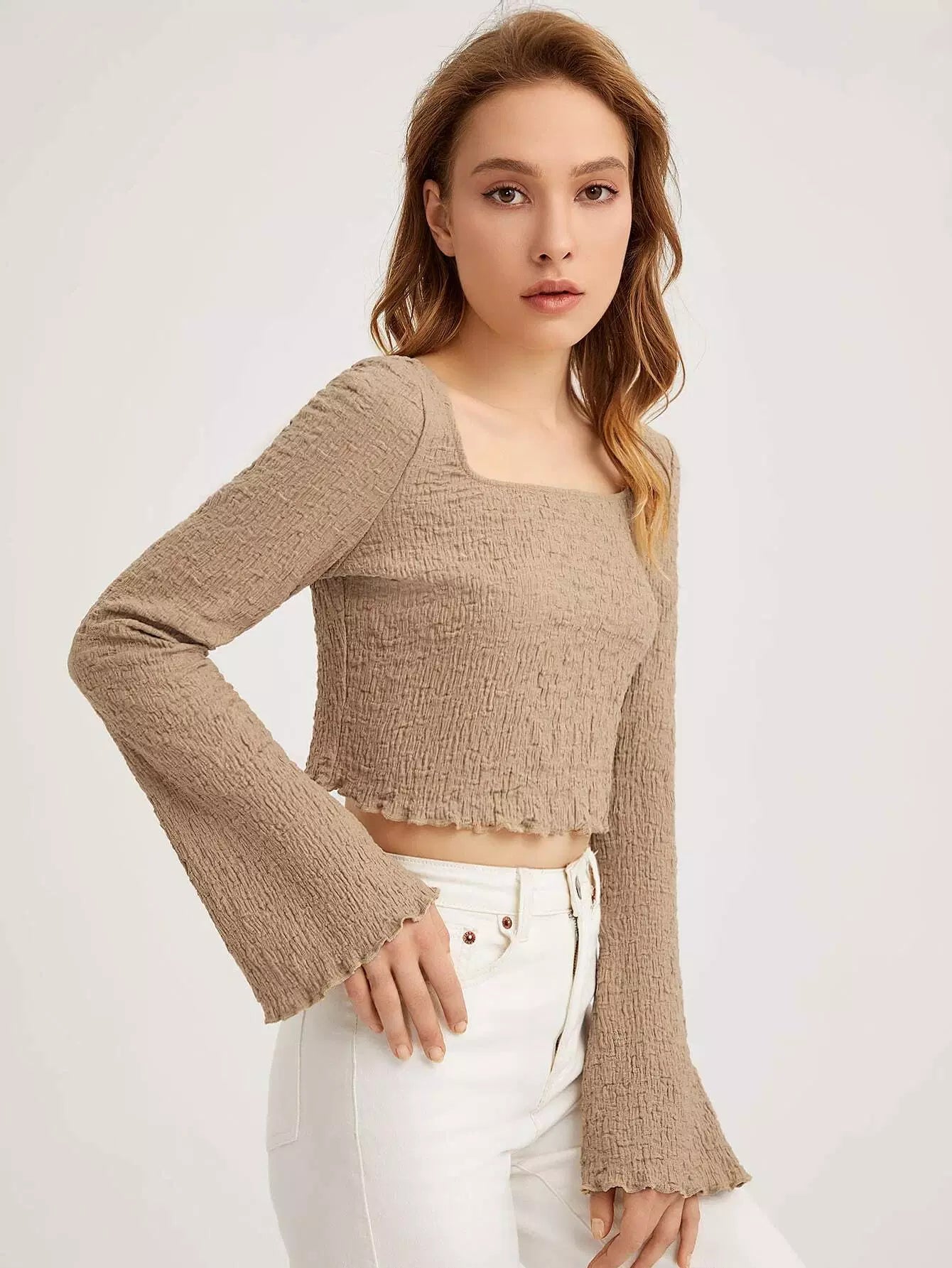 بلوزة بياقة مربعة بياقة مربعة بأكمام جرس بحواف من الخس