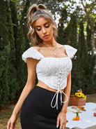 بلوزة بياقة مربعة برقبة مربعة مكشكشة على الصدر مزينة بفتحات دانتيل أمامية غير متناسقة