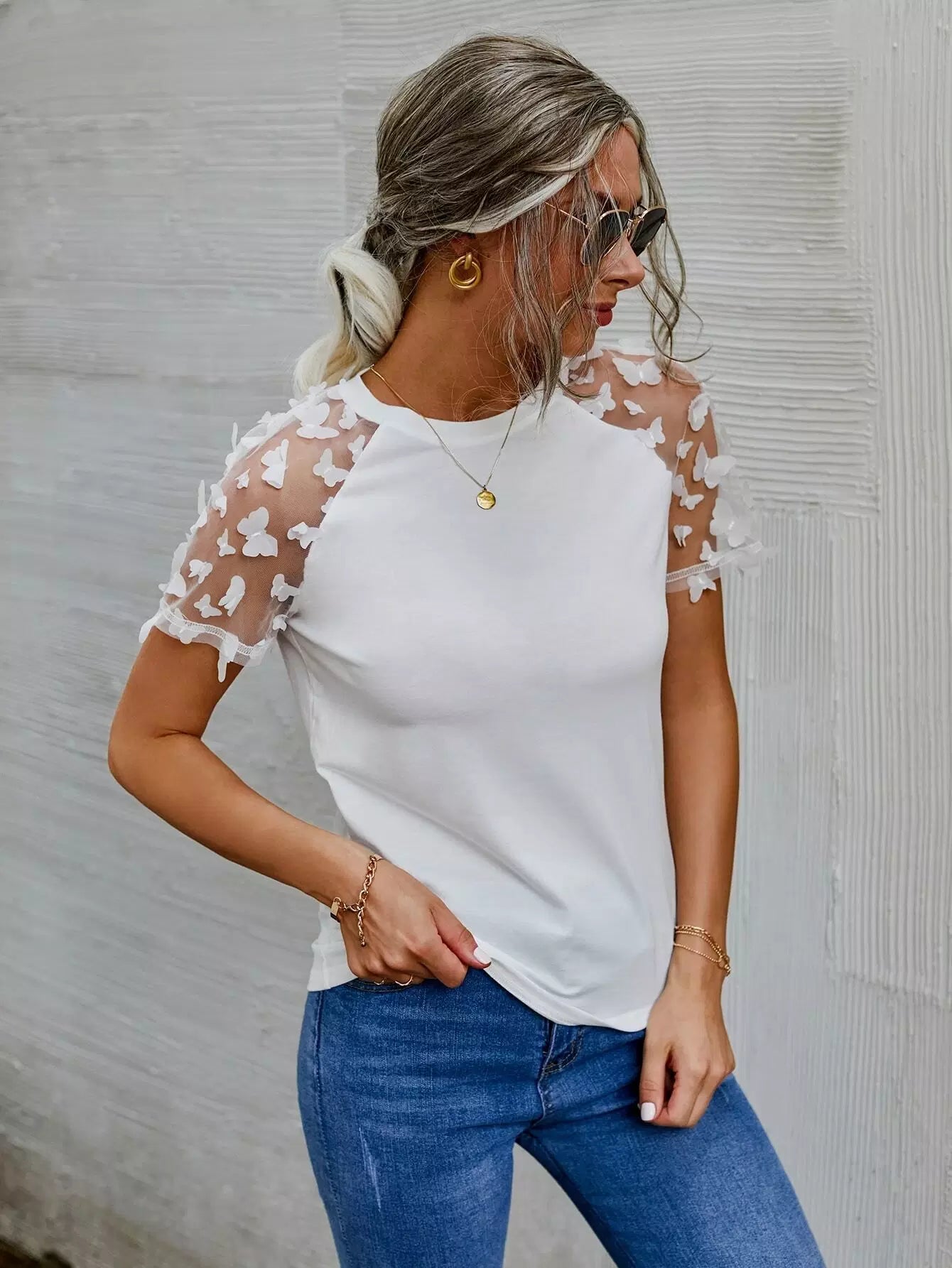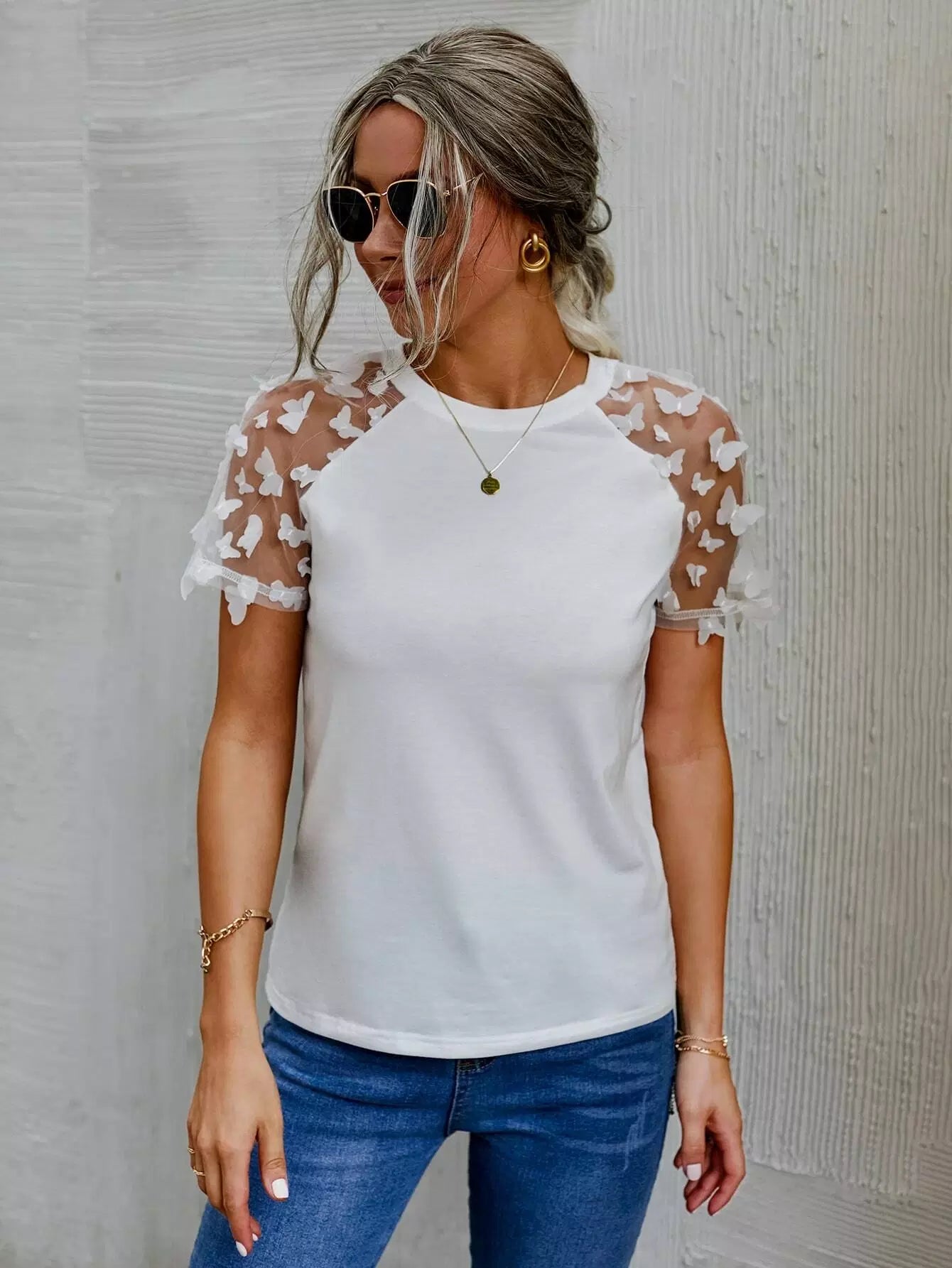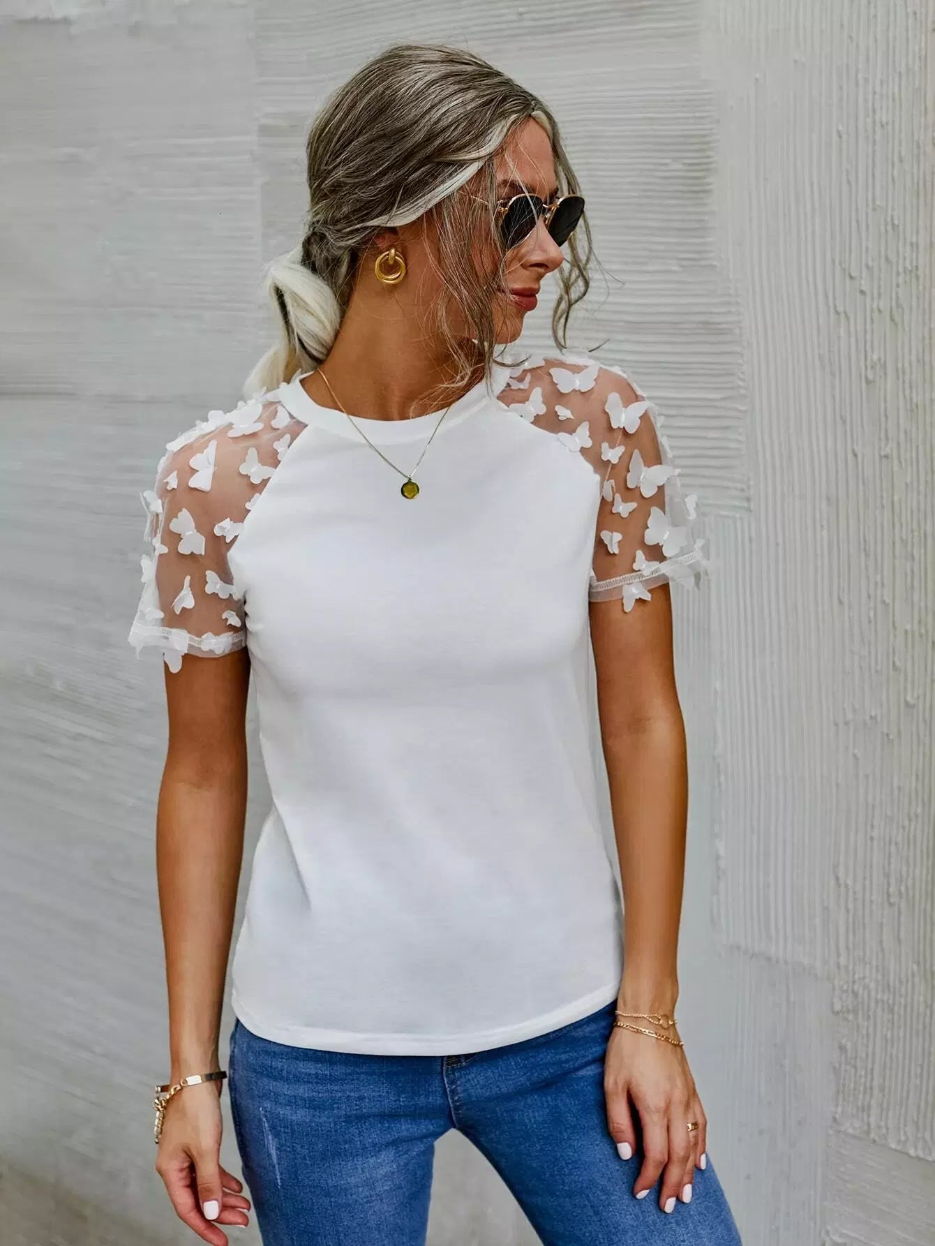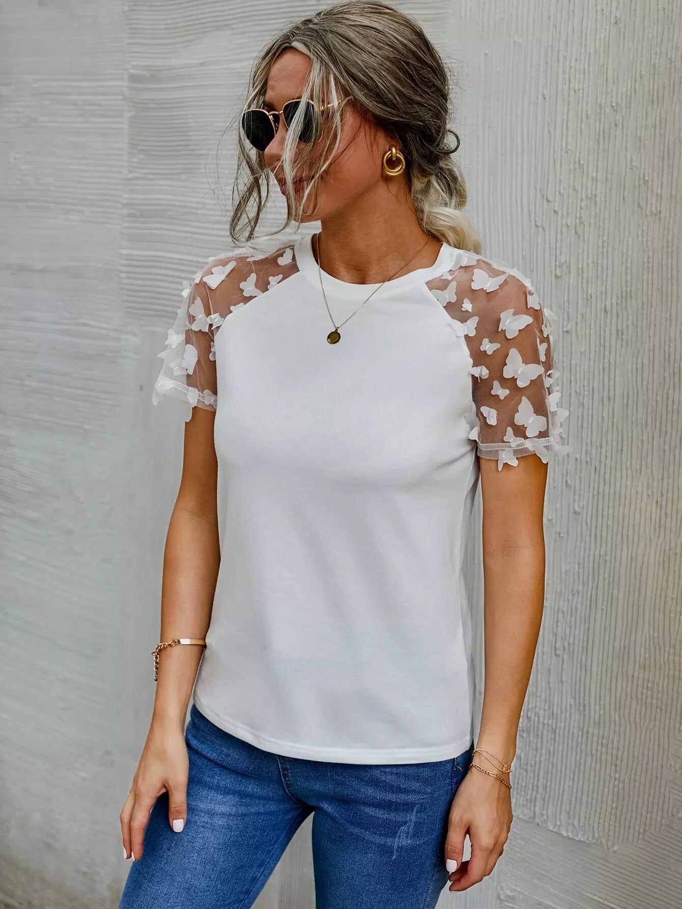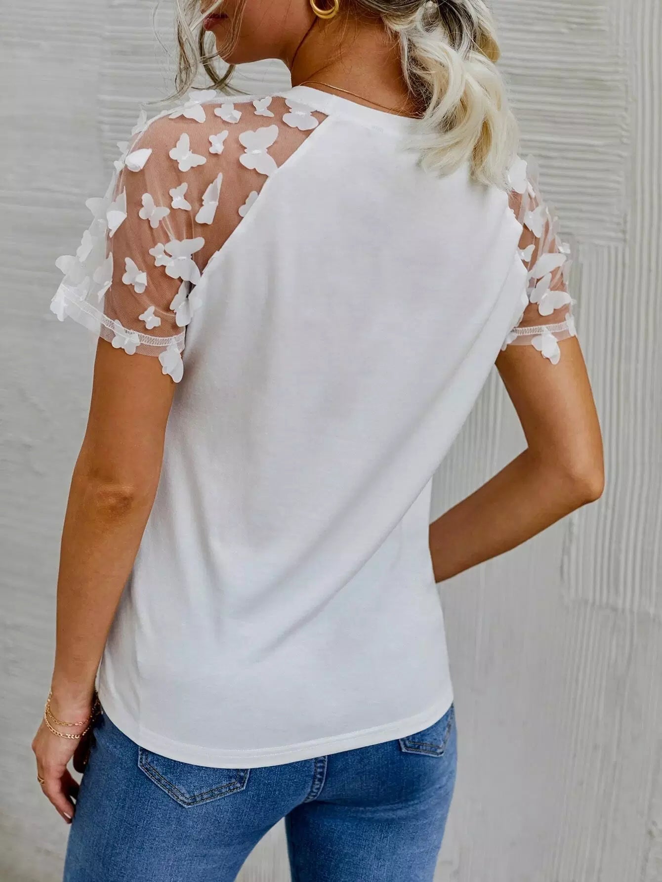 تي شيرت بتصميم فراشة شبكية بأكمام راجلان