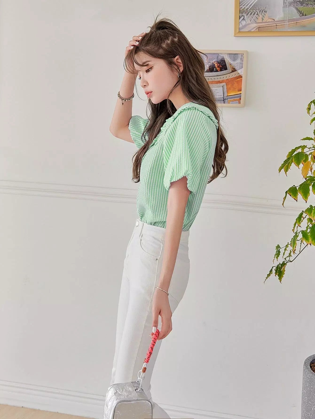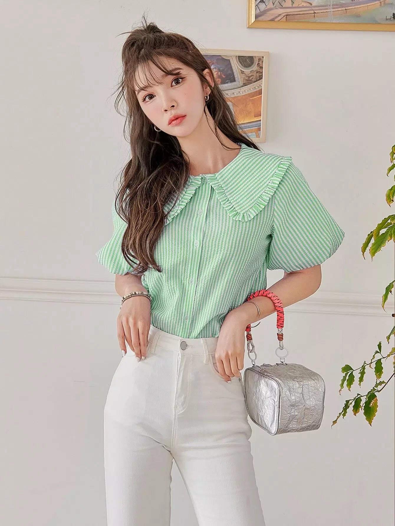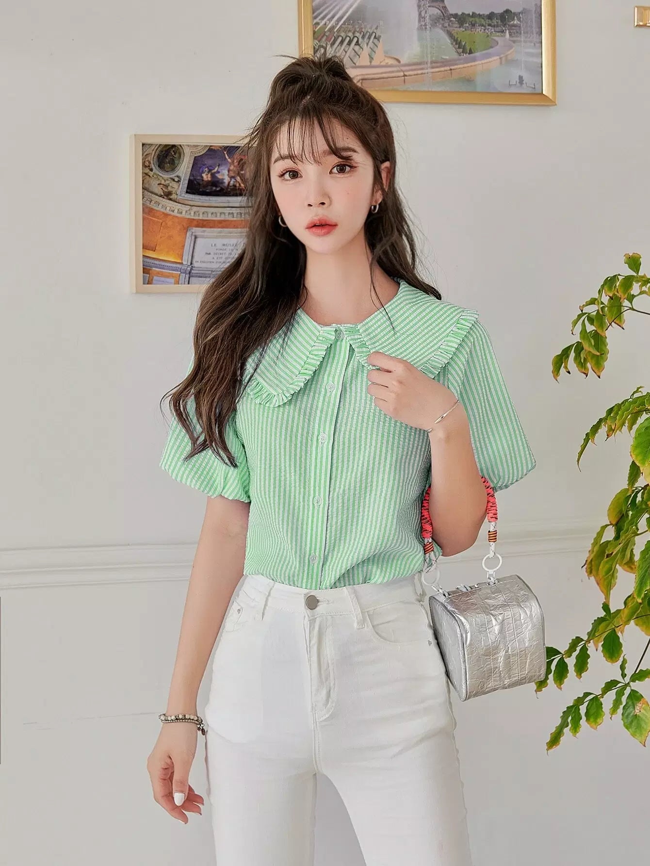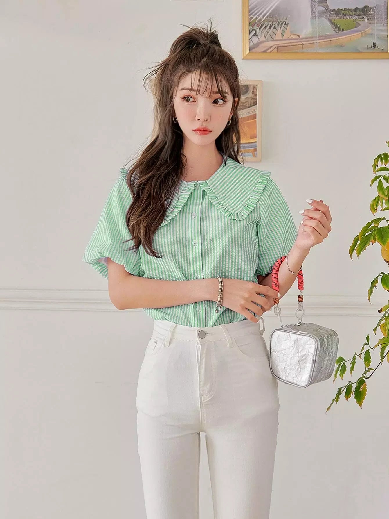 بلوزة بأكمام مخططة بأزرار بأزرار مخططة