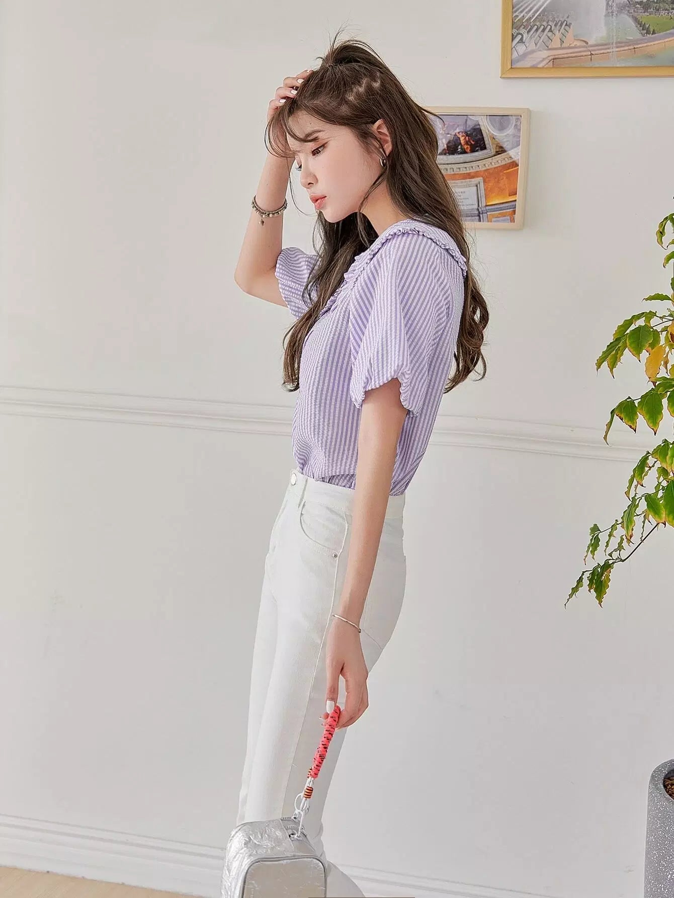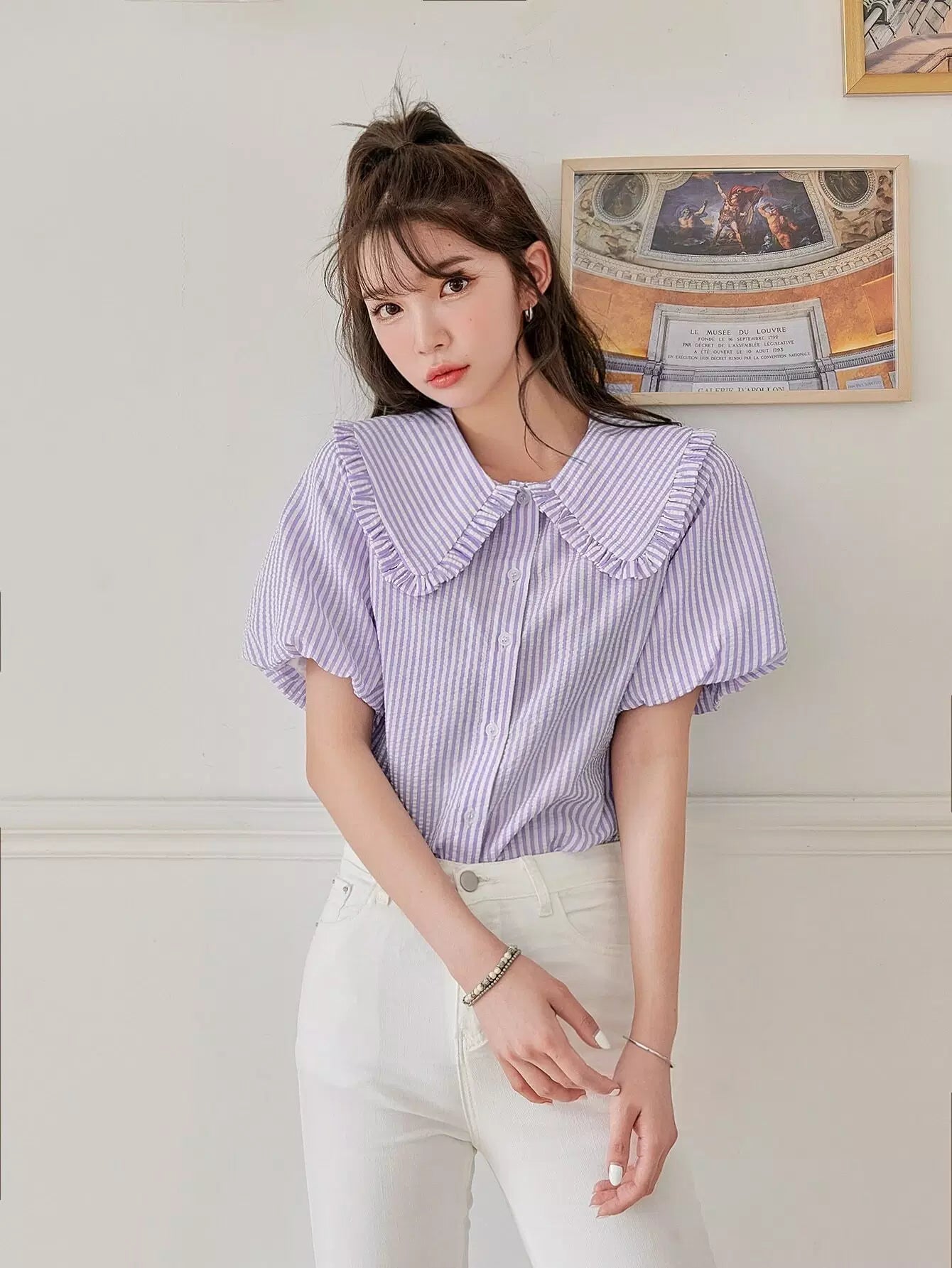 بلوزة بأكمام مخططة بأزرار بأزرار مخططة