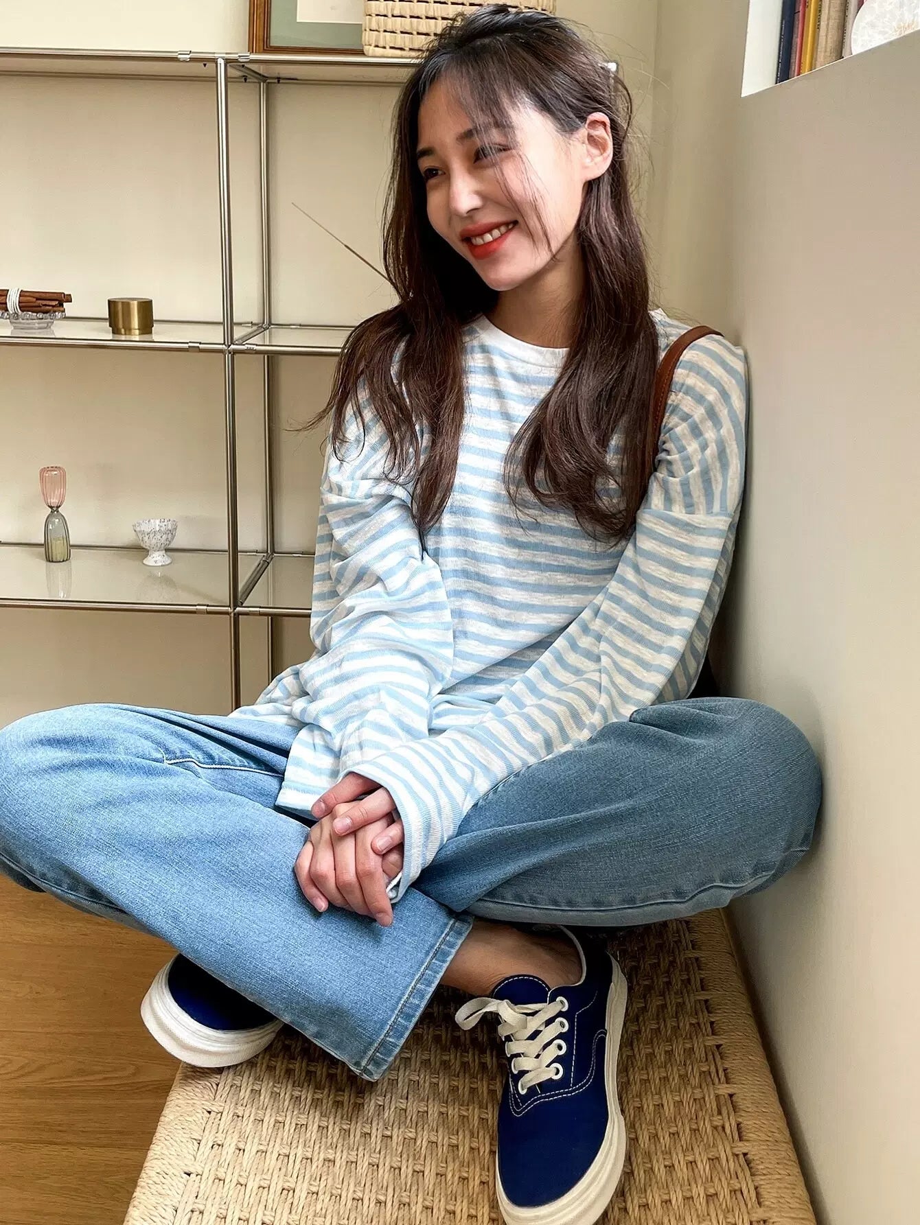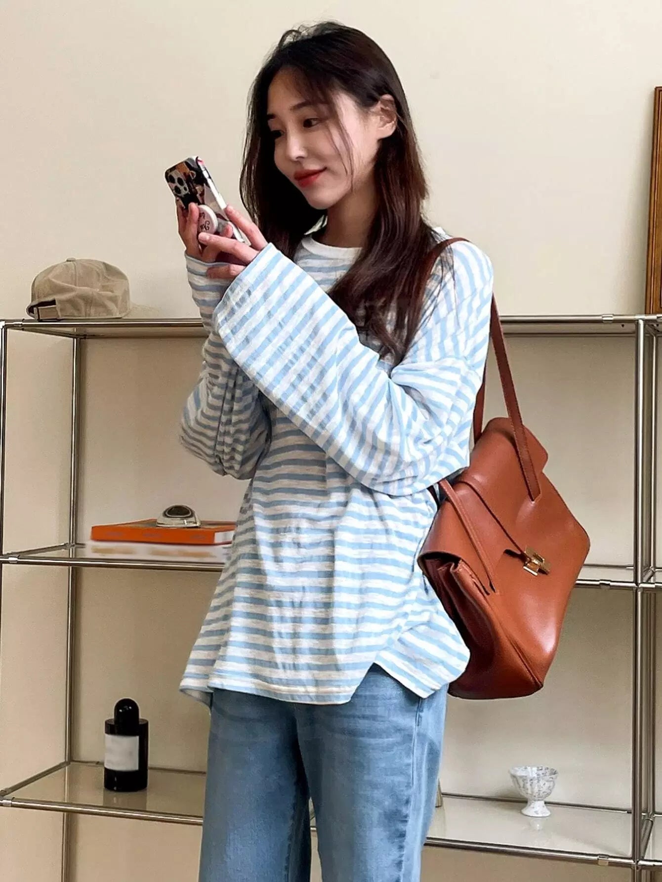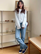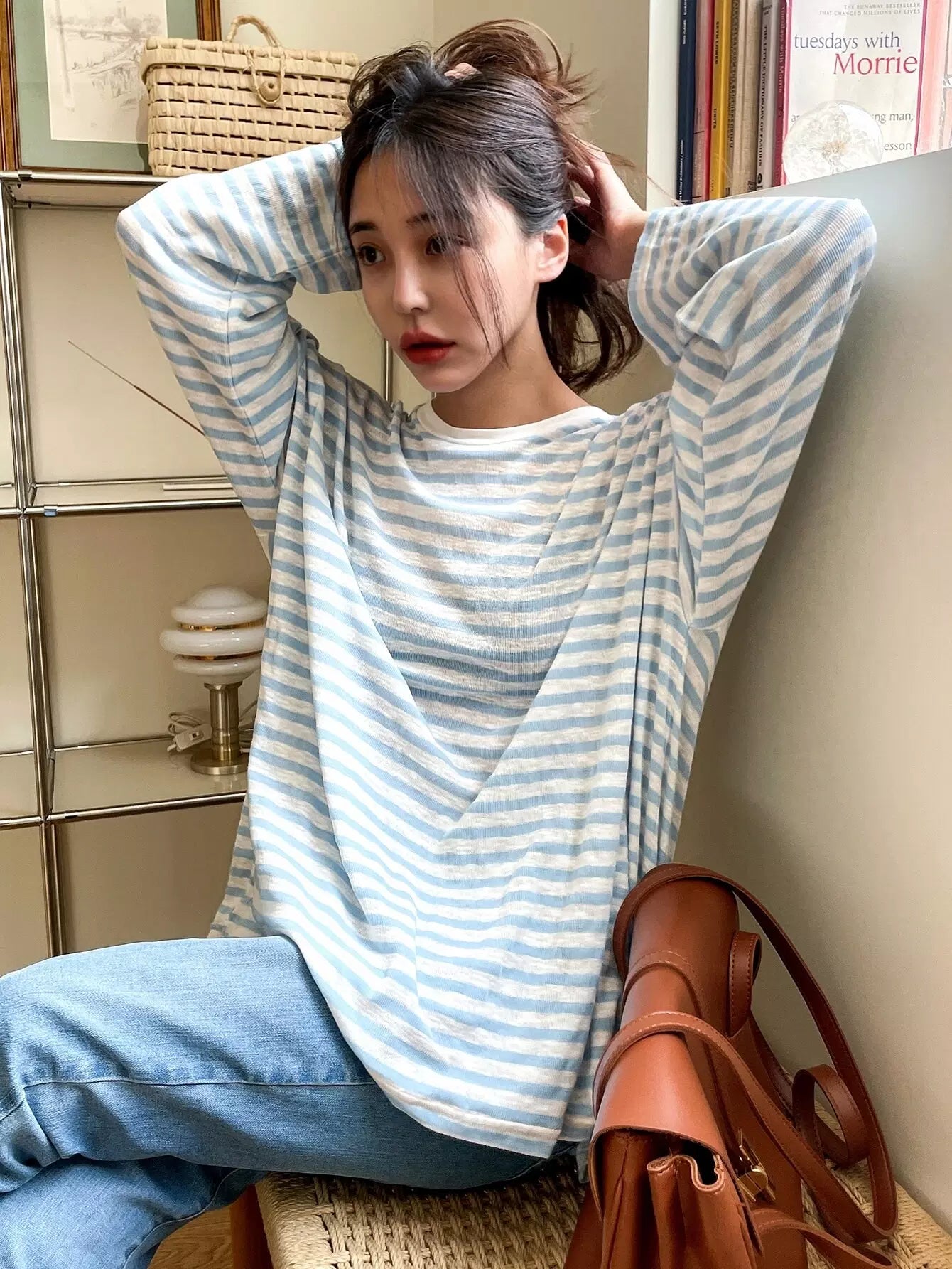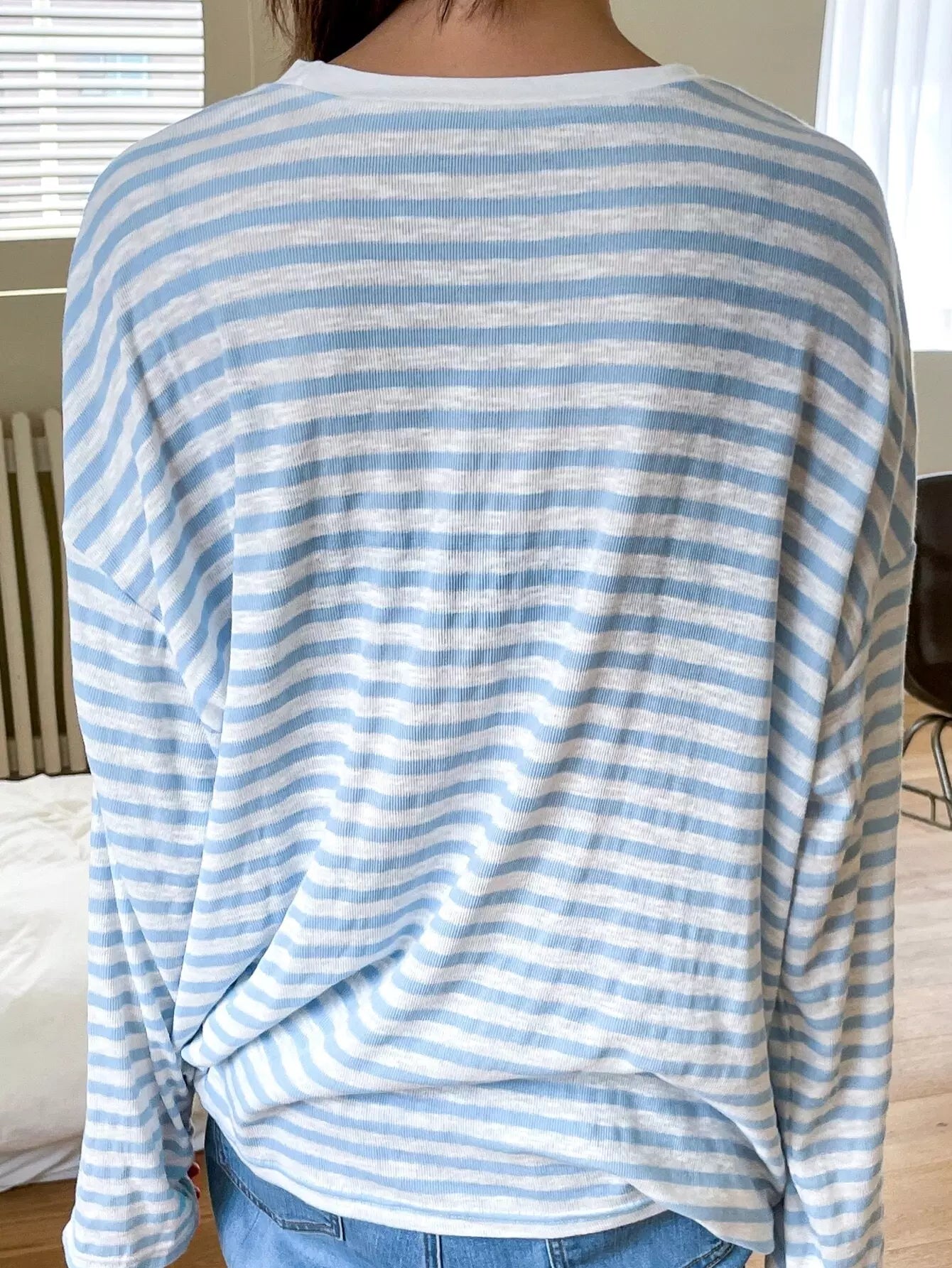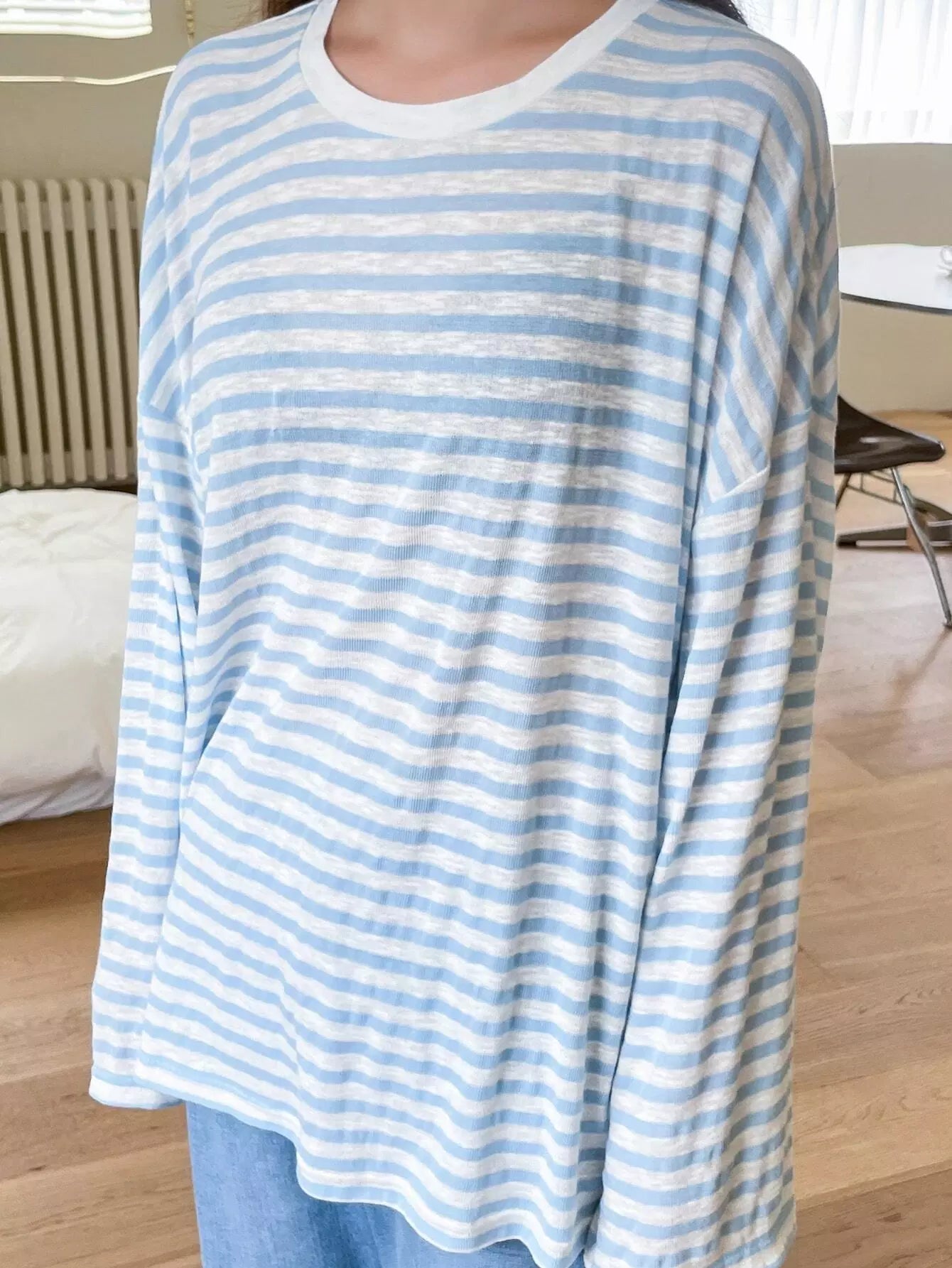 تي شيرت بحافة منسدلة منسدلة على الكتفين بطبعة مخططة
