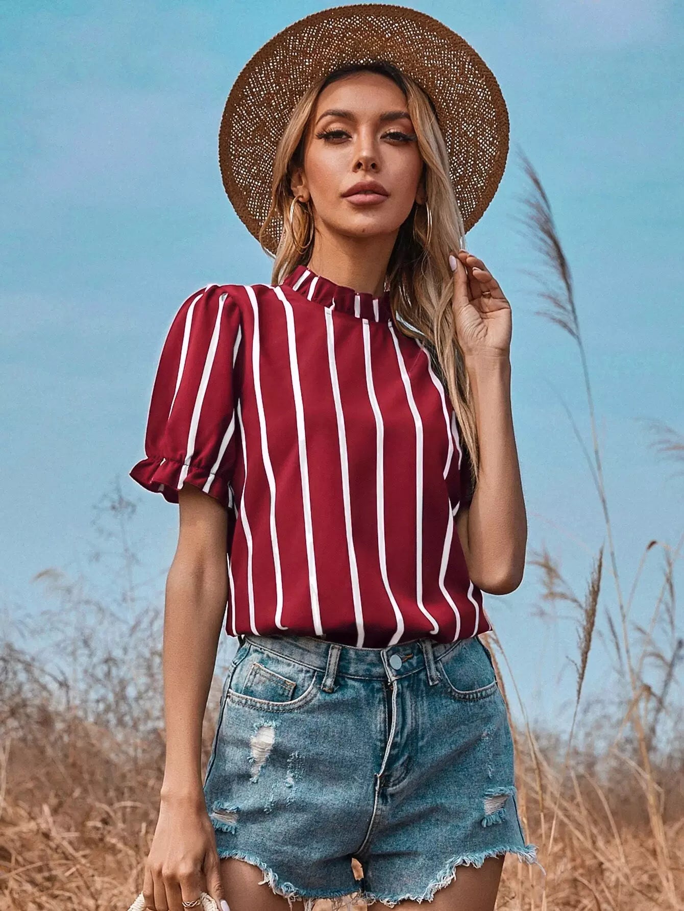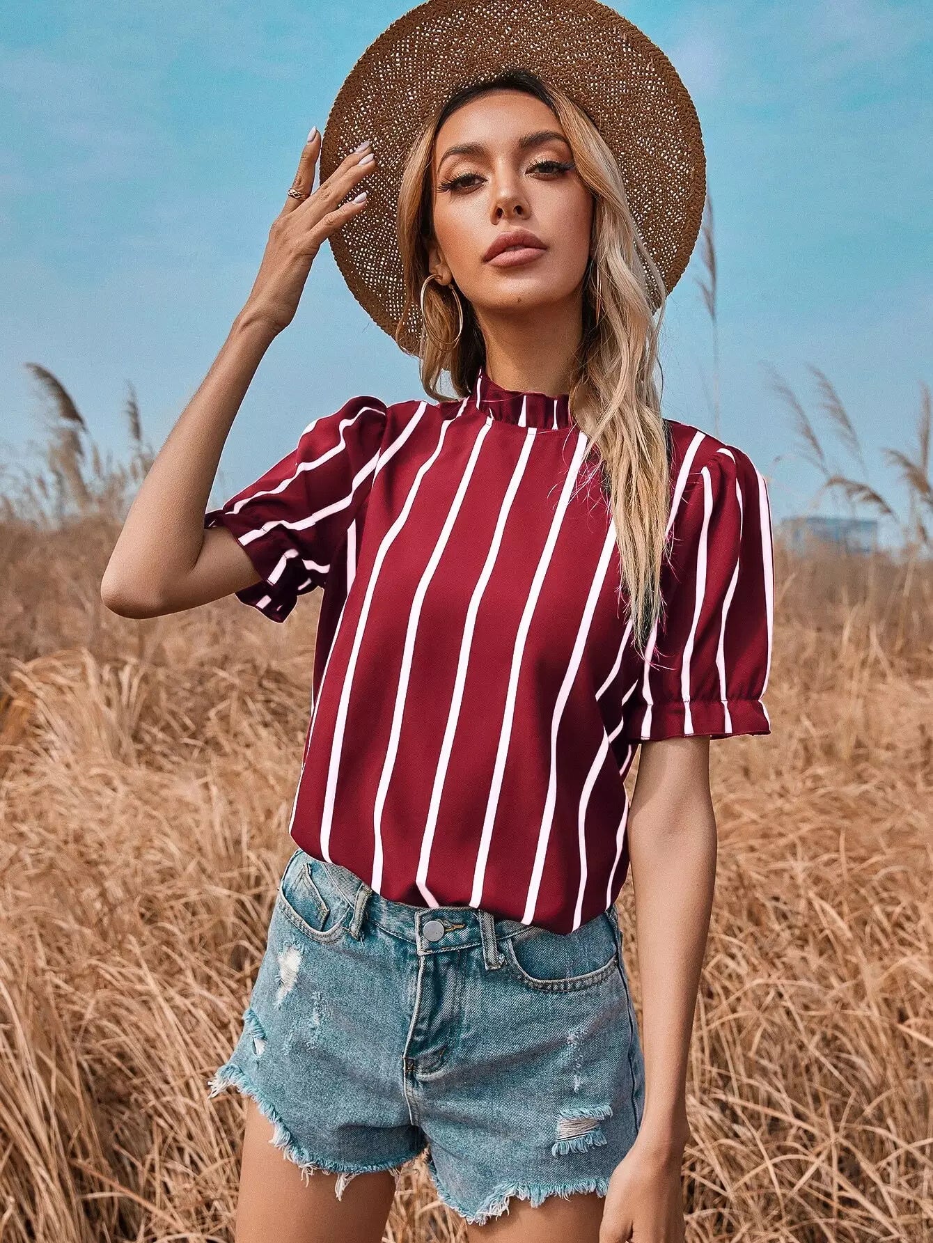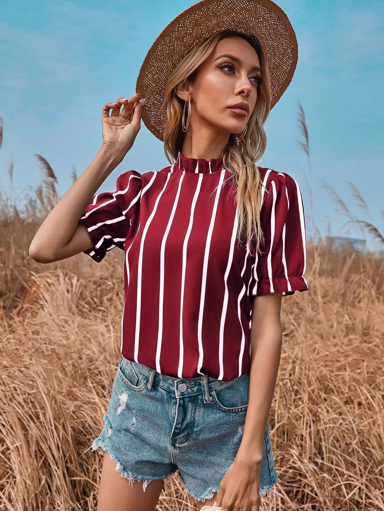 بلوزة مخططة بياقة قائمة وأكمام مكشكشة