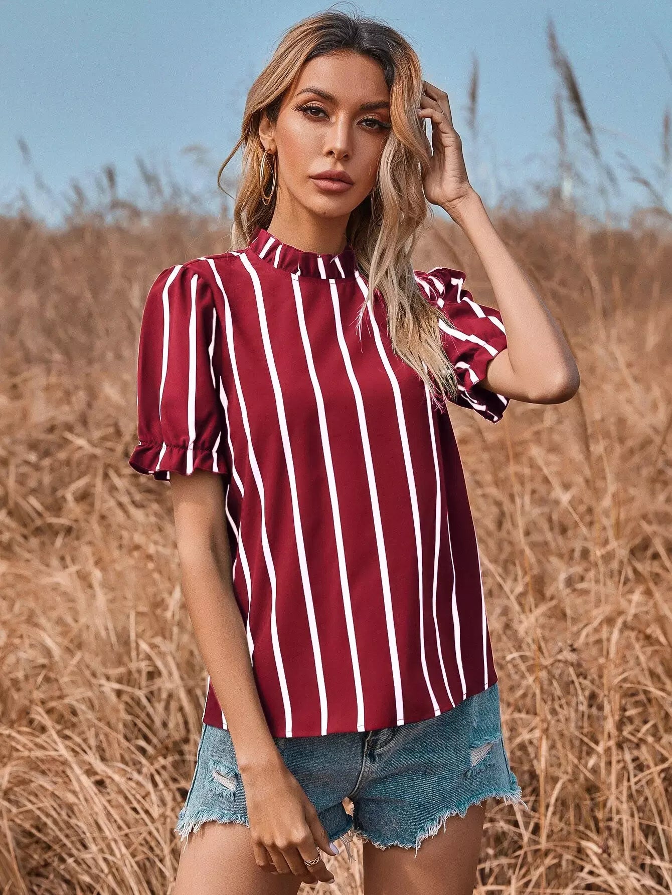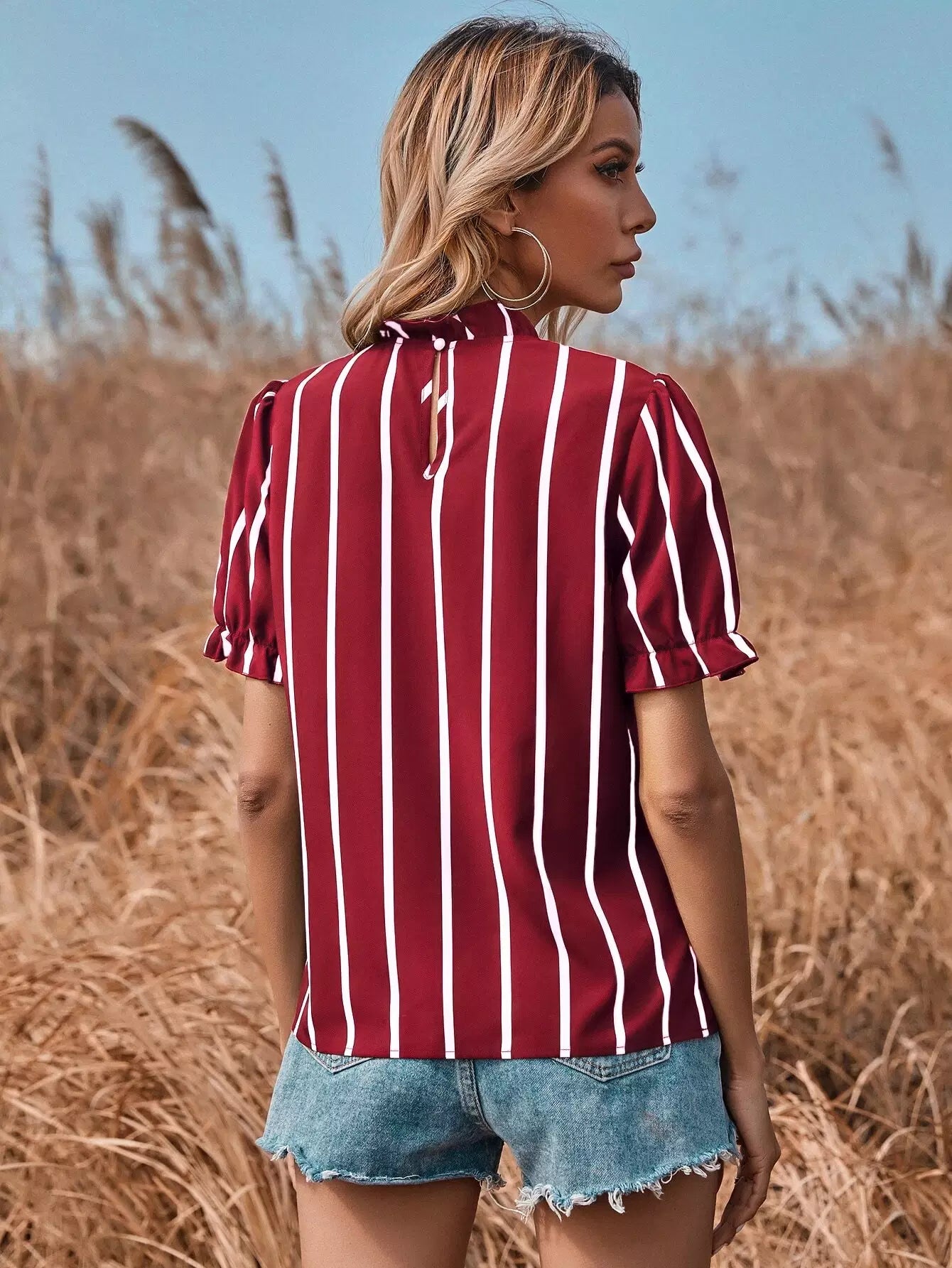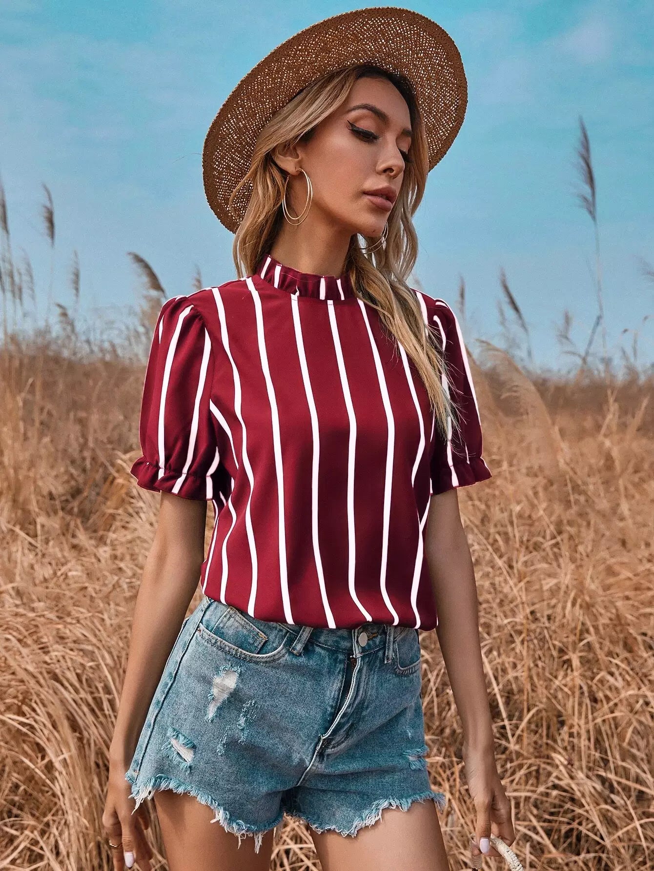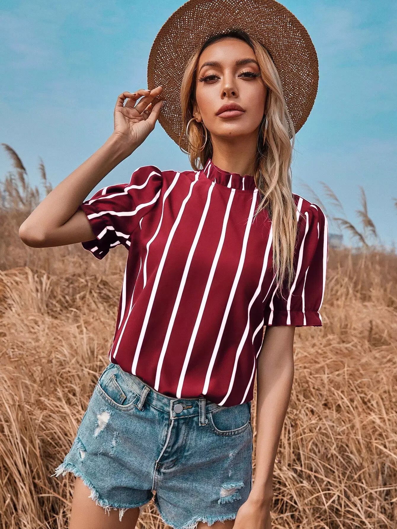 بلوزة مخططة بياقة قائمة وأكمام مكشكشة