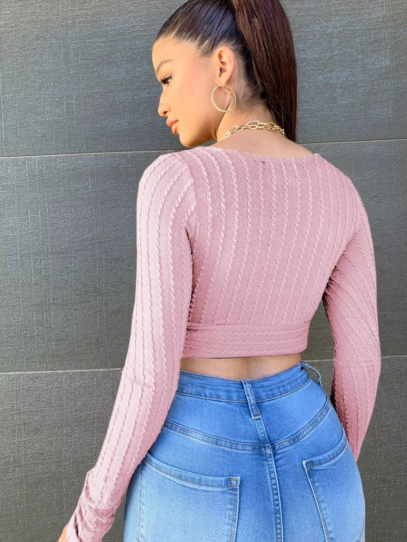 بلوزة قصيرة برقبة كبلية محبوكة بفتحة رقبة كبلية