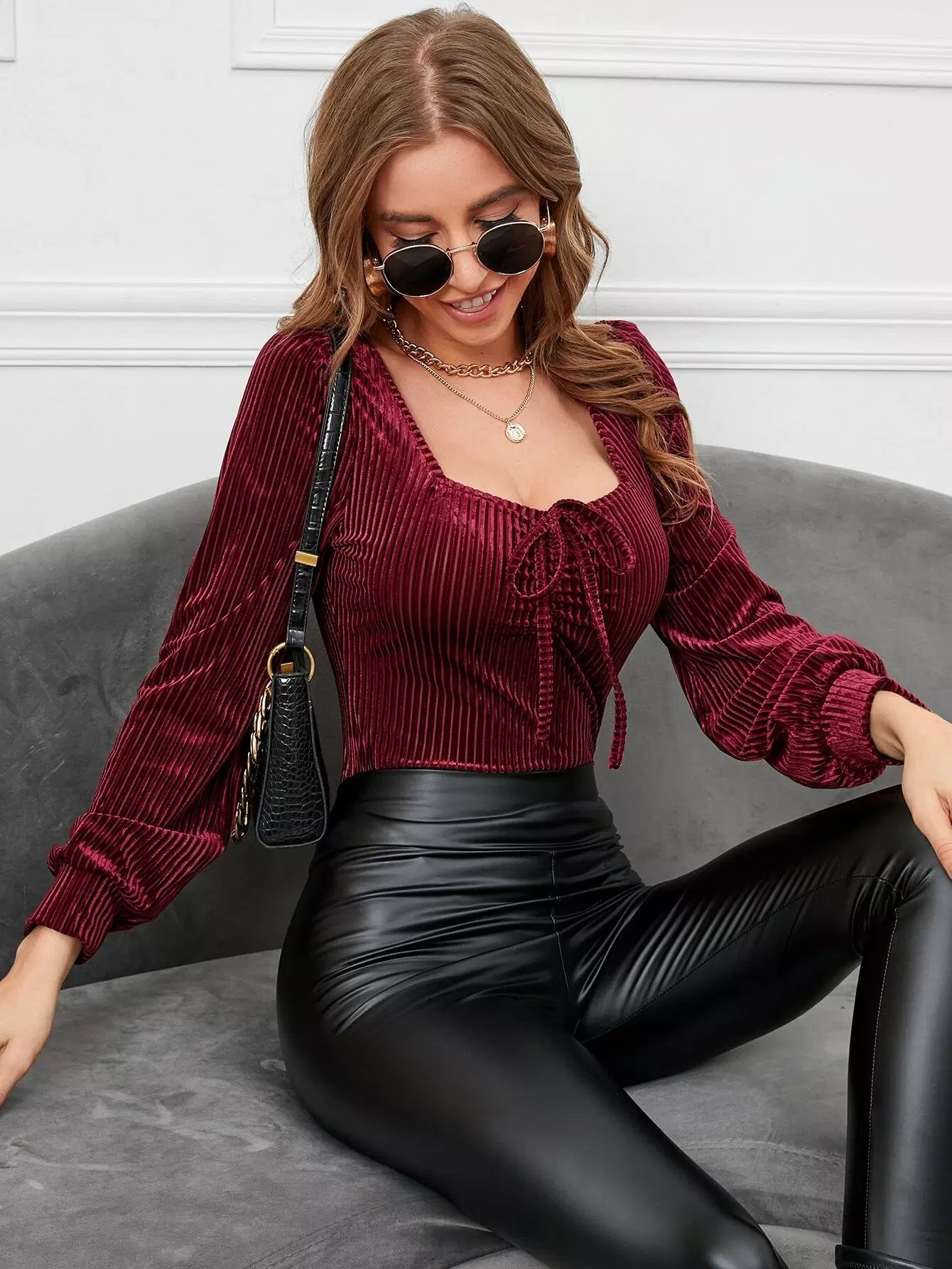 تي شيرت مخملي بياقة برقبة على شكل عقدة أمامية من الأمام