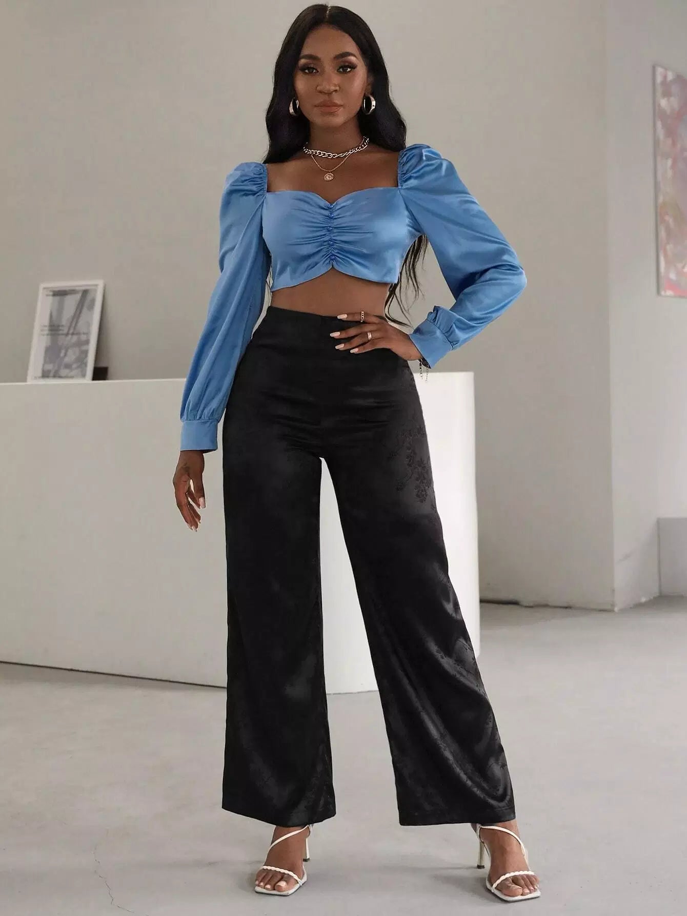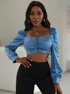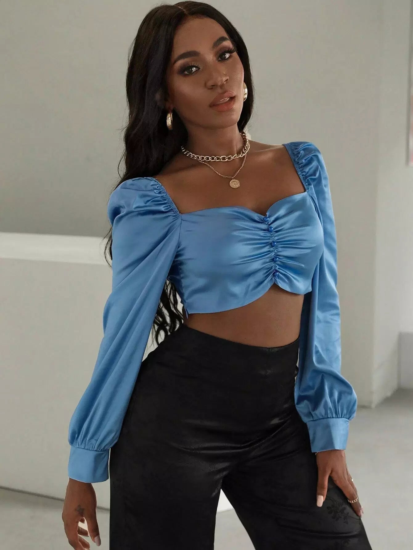 بلوزة قصيرة بأكمام بأزرار أمامية برقبة على شكل فانوس بأزرار من الأمام