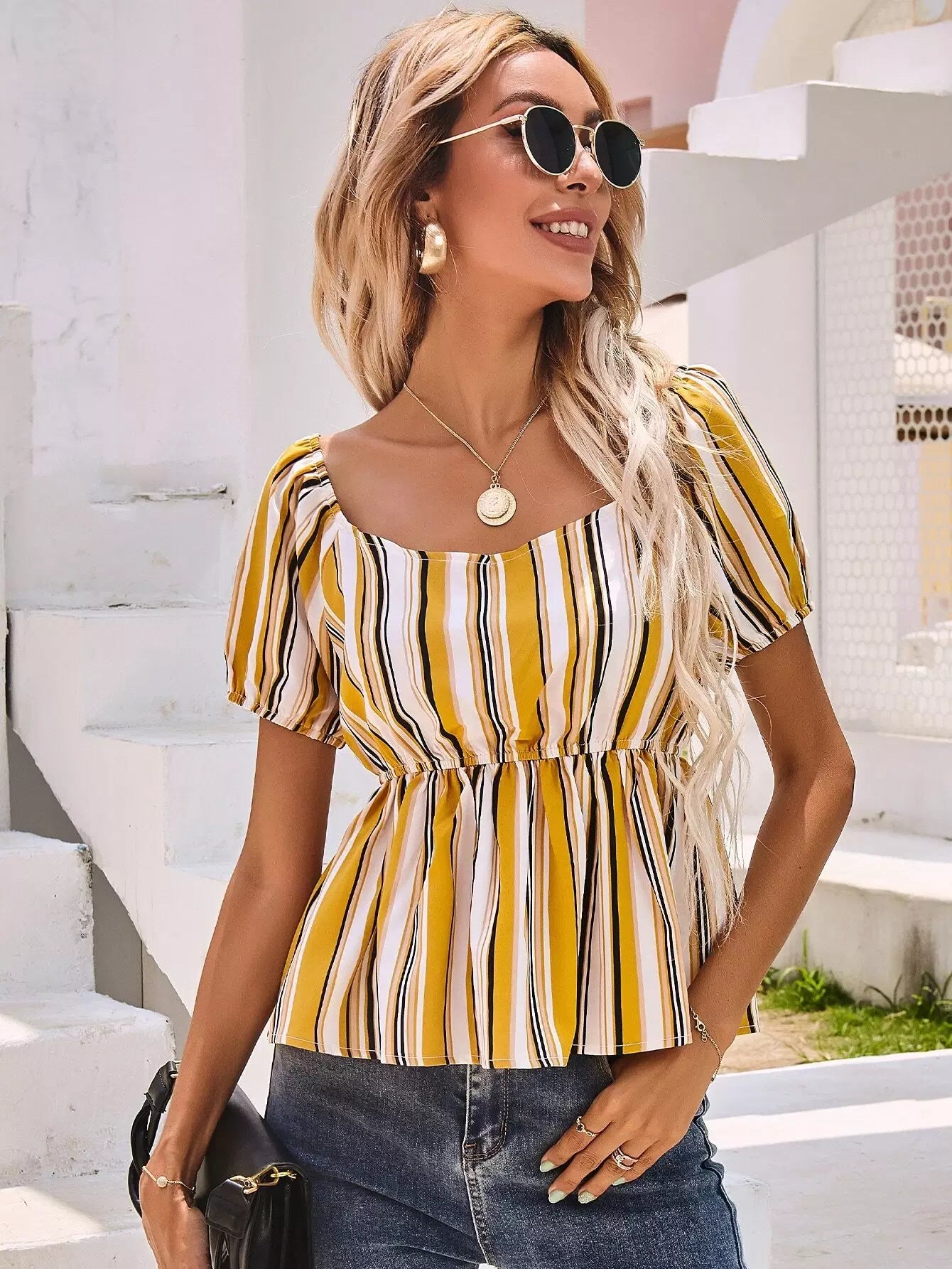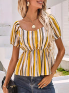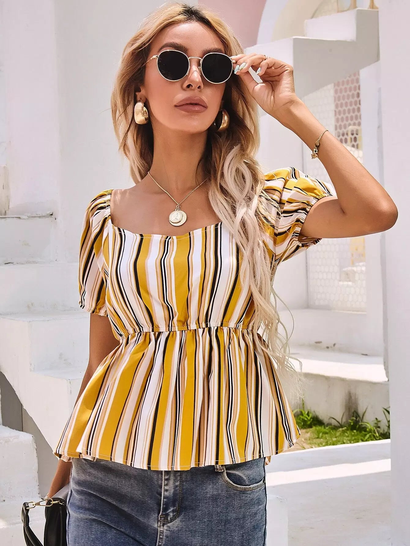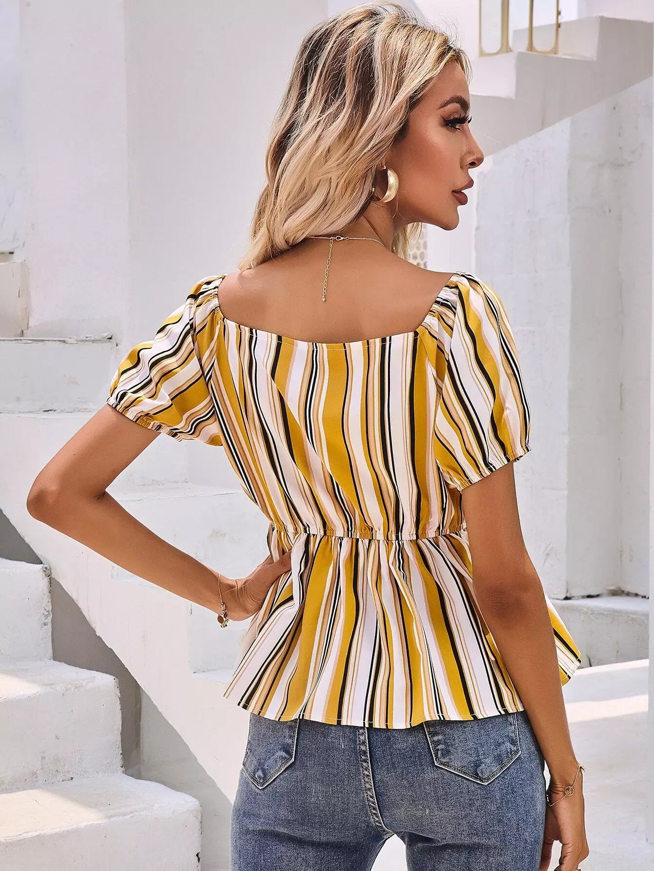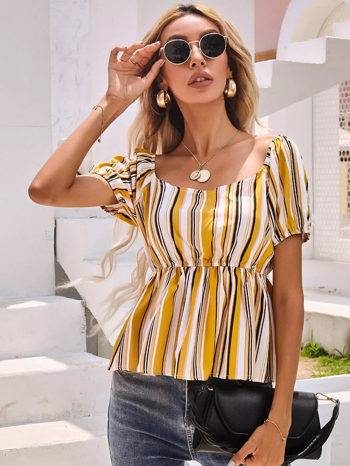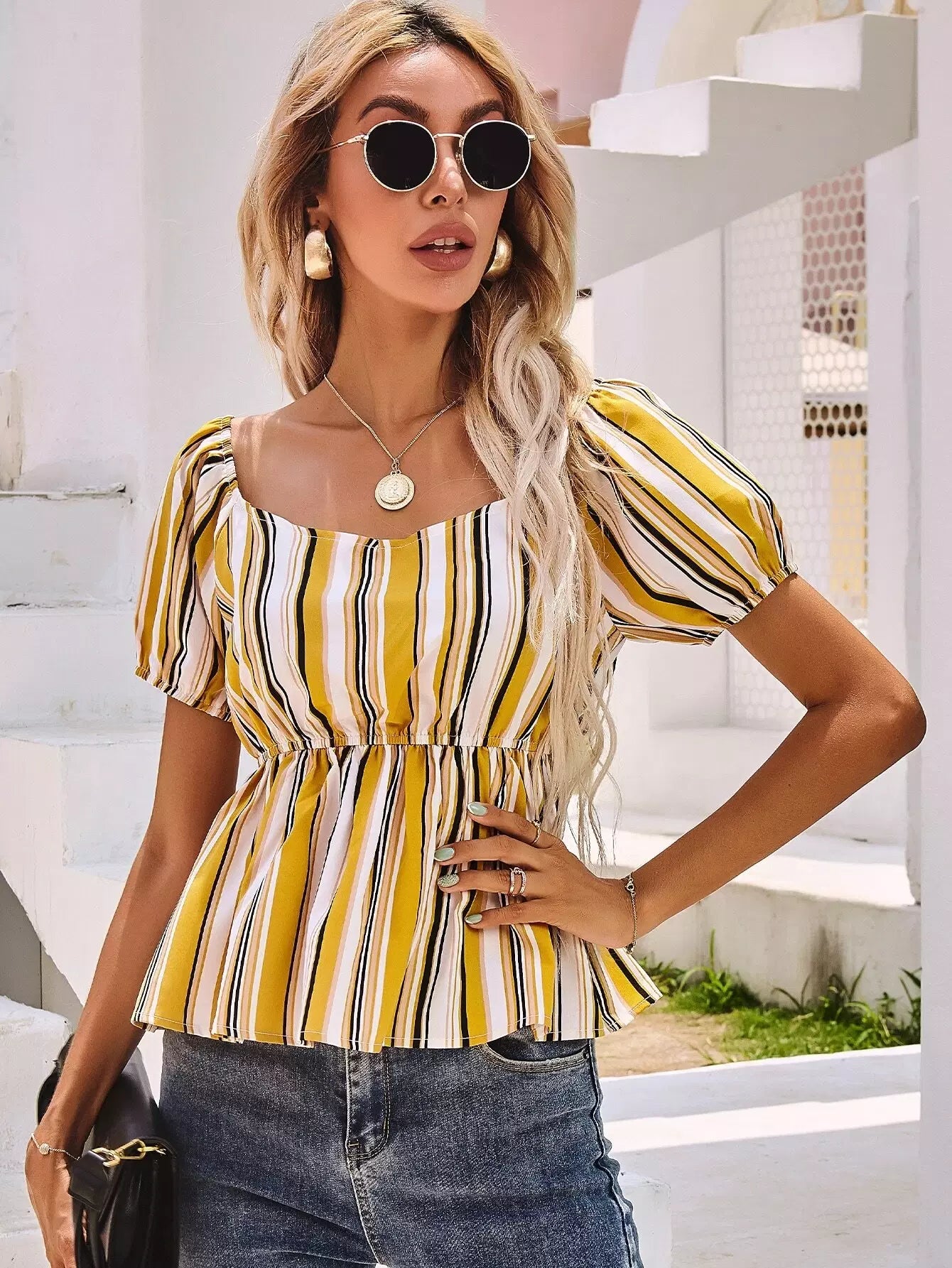 بلوزة بطبعة مخططة بأكمام منفوخة وياقة على شكل قلب