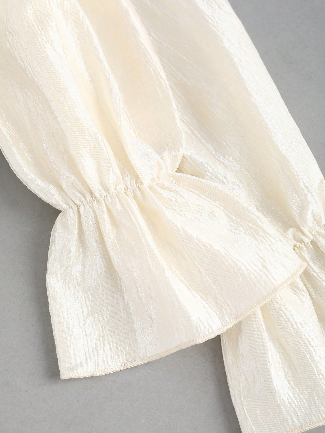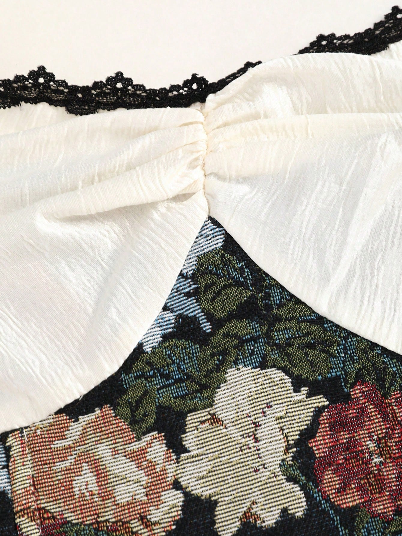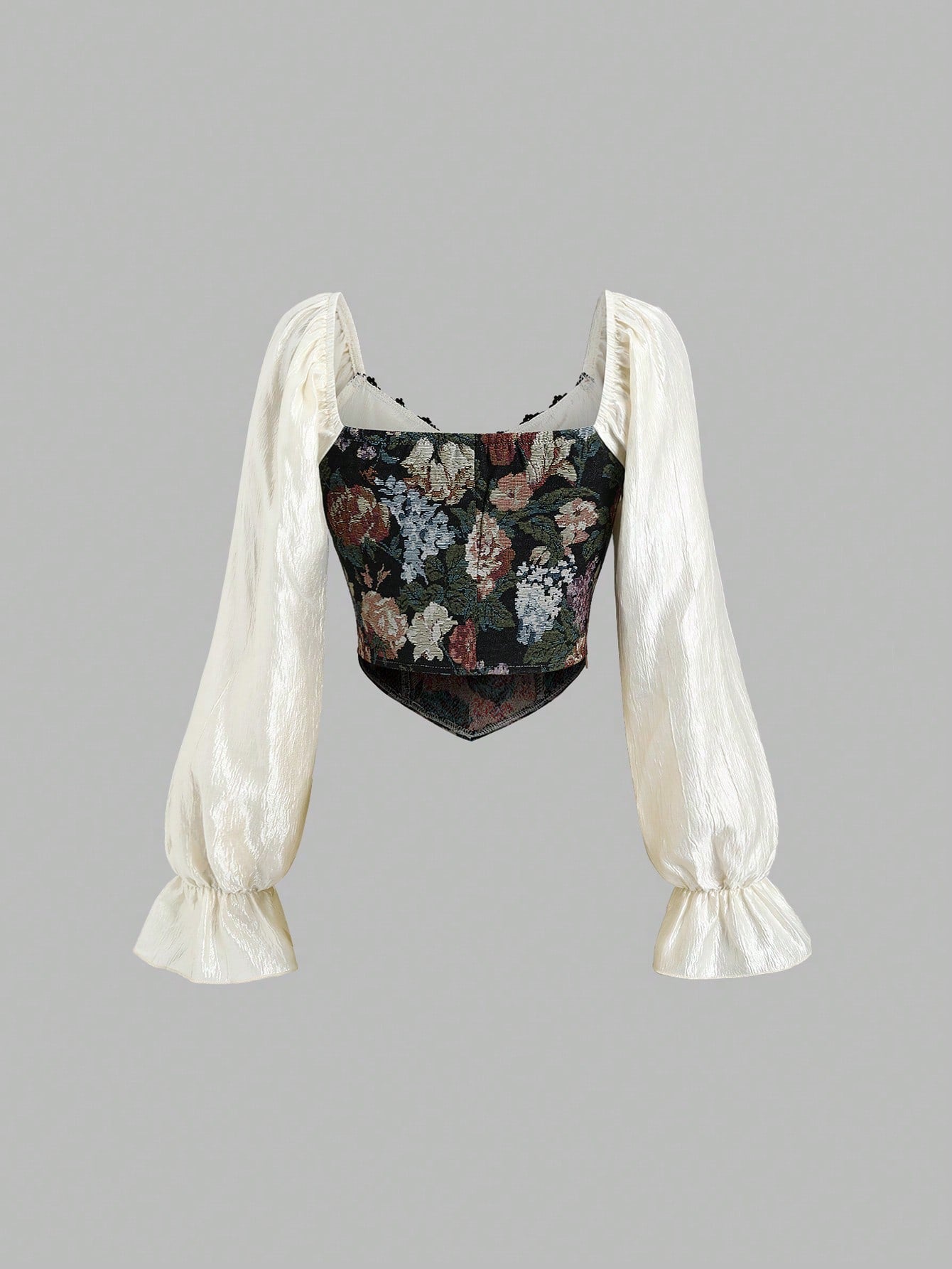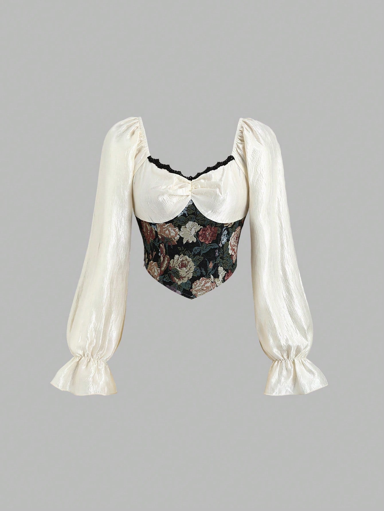 Sweetra Women Jacquard Splicing Lace Hanging Shoulder Long Sleeve Shirt, Autumn/Winter Y2K